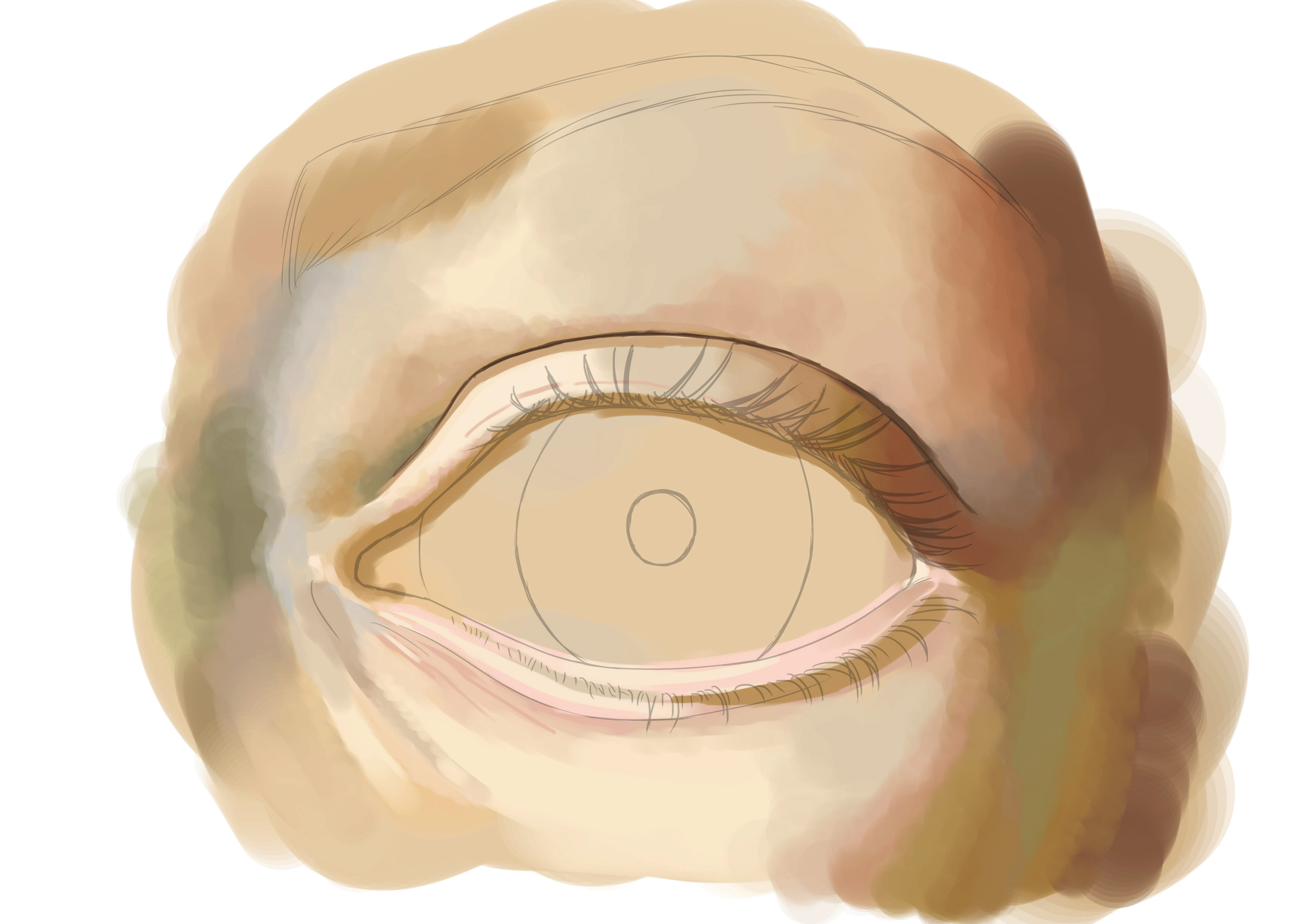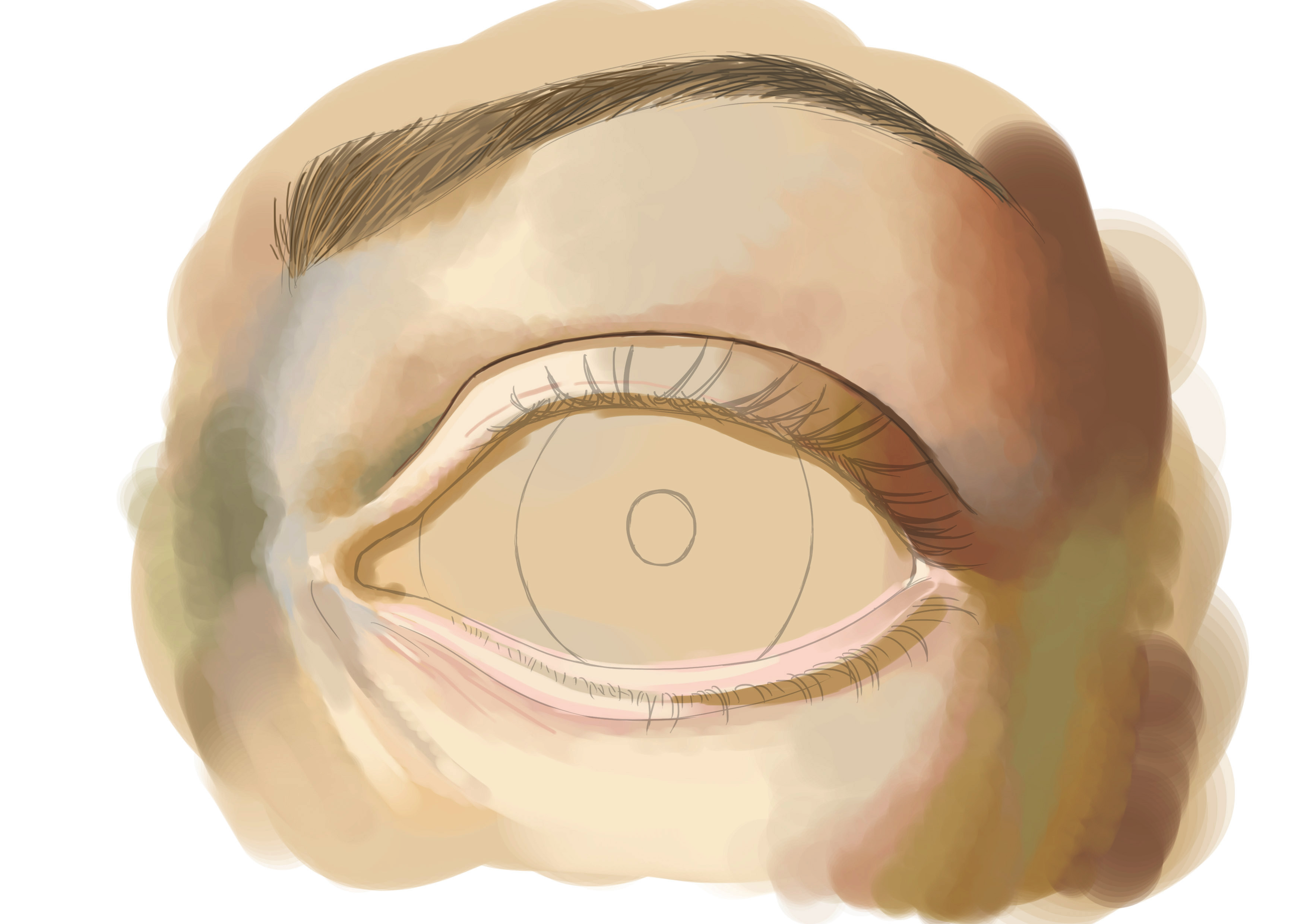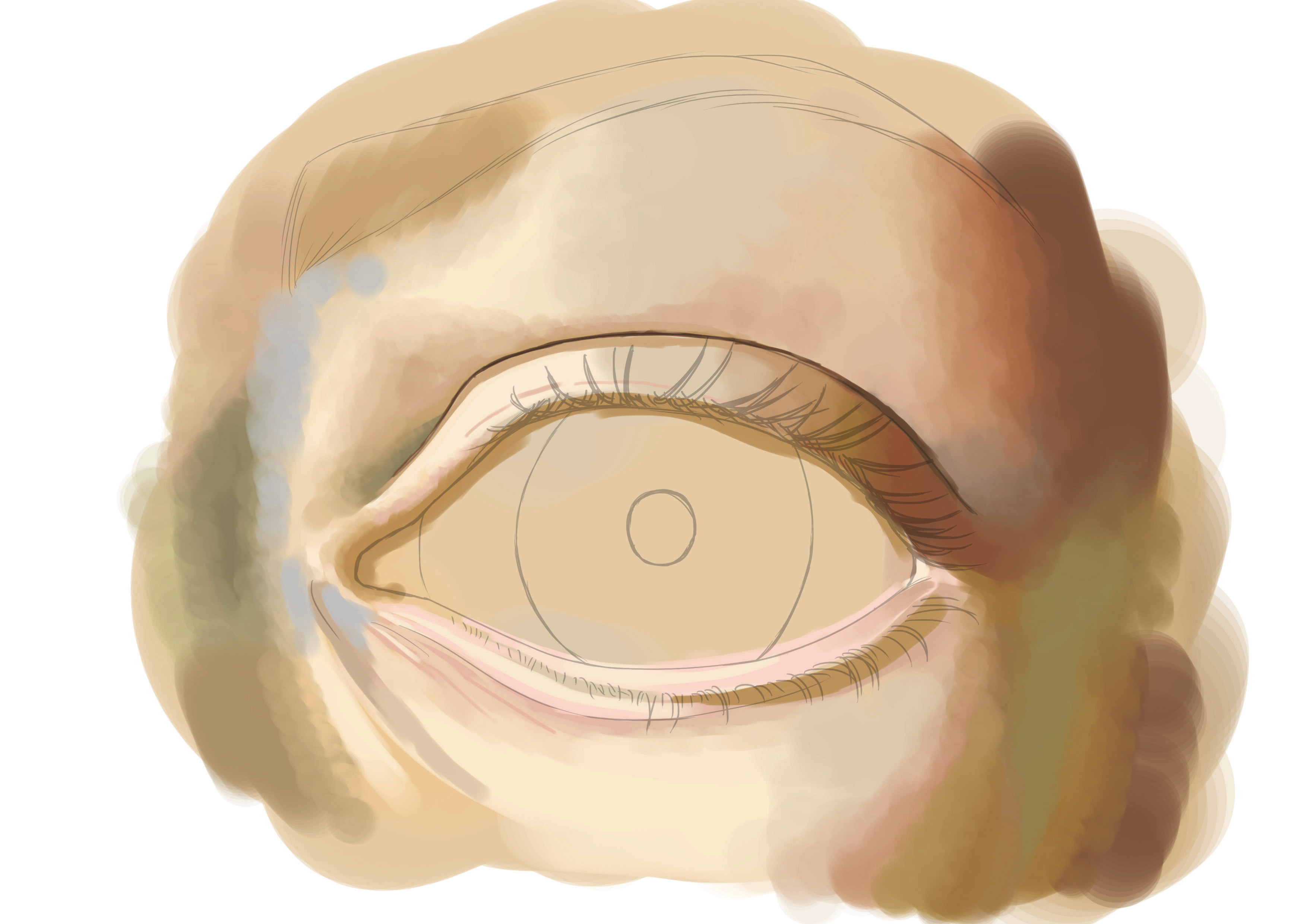 Maintenant le vif du sujet : l’œil ! On va prendre une teinte claire et plutôt grise / beige. Le globe oculaire est une sphère cela signifie qu’il va prendre la lumière sur la partie la plus bombée et que les ombres vont se positionner sur ses bords. Il faut également prendre en compte l’ombre portée de la paupière mobile. J’ajoute donc des teintes plus sombres tirant vers le brun / jaune et le gris pour les ombres.