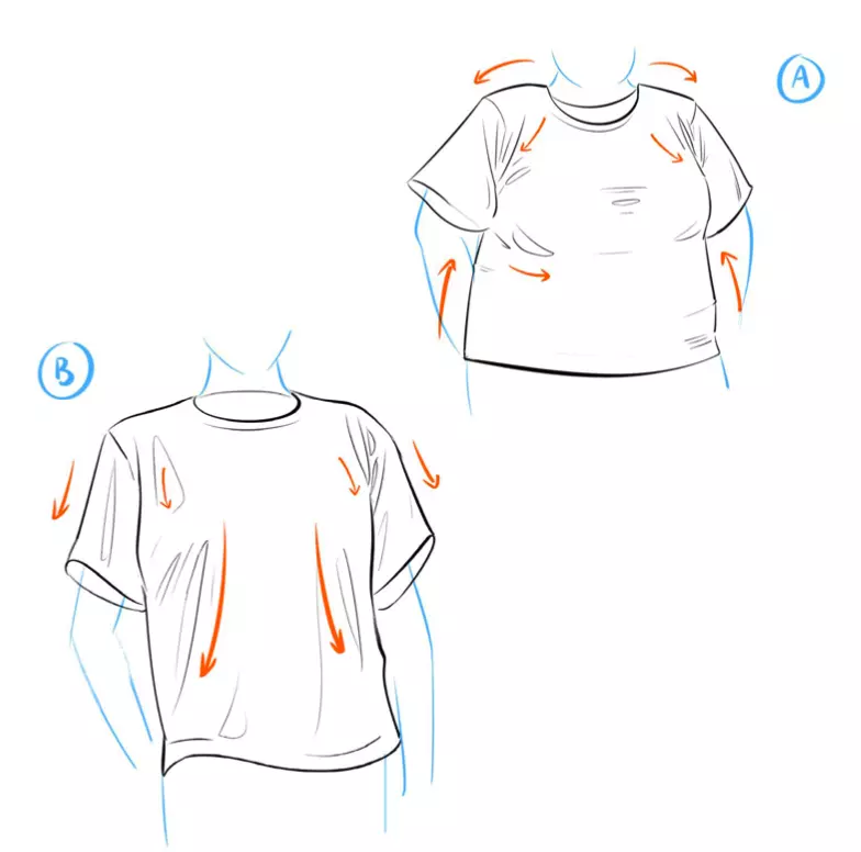 2/ En me basant sur mes traits de construction (ou sur votre propre personnage), j’ajuste le t-shirt aux formes. Le bas du t-shirt est une ligne courbe, lus tendue pour le dessin A et plus fluide pour le B car il est moins collé au corps. Les épaules peuvent aussi paraître plus arrondies sur le dessin A.
