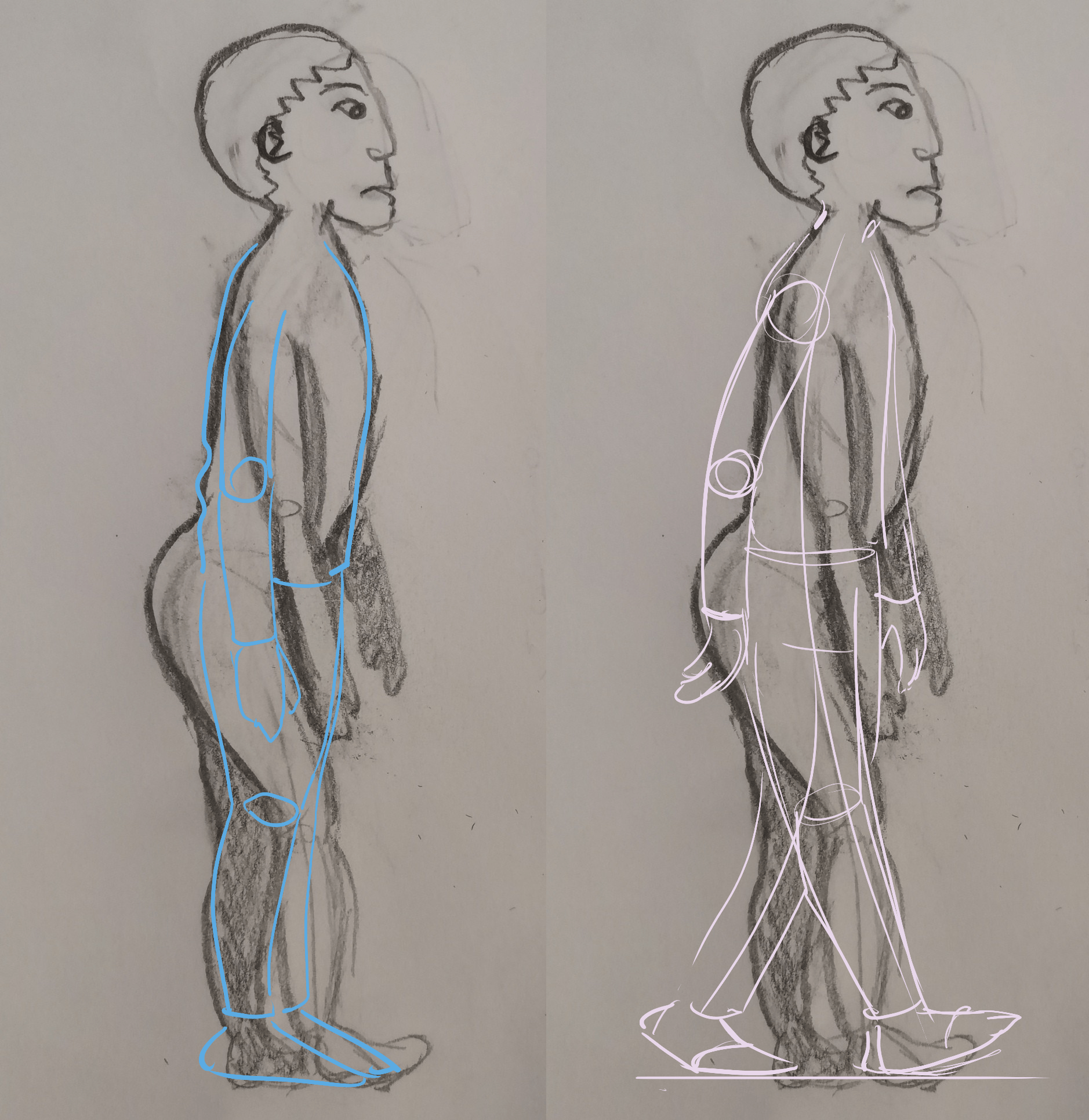 Ici, j'ai du mal à saisir la posture du personnage : est-il neutre ou en train de marcher ? Voici un petit corrigé pour une position neutre et une posture de marche. J'espère que ça vous aiguillera pour la suite !
