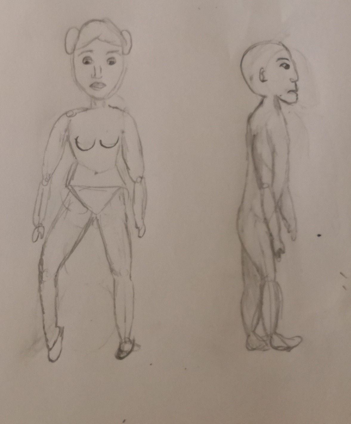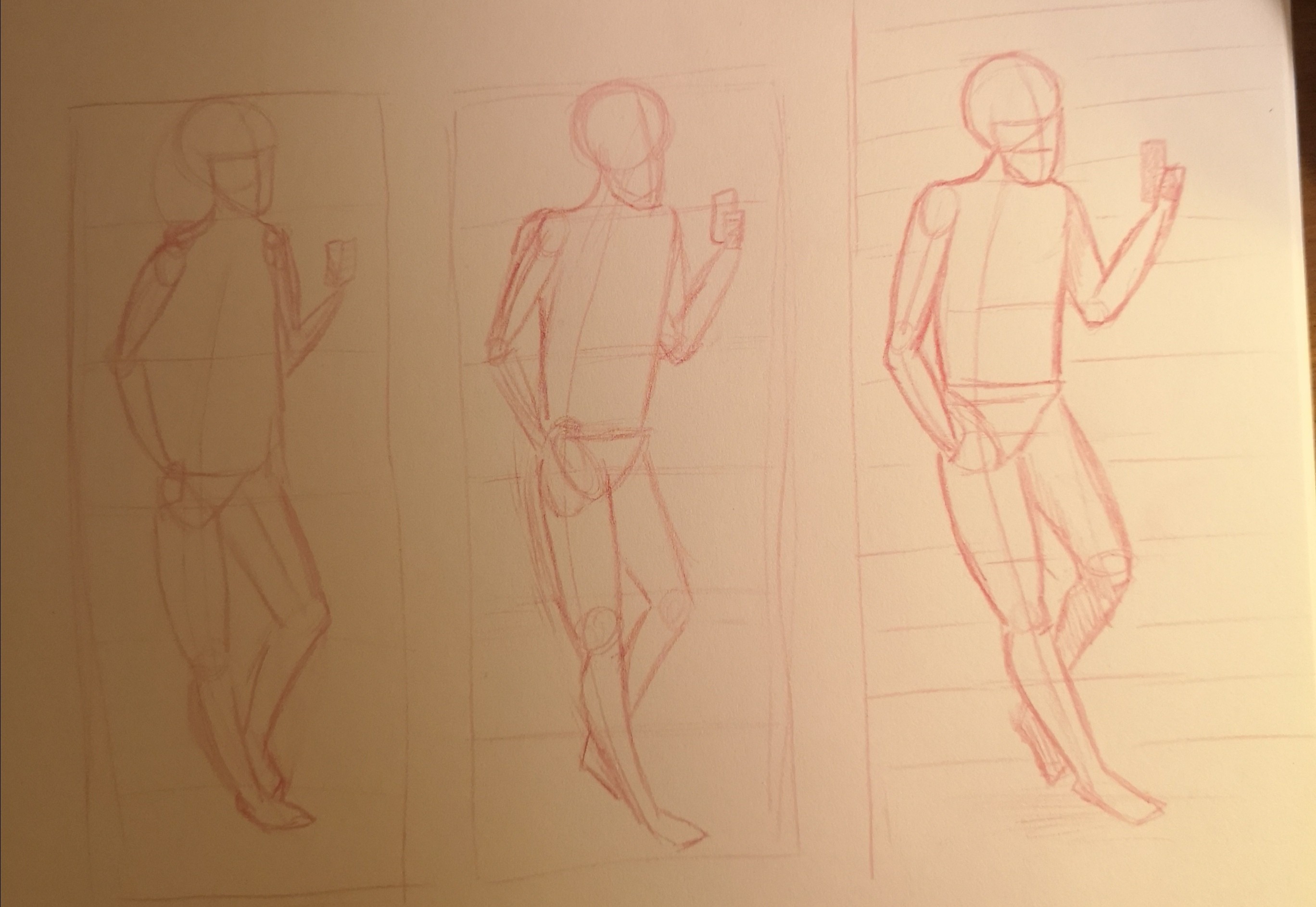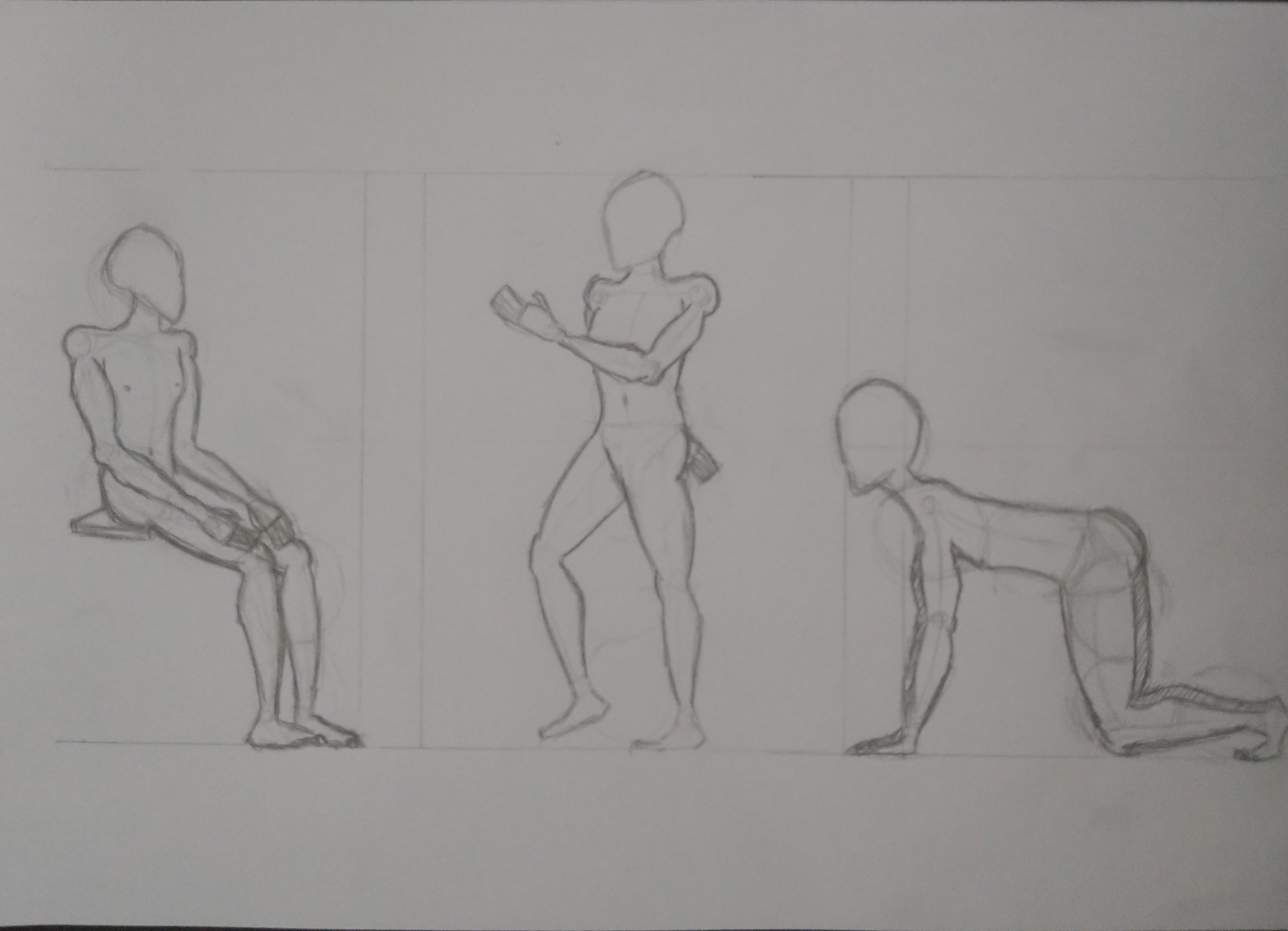 La posture de gauche s'annonce bien ! Pour la posture de droite, attention aux proportions : le personnage a les jambes un peu petites, comparées au haut du corps. Il faudra peut-être rééquilibrer la chose !