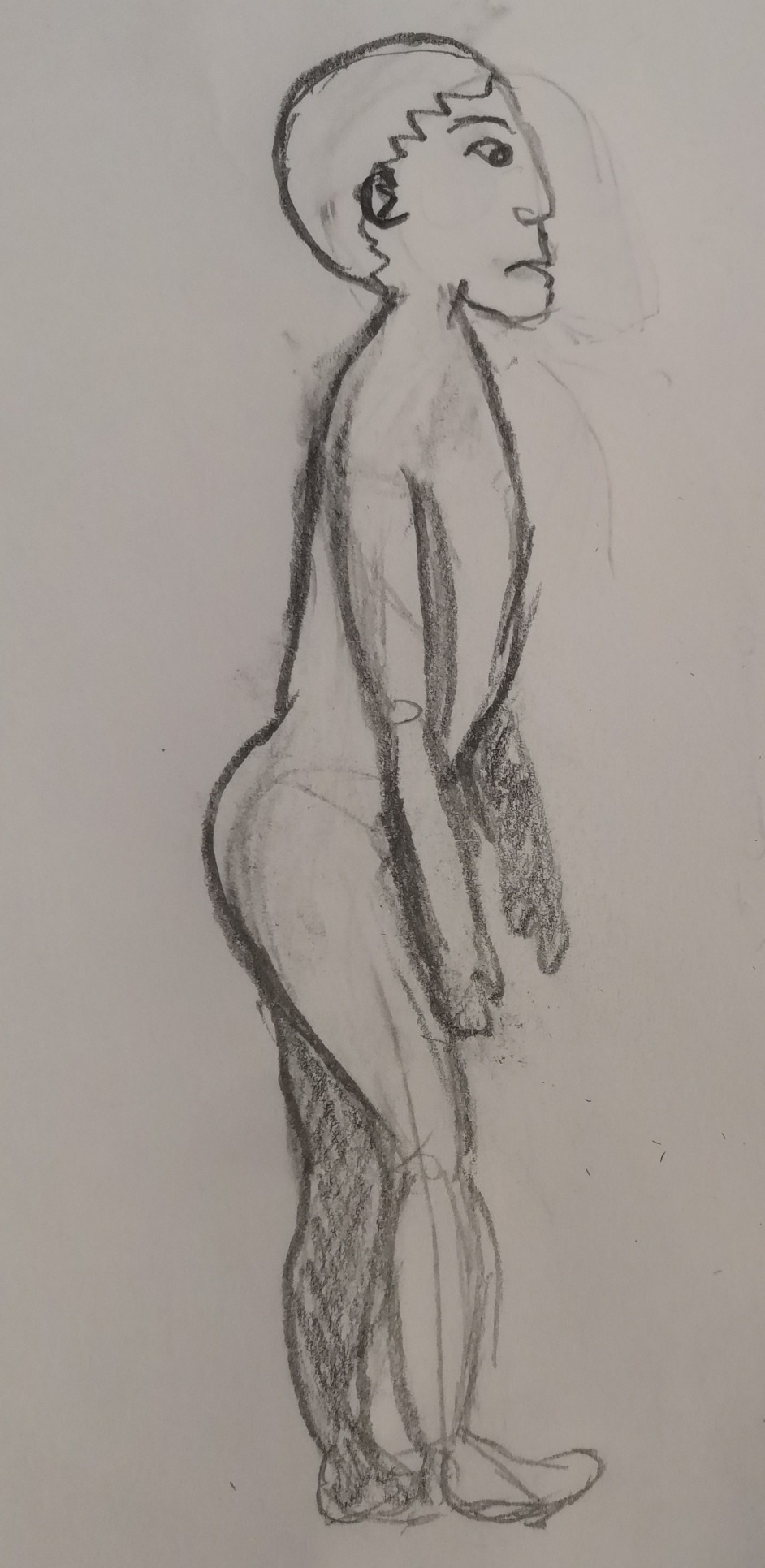 Attention également aux épaules, qui sont relevées sur vos croquis. Sur un corps détendu et debout, les épaules sont tirées vert le bas (même avec une musculature développées comme pour votre personnages). Je vous suggère donc de légèrement abaisser la courbe des épaules pour éviter cet effet de haussement.