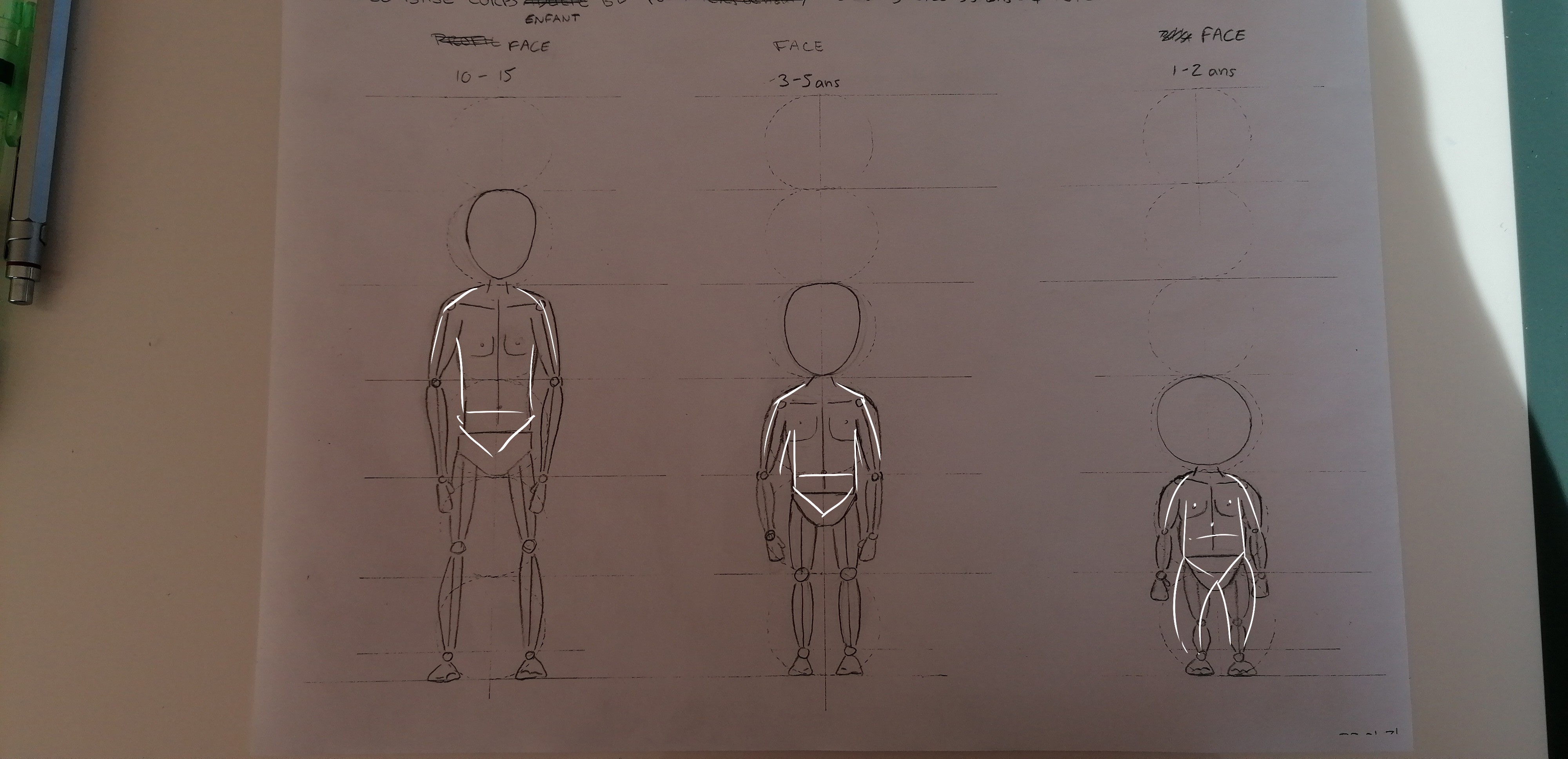 Les épaules sont un peu larges sur ces trois exemples ! Elles peuvent être un peu plus relâchées également. Le bassin devrait être légèrement relevé (le milieu du bassin correspond au milieu du personnage). Les enfants ont également un corps moins "sculpté", avec moins de traits marqués, en général. Voici quelques corrections en image.