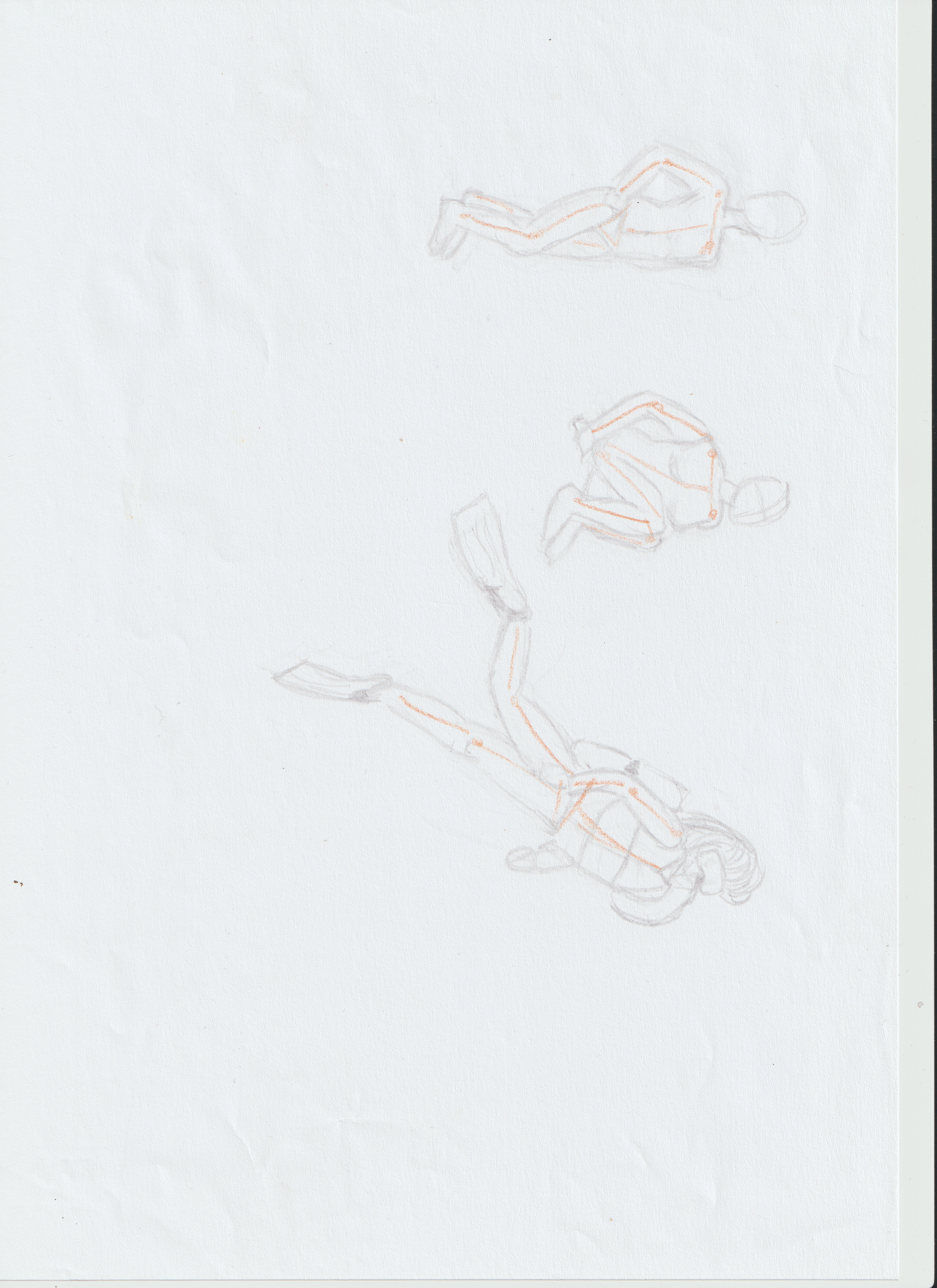 les deux premiers sont bien pensés et réalisés, c'est surtout le troisième personnage qui pose problème : ce genre de position n'est pas vraiment naturelle. Quand on plonge, on s'accroupit avant de se lancer horizontalement (ou verticalement si le plongeoir est haut). À moins que le personnage n'arrive en courant ? Dans ce cas, il faut décomposer le mouvement davantage avec par exemple les bras en arrière, qui amorcent le mouvement de balancier pour plonger. Ou au contraire, le personnage déjà lancé en avant à la fin de la course. Là, on a l'impression d'un entre-deux un peu statique où l'on ne distingue pas s'il saute depuis un point fixe ou s'il court avant de plonger.