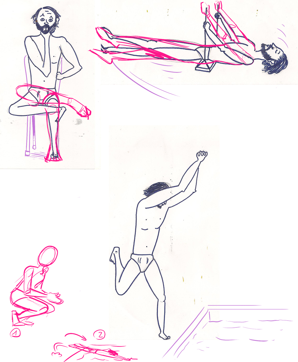 Das heißt, ich biete Ihnen einige Korrekturen für diese Haltungen an. In Purple fügte ich einige Kontextelemente (Stuhl, Schwungbewegung, Poolkante ...) und in Pink hinzu, einige Spuren für Proportionen, Anatomie und Bewegung.