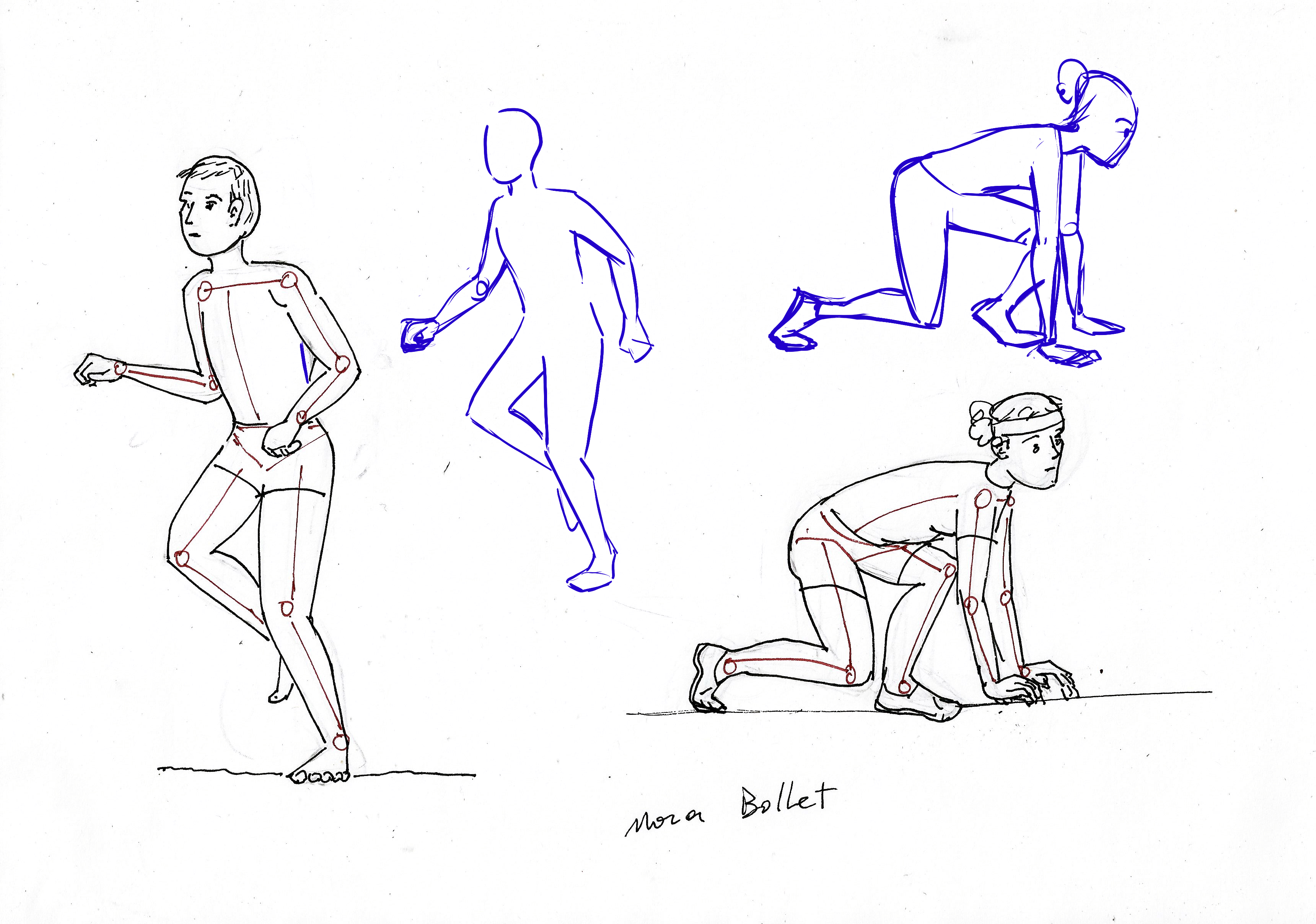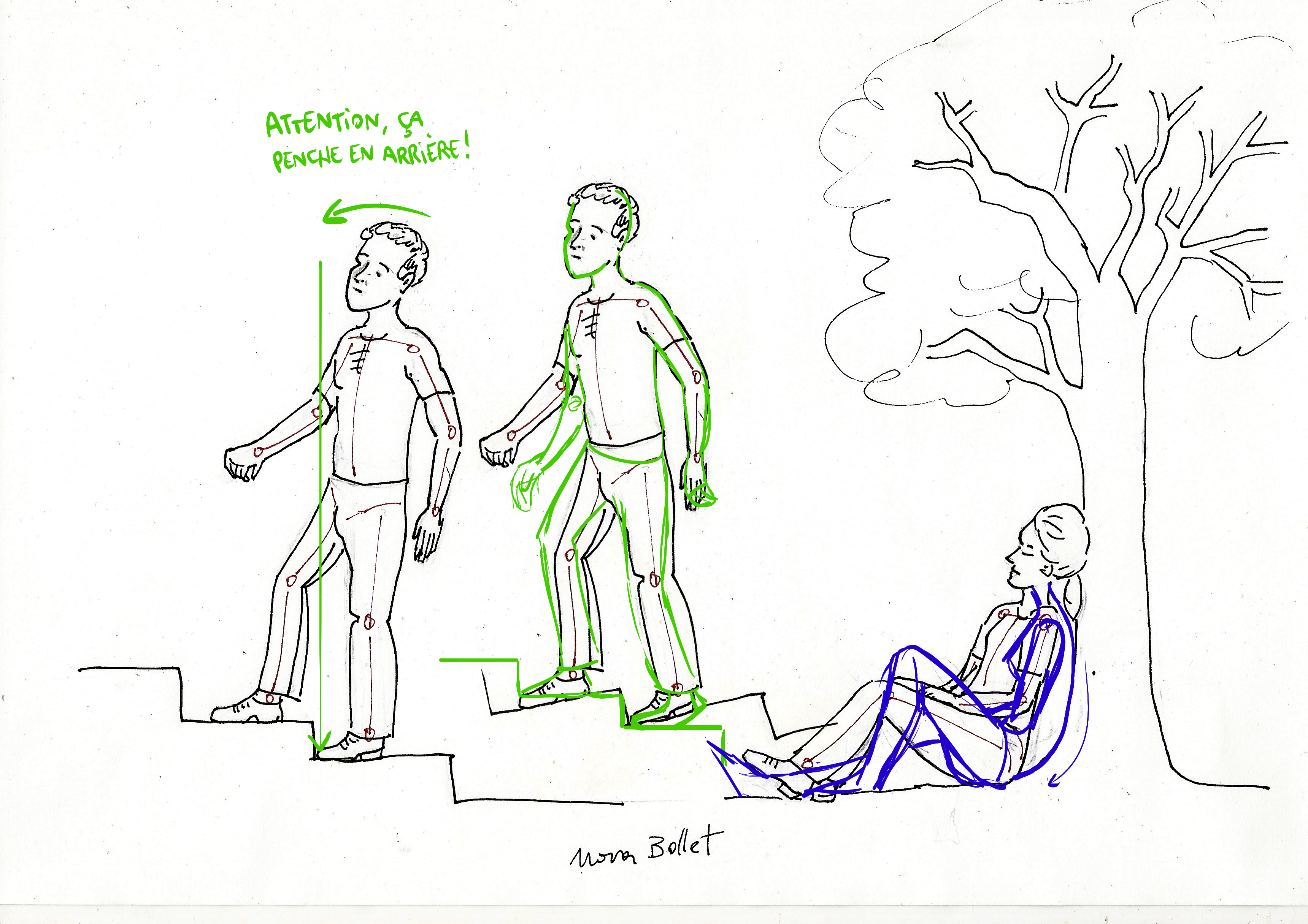 Attention au centre de gravité des personnages. S'ils penchent trop en avant ou en arrière, ils donnent l'impression de basculer. Il faut toujours regarder si le personnage est équilibré physiquement.