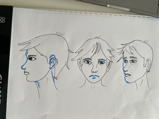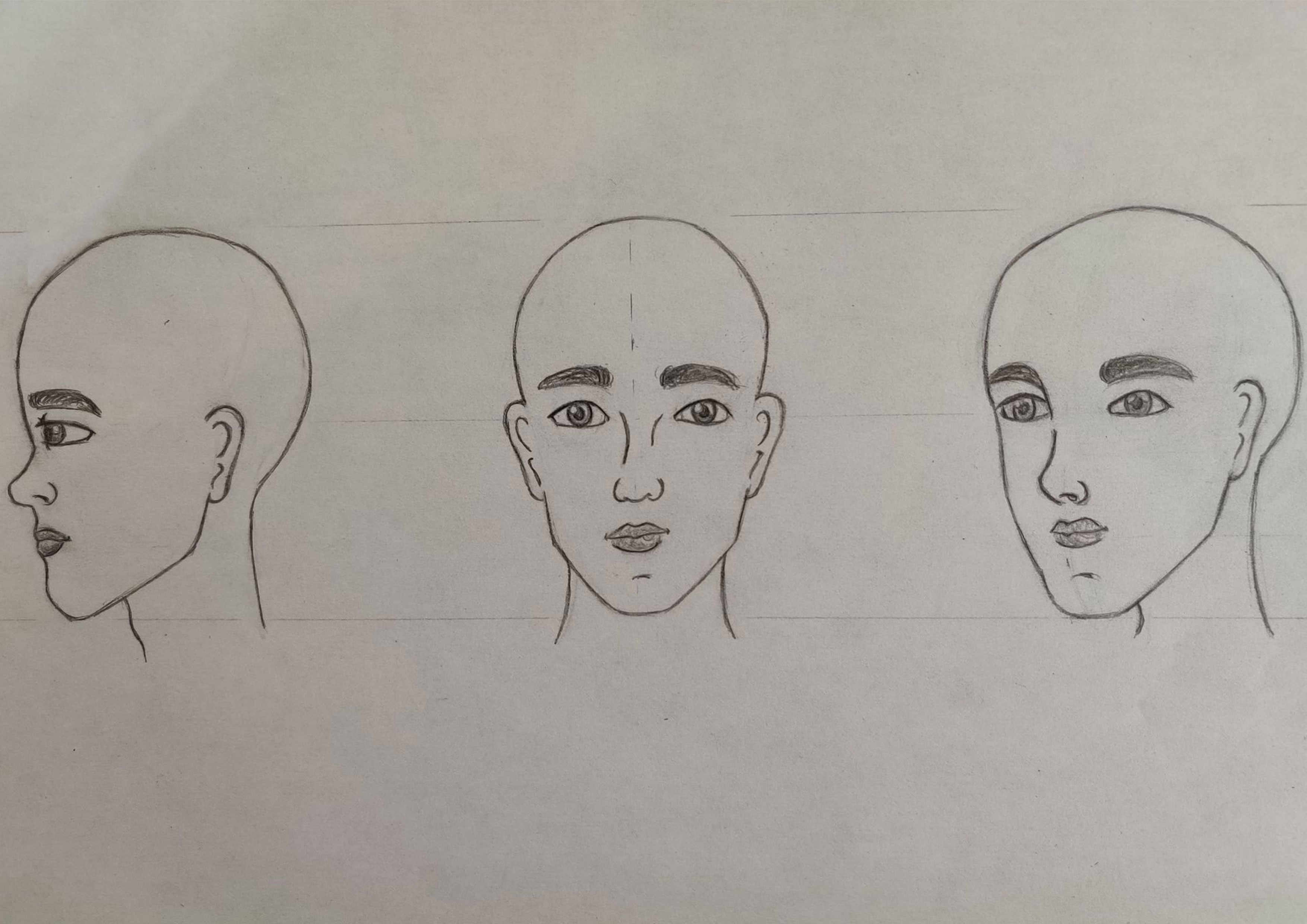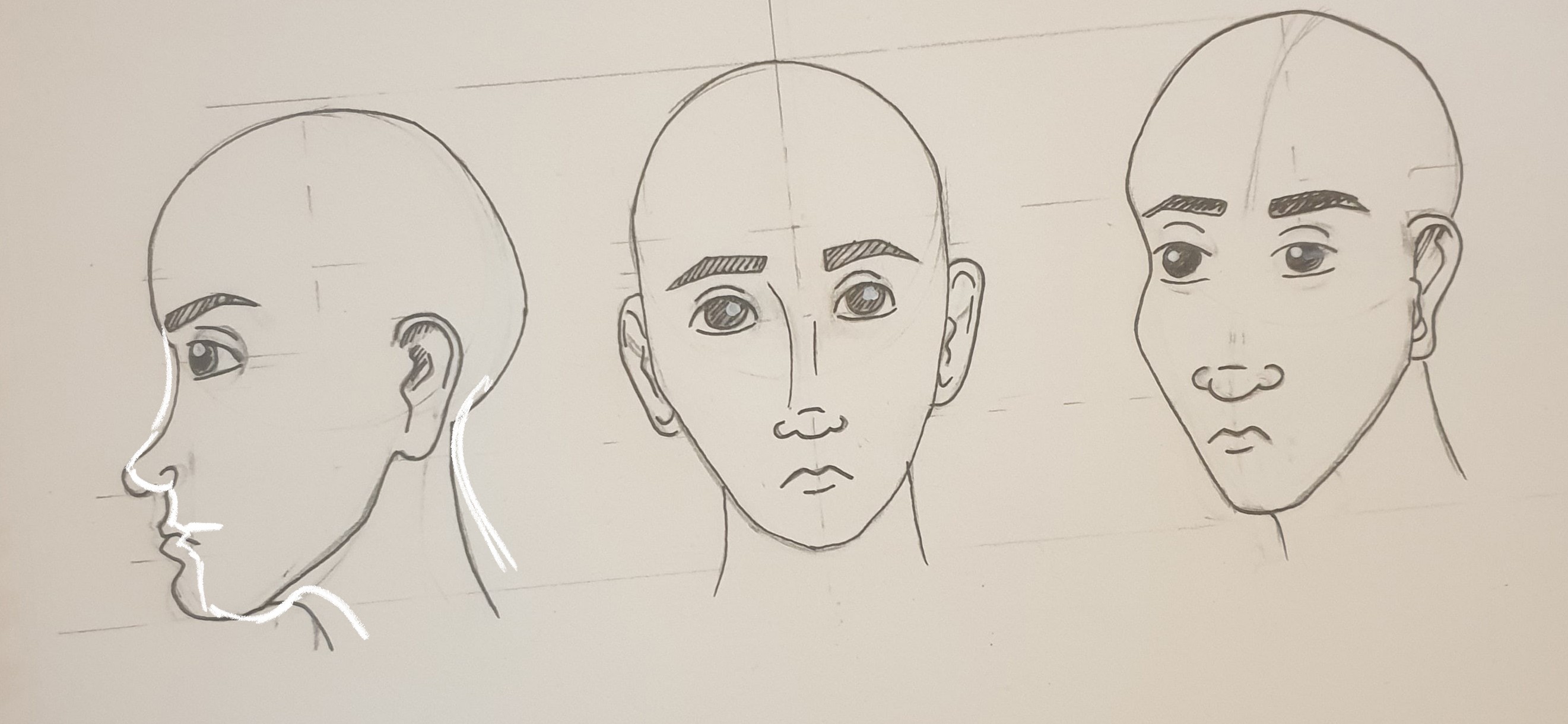 Es ist ein guter Anfang! Seien Sie vorsichtig, wenn die Augen auf dem drei -viertel -Gesicht abweichen: Das linke Auge des Charakters (so rechts) sollte auf der Zeichnung etwas weiter links links sein, da sich der Kopf dreht.