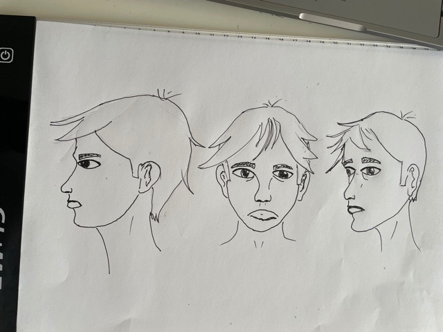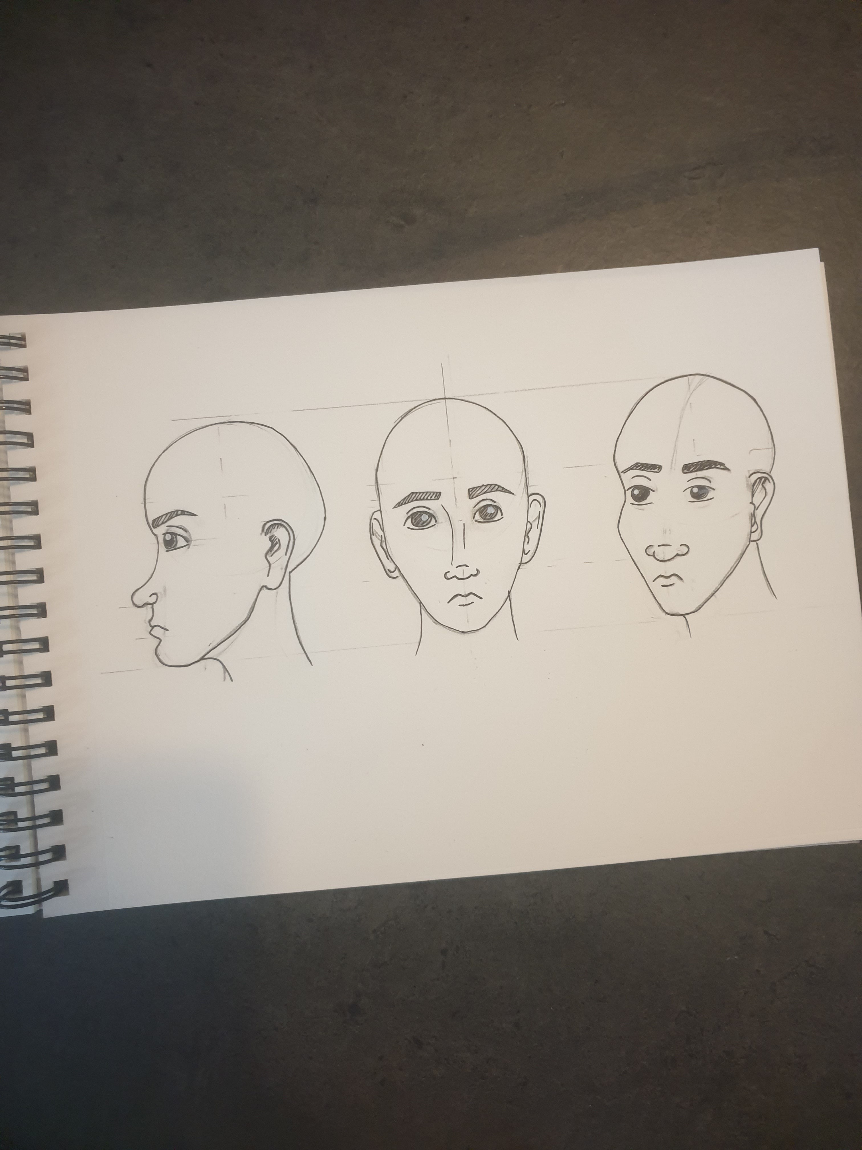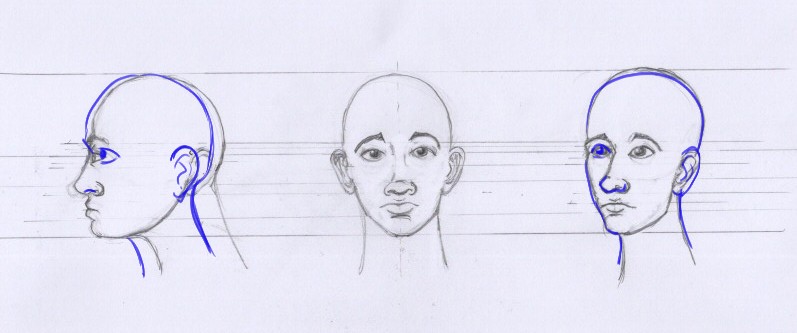 c'est un bon début ! Attention à l'écart des yeux sur le visage de trois quart : l’œil gauche du personnage (donc à notre droite) devrait être légèrement plus à gauche sur le dessin, puisque la tête se tourne.