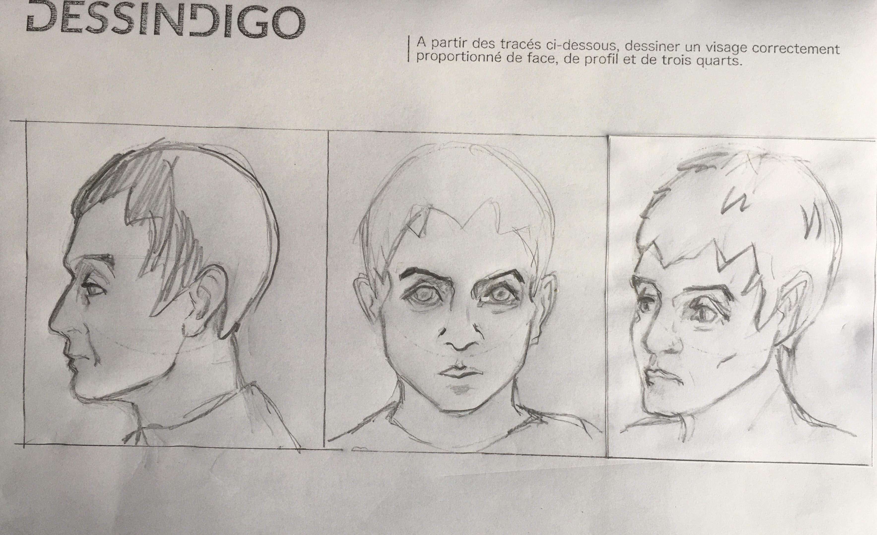 ça prend forme, petit à petit ! Le visage de trois quarts a peut-être le menton un peu en avant, mais rien de grave. Continue comme ça !