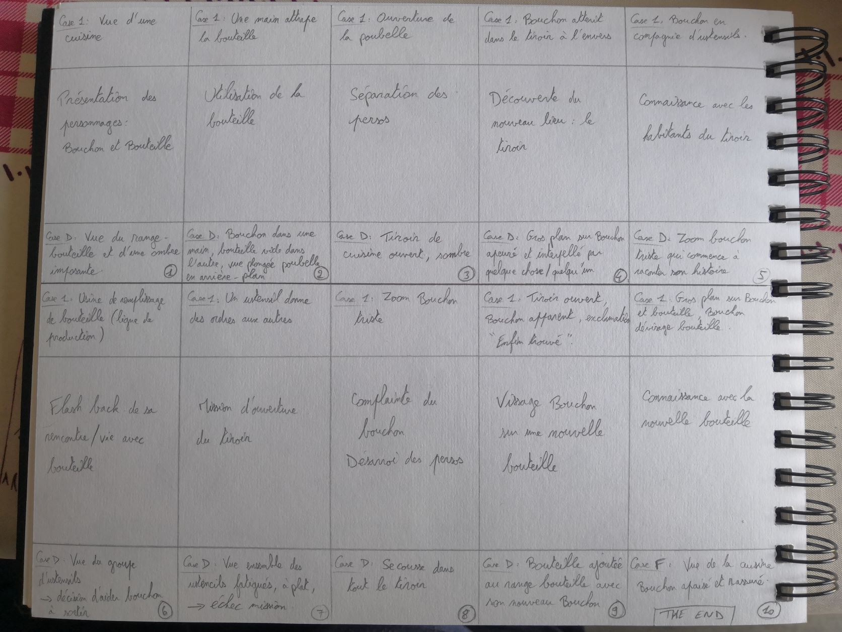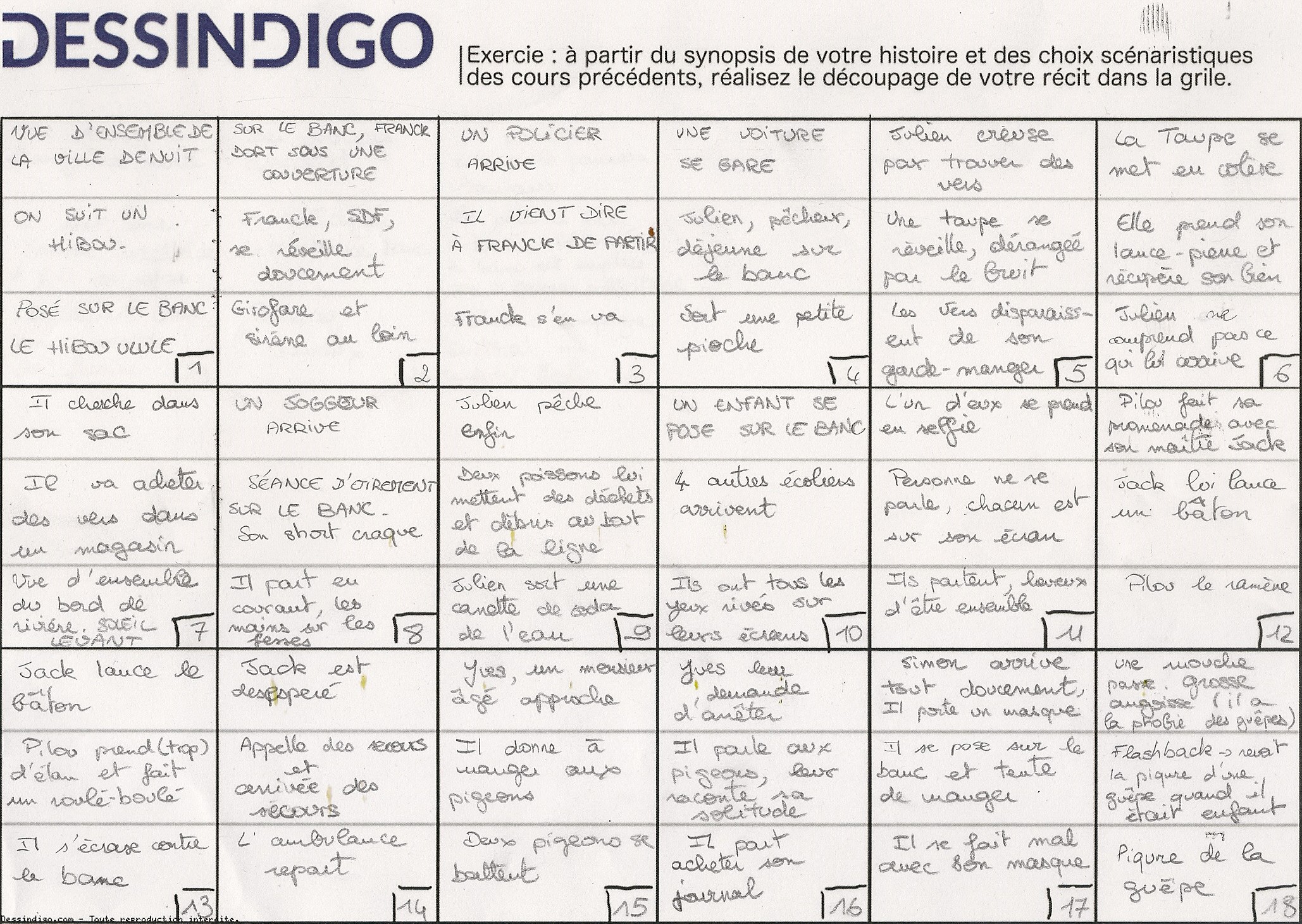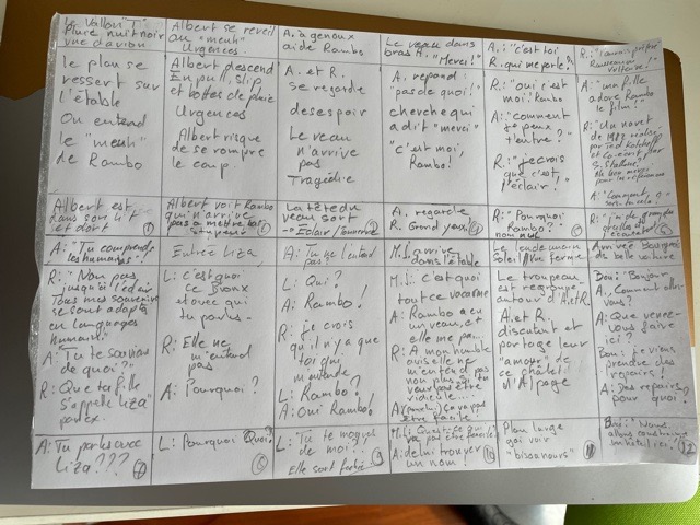 Voici mon premier découpage. J’espère que tu arriveras à me lire! Je pense éventuellement rajouter une page ou deux mais je verrais en détaillant un peu plus les scènes