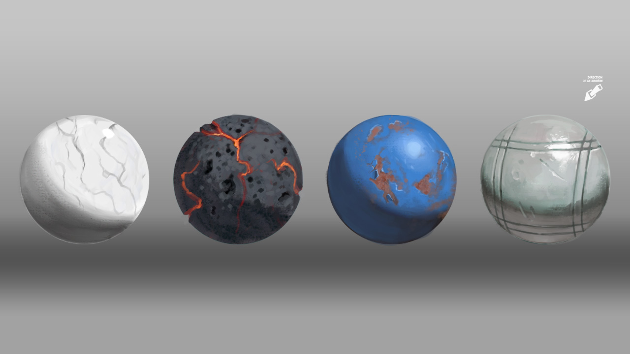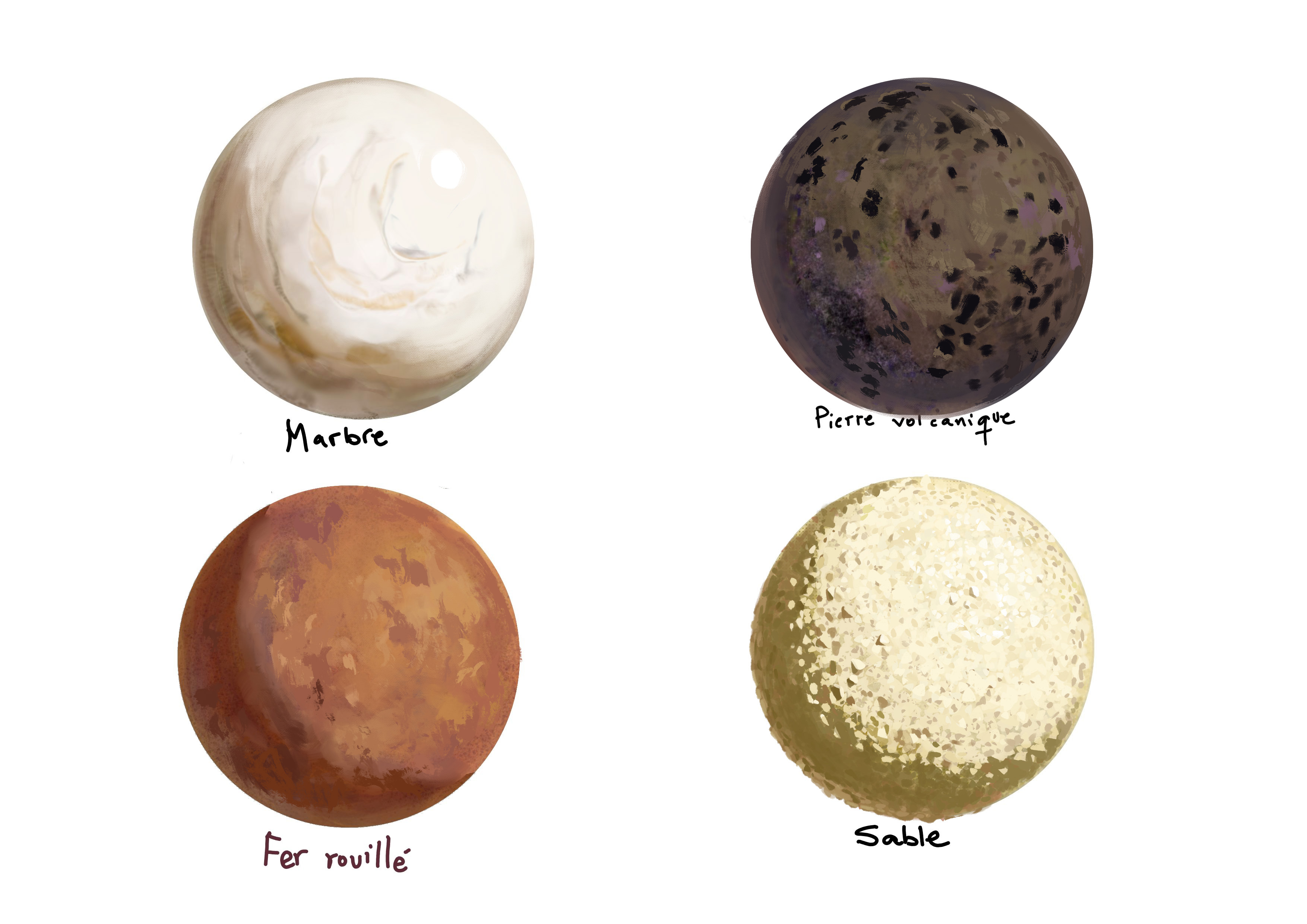 Je trouve que le rendu de tes matériaux est très chouette, tu as utilisé des brosses et des effets très différents à chaque fois;