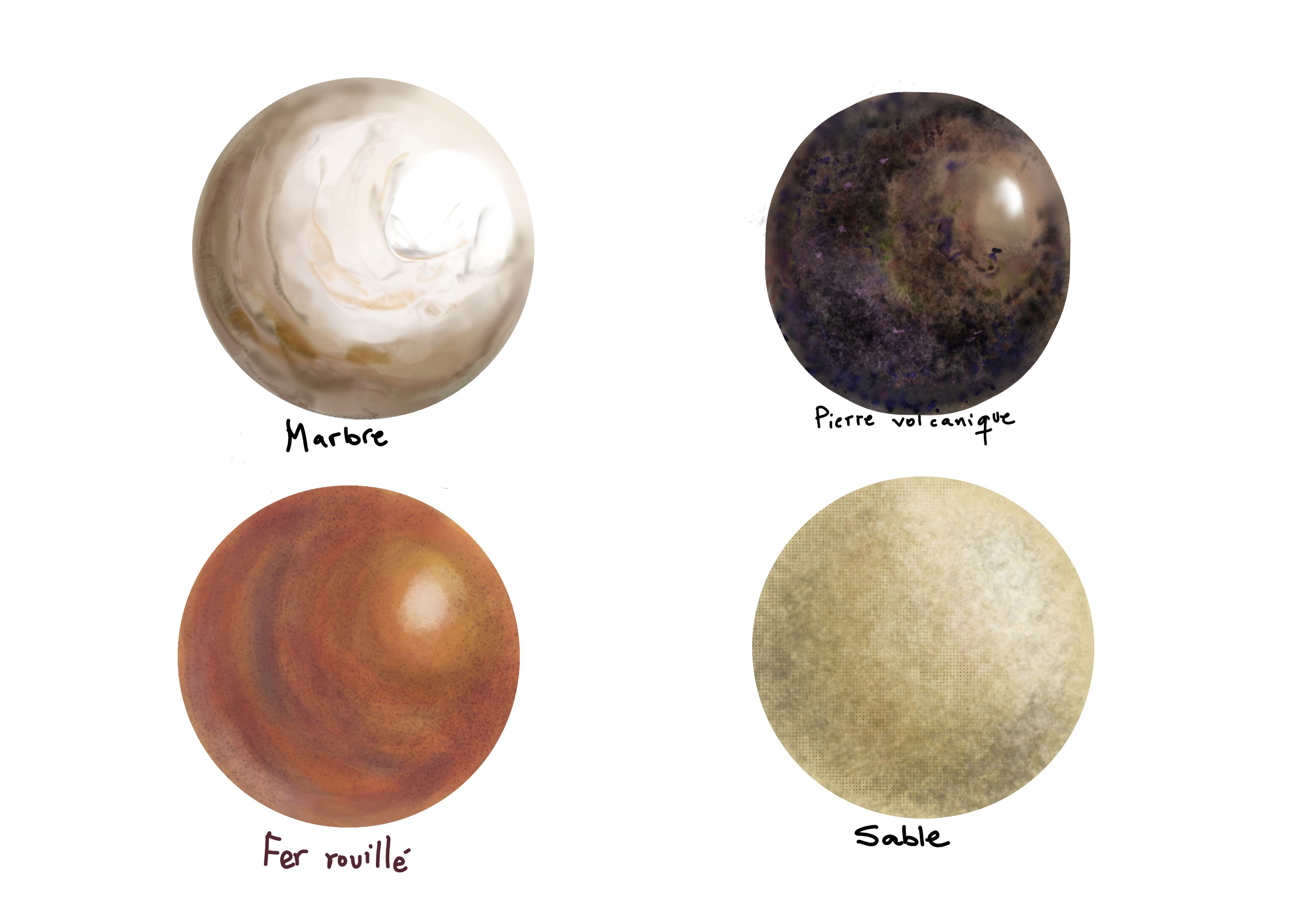 Bonsoir, voici mon travail sur le rendu des matériaux. j'ai eu en tête un marbre blanc et une pierre volcanique rouge. Quand à mon quatrième choix j'ai pensé a de l'herbe...