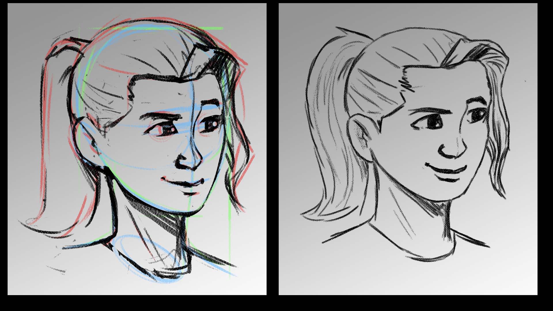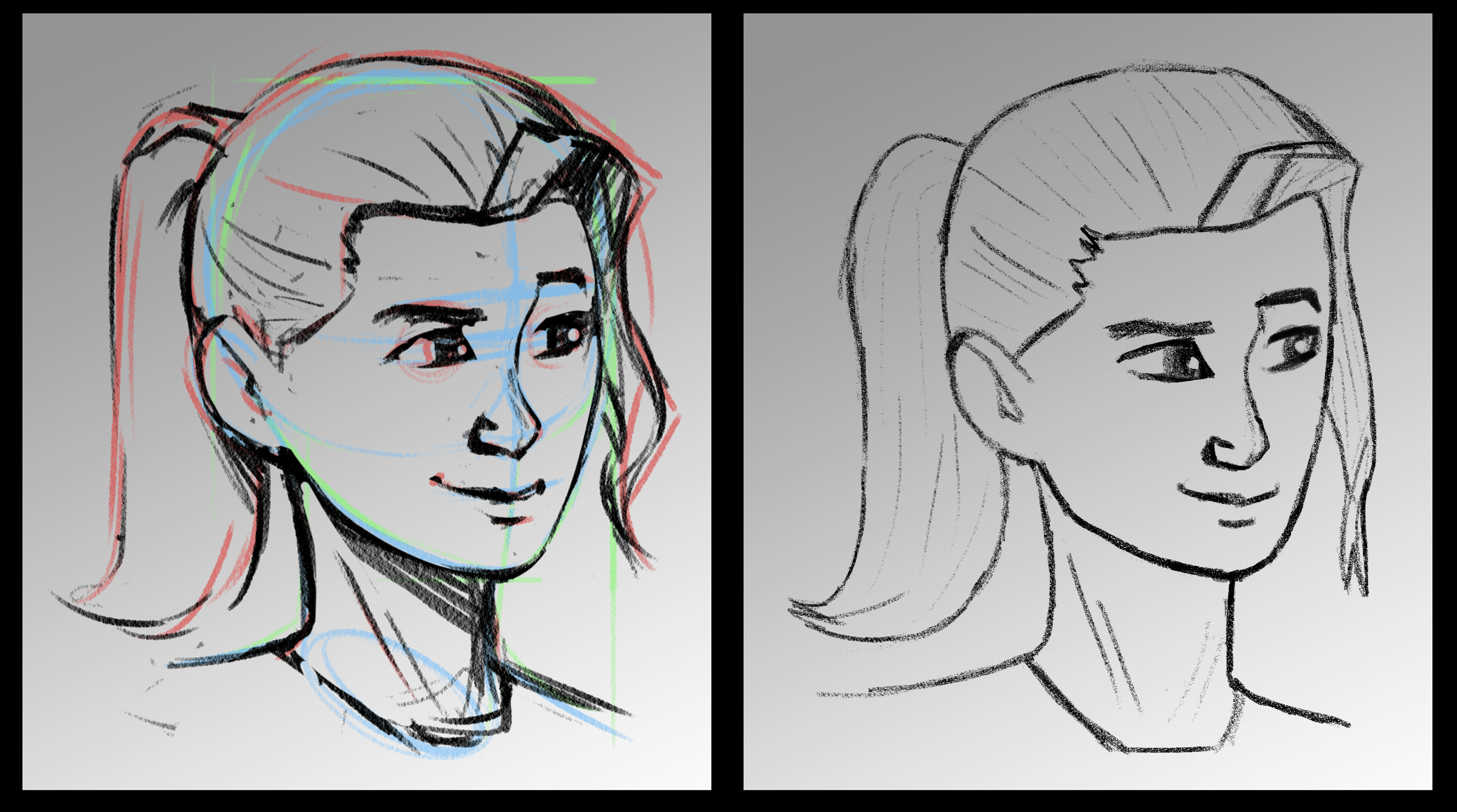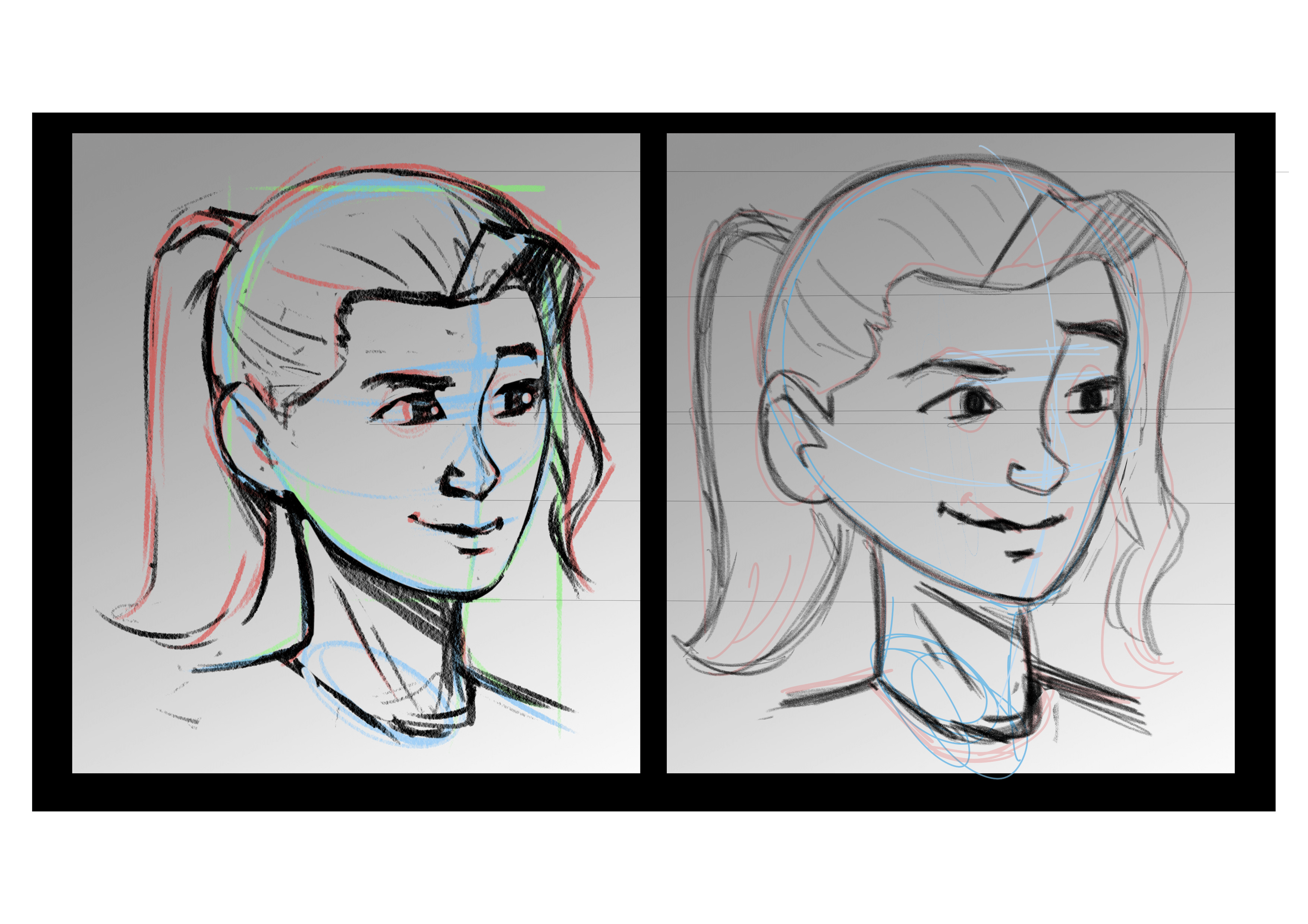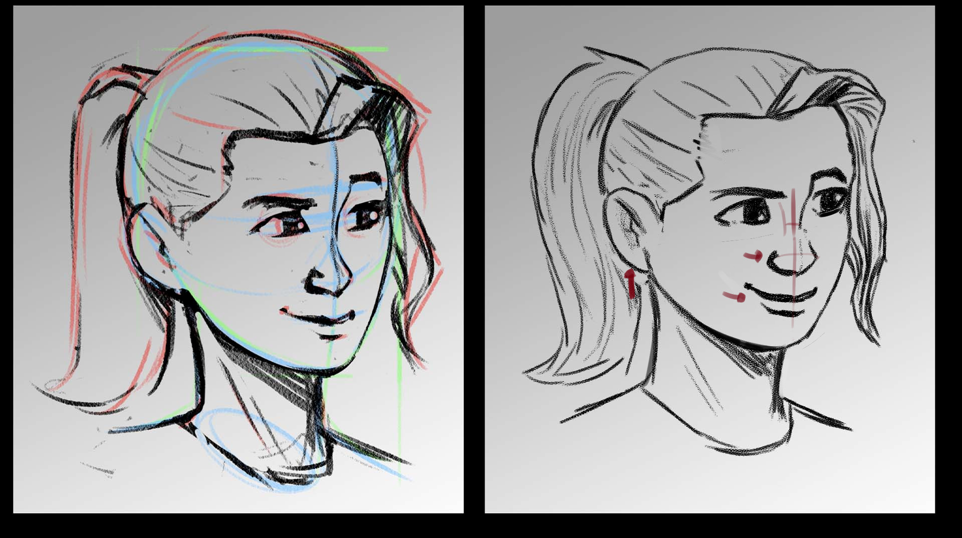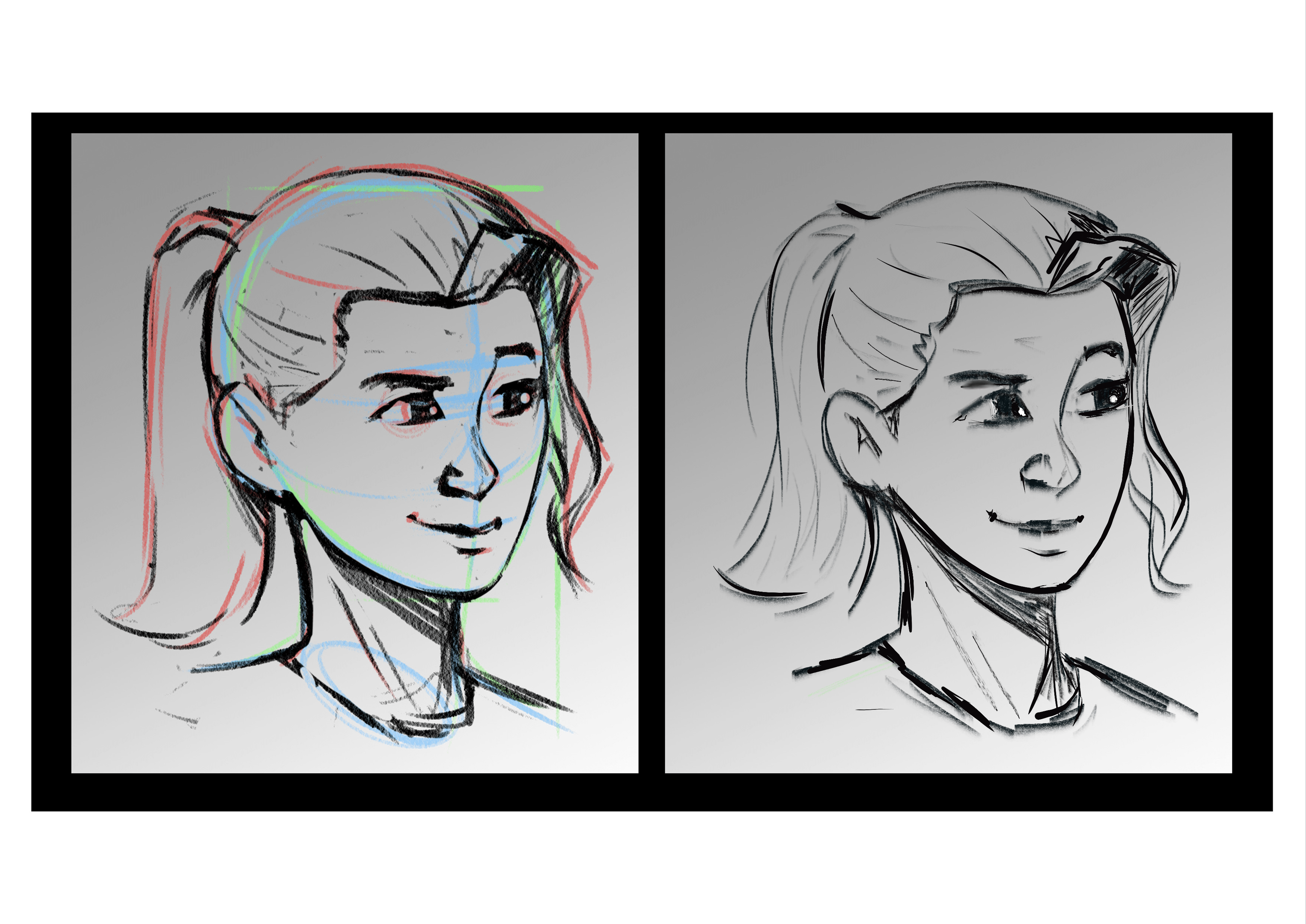 Concernant votre crayonné, l'oreilles est légèrement trop basse (toujours à la même hauteur que le nez: le pavillon est à la hauterur des sourcils, le lobe desend jusqu'à la base du nez), et les lignes du cou méritent de pencher et converger très légèrement vers le bas, afin de donner un poil plus de dynamisme à la pose, et rendre le cou légèrement plus fin et féminin au passage. Le reste est impeccaable, l'expression et l'anatomie se tiennent.