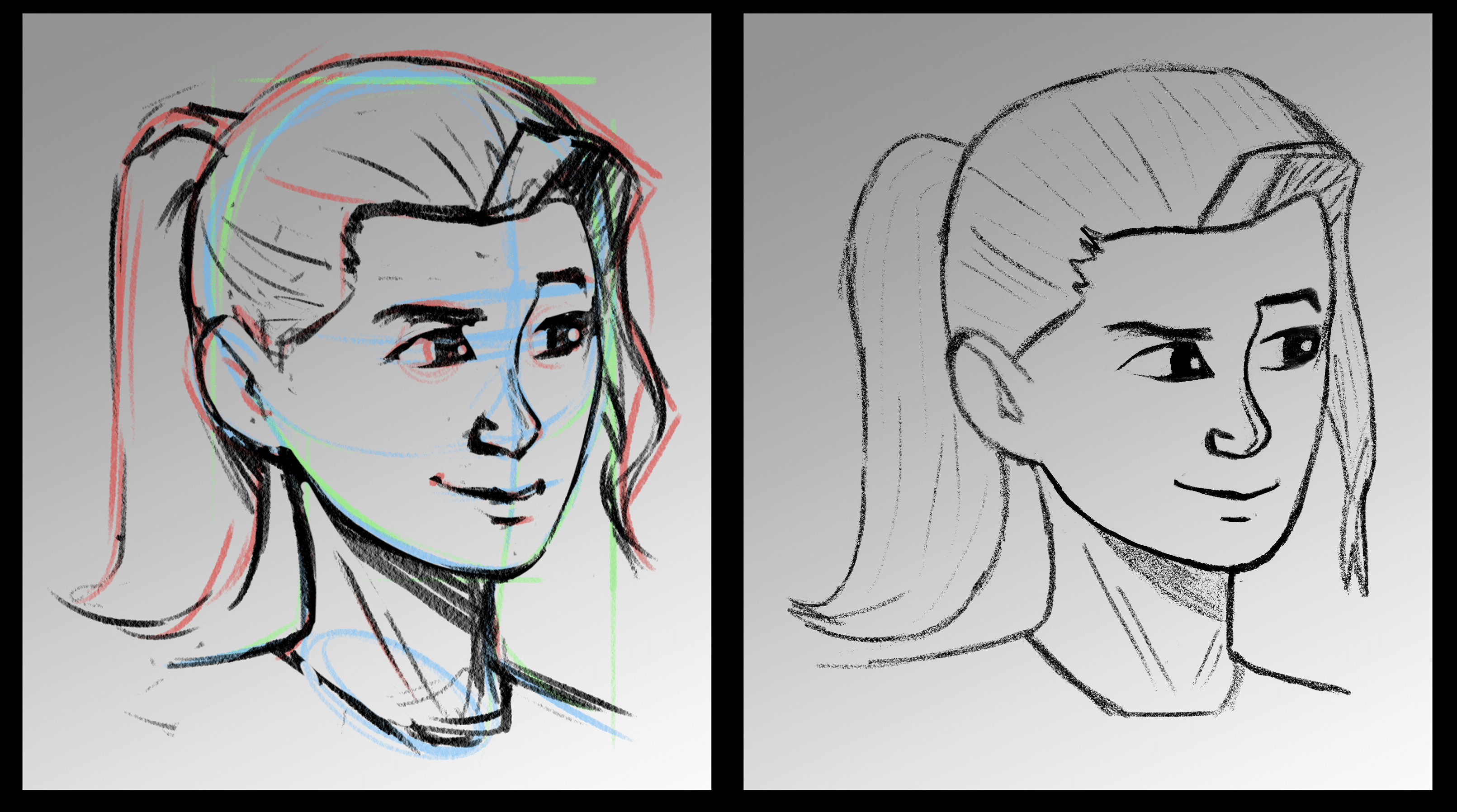 Hallo! Die Zeichnung wird sehr gut gehalten, insbesondere die zweite Version. Vielleicht nur die Nase und die Soucillière Arcade, die es verdient, etwas rechts über den Mund zu fallen. In Bezug auf den Charakter deutlicher weiblicher, drei Dinge: sollte der Winkel des Kiefers, wenn Sie ihn abschwächen, den Charakter weiblicher machen. Je höher und/oder abrundend der Kiefer, desto weiblicher erscheint der Charakter. Je unter und quadratisch die Maschine, desto männlicher scheint es. Sie können Ihr Kinn auch leicht verfeinern. Die Stirn, die gleiche, wenn Sie ihn umrunden, machen Sie den Charakter weniger männlich. Männer neigen dazu, eine breitere und flachere Stirn zu haben, die Frauen eine schmalere und gekrümmte Stirn. Schließlich ist der Hals, wenn er an der Basis etwas schmaler ist als oben: Wenn der Hals konstante Dicke ist, sehen Sie an der Basis dicker, es ist der Hinweis auf weiter entwickelte Muskeln, die im Allgemeinen mit Virilität verbunden sind. Natürlich sollte es Ihnen nicht helfen, "feminin" zu zeichnen oder umgekehrt. Dies sind nur visuelle Codes, die auf dem basierend auf dem basierend auf dem, was am häufigsten ist, basieren. Es gibt Frauen mit einem eckigen Trikot,/oder einem breiten Kinn und/oder einer quadratischen Front und/oder vielen Muskeln, aber je mehr die geschlechtsspezifischen Eigenschaften auf der gleichen Seite und je mehr wir die Art Ihres Charakters auf klare Weise interpretieren.