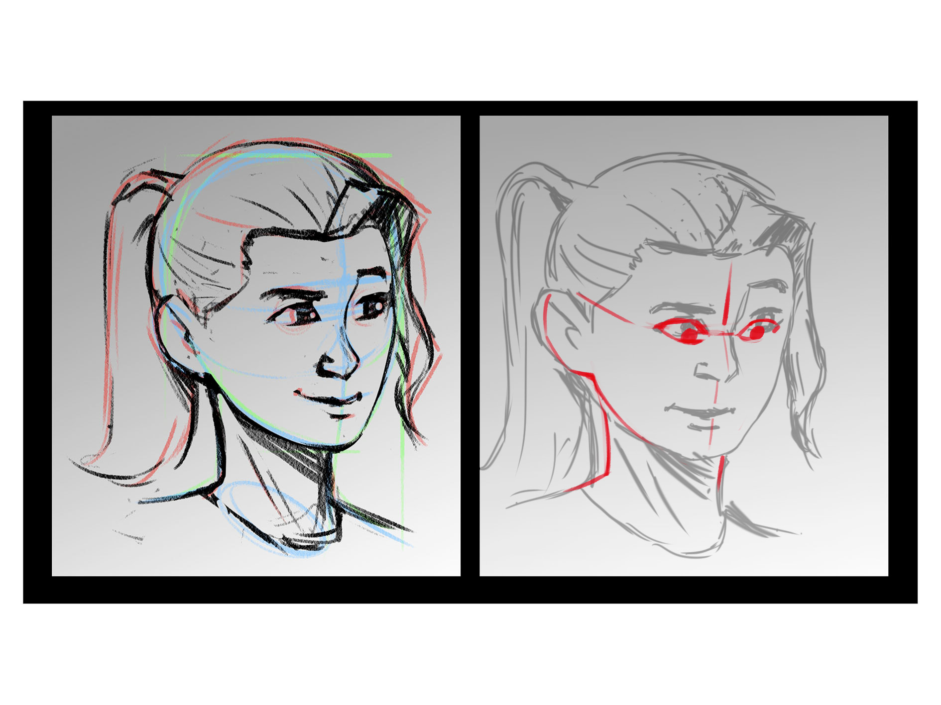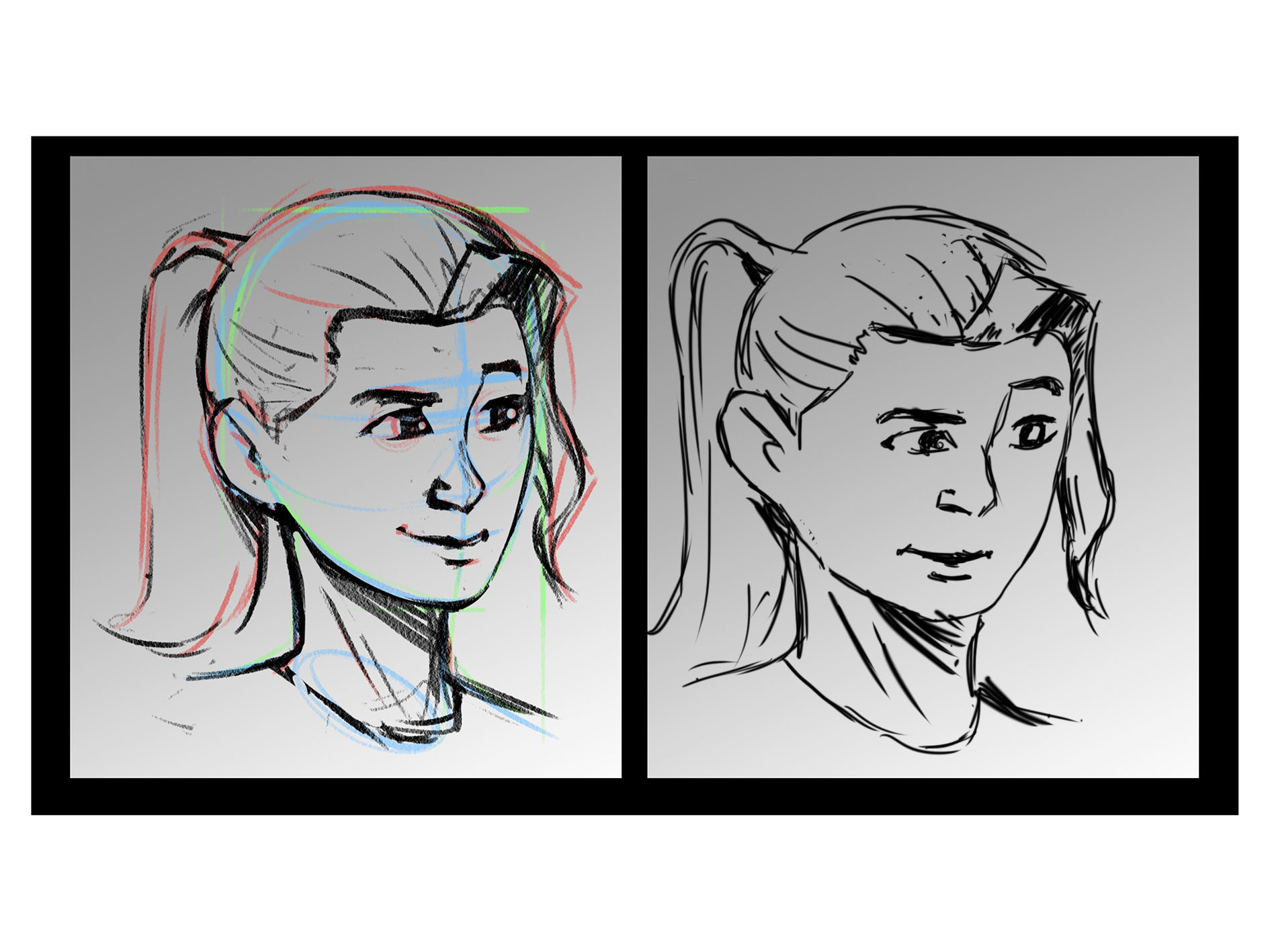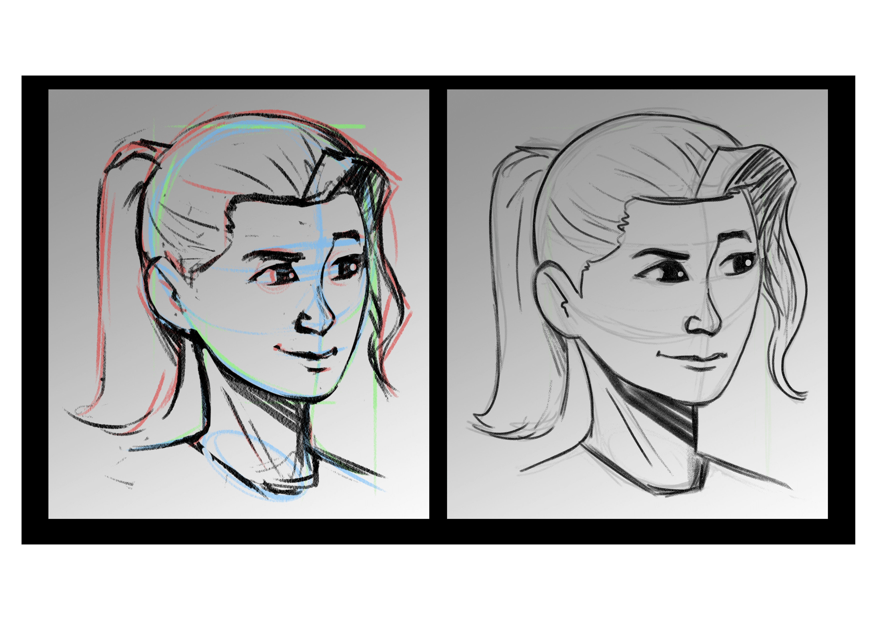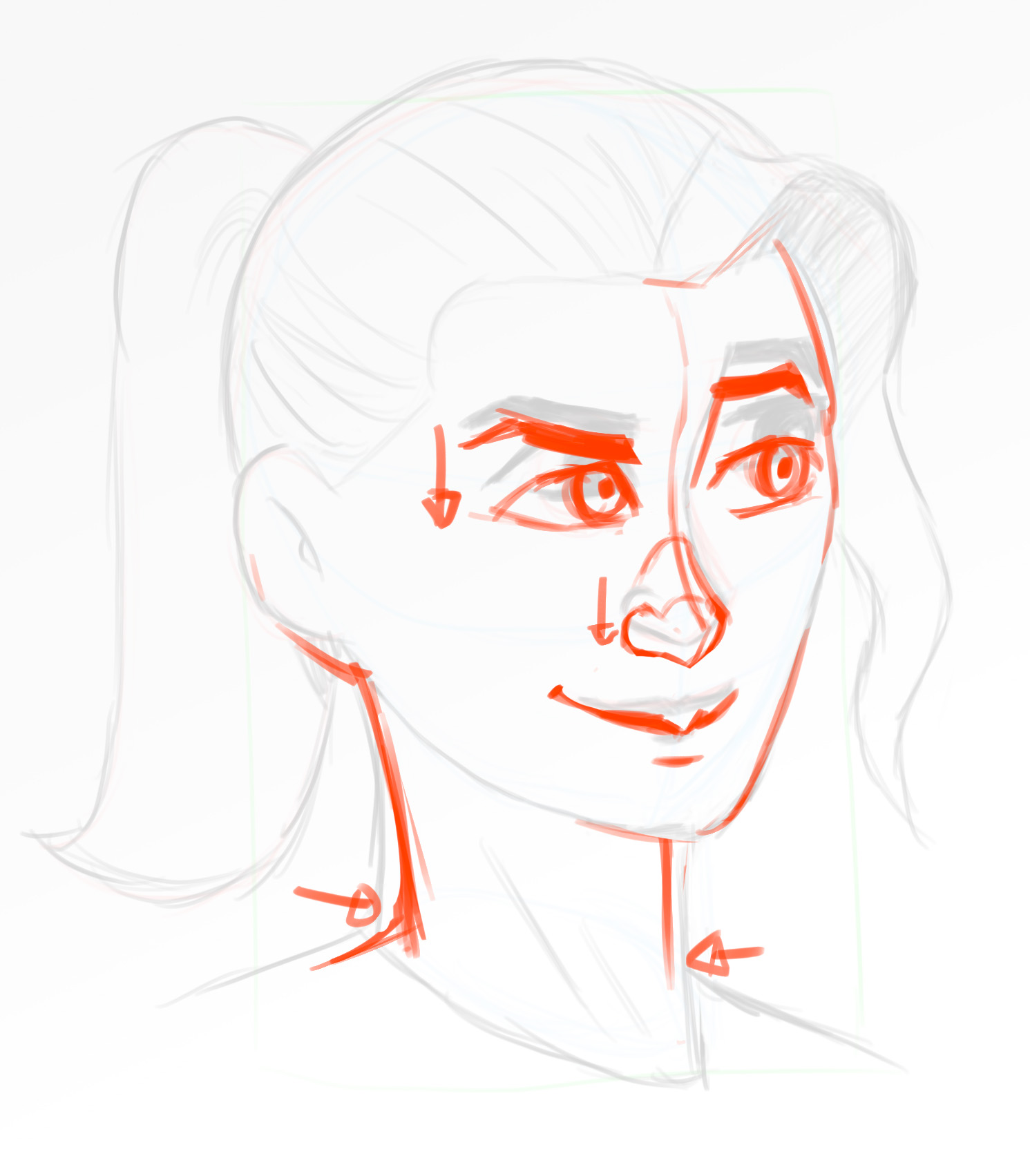 Une fois que tu auras corrigé les lignes de construction, tu peux utiliser l'outil lasso et déplacement pour ajuster l'emplacement des détails du visage. généralement tu auras besoin de redessiner un peu les détails malgré tout, mais ça pourra potentiellement te faire gagner beaucoup de temps.