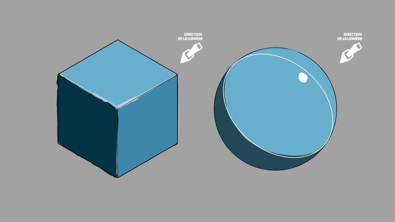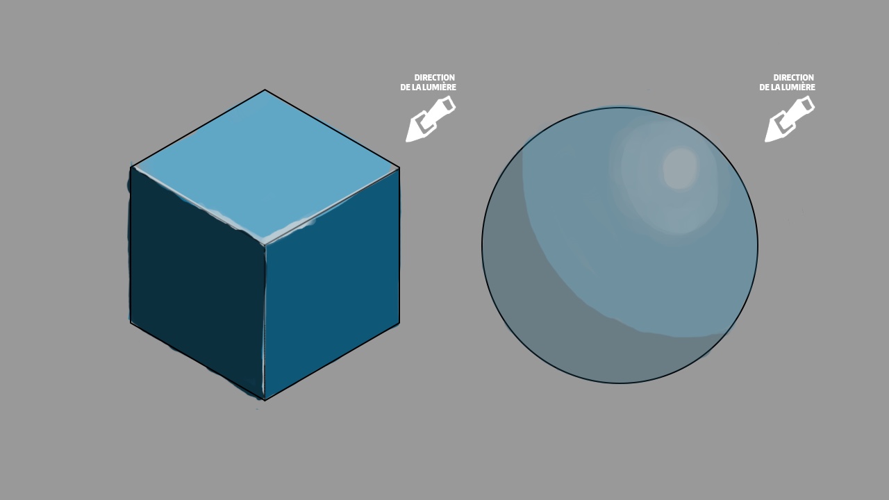 Je pense que tu pourrais éclaircir un peu le bleu intermédiaire pour contraster davantage entre les zones partiellement éclairées et les zones d'ombres. Pour la sphère, tu gagnerais à supprimer le bleu intermédiaire entièrement et te concentrer sur le tracé du terminator: encore une fois la zone de lumière est plus uniforme qu'on ne le croit. tu peux aussi rendre le terminator plus arrondi, surtout là ou il va rejoindre le contour de la sphère: l'oublies pas que le terminator est un cercle, et que vu en perspective, il prend une forme d'ellipse.