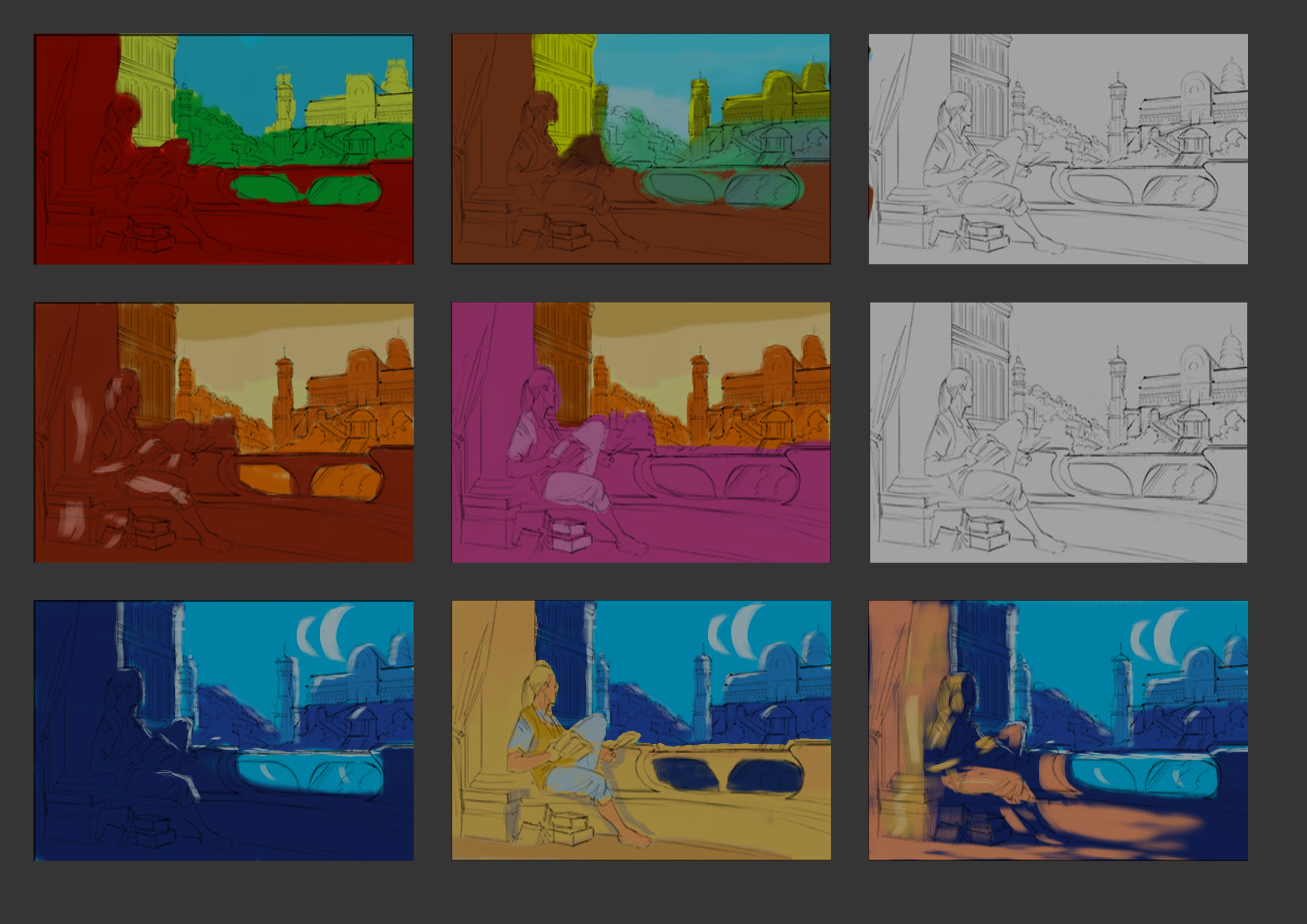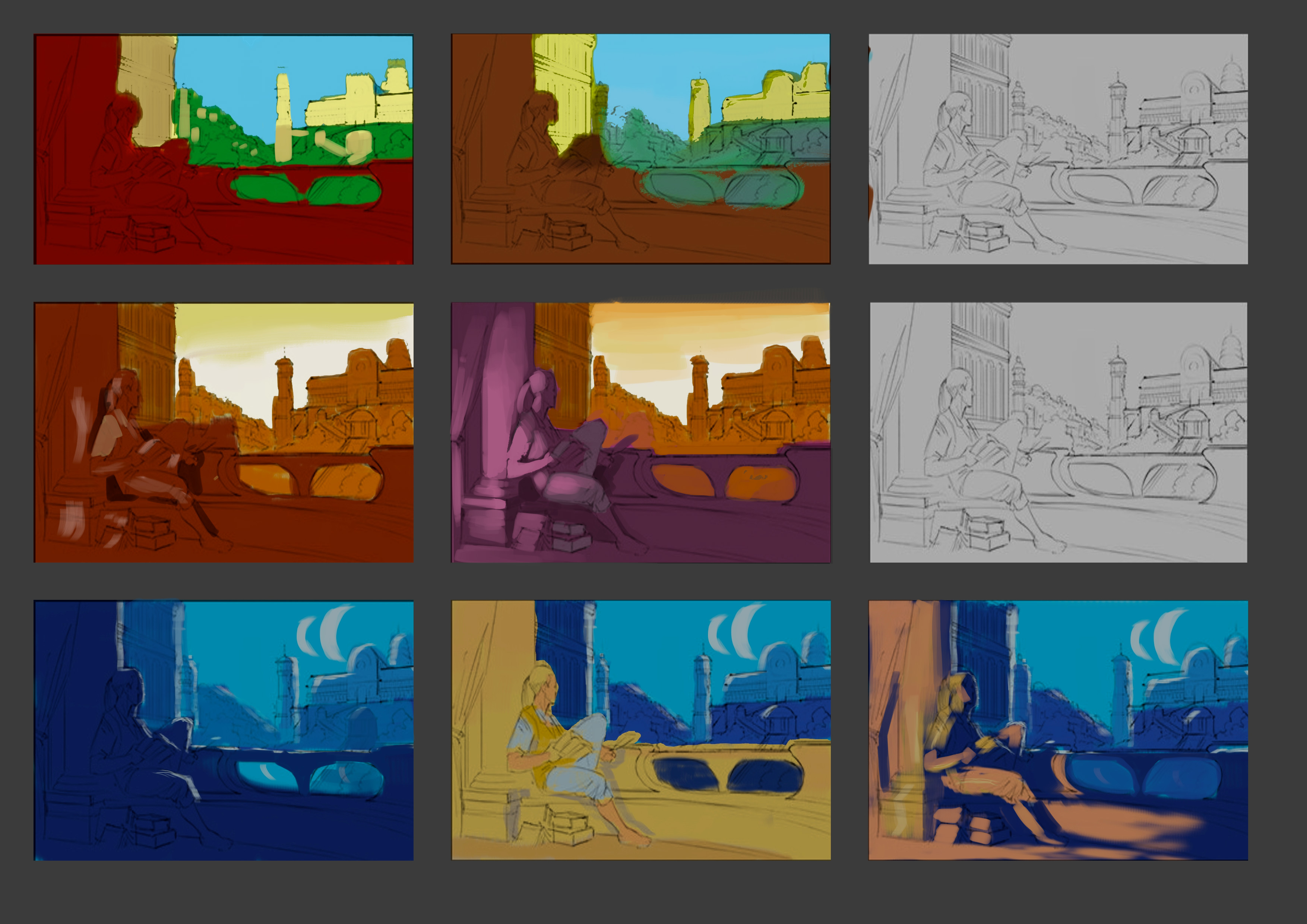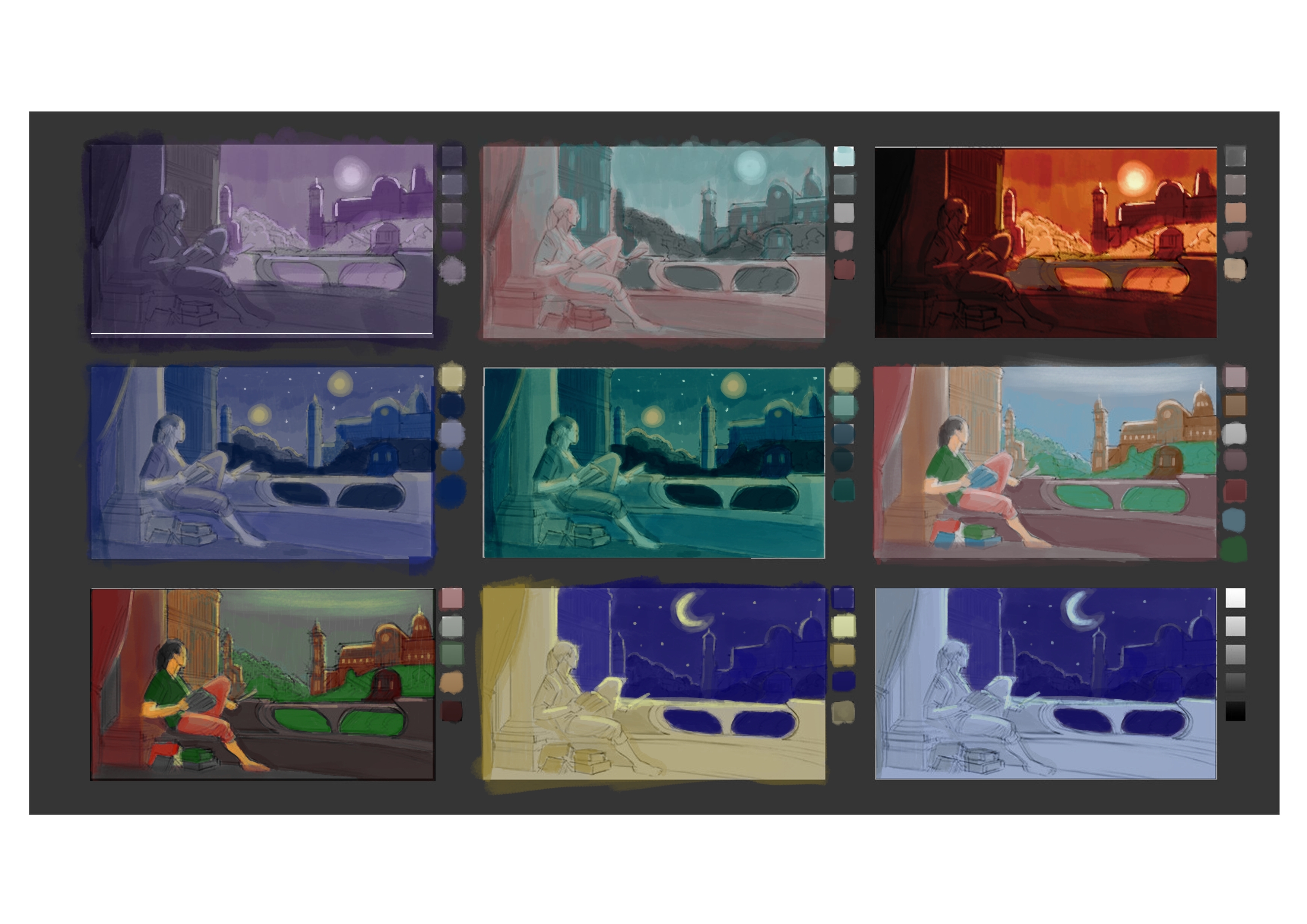 Hier ist meine Arbeit an Farben! Ich habe es geliebt, diese Übung durchzuführen und verschiedene Atmosphären durch die unterschiedliche Verwendung von Farben vorzustellen. Ich habe versucht, verschiedene Lichtquellen und Schatten mit Sonnen-, Mond-, Brouilalrd- und Regenszene mitzubringen.
