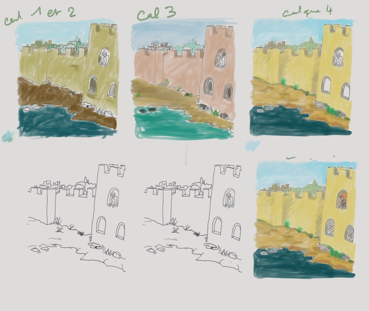 3 - très belles couleurs! c'est vibrant, c'est coloré! juste deux petites remarques: le pan de bâtiment derrière le buste du personnage pourrait être plus clair afin de mieux le faire ressortir, et comme pour la n°1, la végétation de la colline devrait être d'une valeur proche de la silhouette des bâtiments.