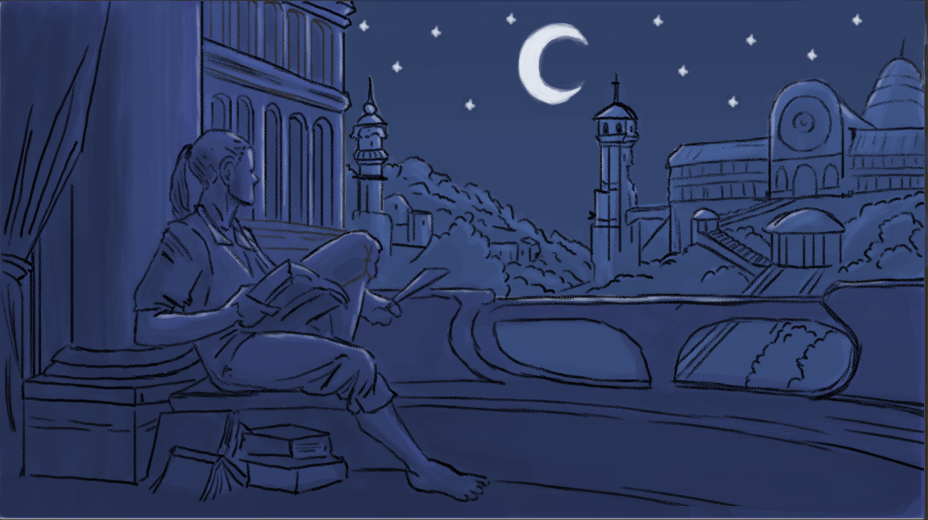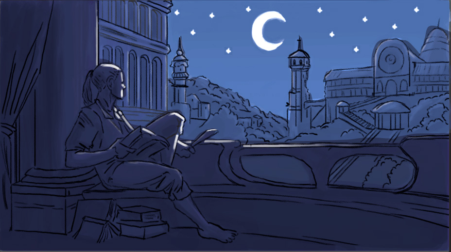 Pour résumer, du plus clair au plus sombre on a: la lune, les bougies/lampes, les objets proches des bougies et lampes, le ciel, le décor lointain.