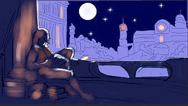 Pour le clair obscur, attention, je recommande de garder le ciel plus clair que la colline et les bâtiments de l'arrière plan. ça fait une hierarchie plus lisible et qui ressemble plus à la réalité. (le décor ne reflète qu'une partie de la lumière du ciel, il est donc plus sombre - surtout que la lune est derrière, elle néclaire donc que les silhouettes par l'arrière. si tu veux vaire ressortir des lumières dans e décor, ce seraient donc, comme tu l'as fait, les lumières chaudes aux fenêtres.