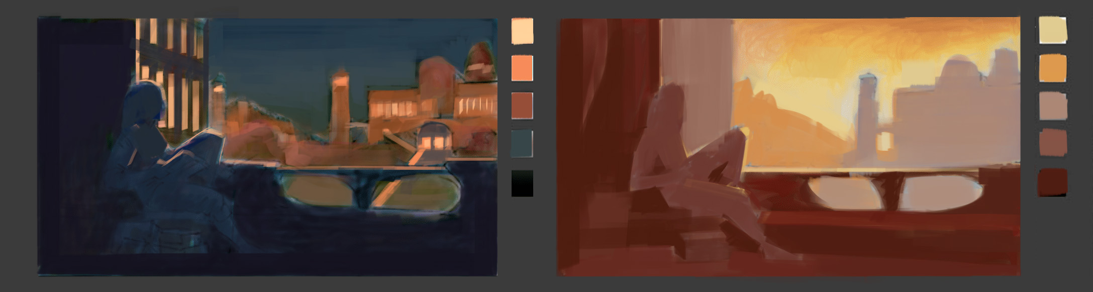 Der Versuch, die helle Stadt im Hintergrund zu machen, ist eine Ausnahme, da die Nachts Sciel dunkler als der zweite Plan ist, aber wir werden immer noch versuchen, die Dinge auf das Maximum zu vereinfachen: sehr dunkler Indigo -Blau -Level, mit nur leichten Variationen, damit wir den Charakter lesen. Leichter Hintergrund mit Orangen überall, um zu vermeiden, dass sich zu viele Kontraste verirren: Wir mögen es, dass es viel diffuses Licht gab. Wir können ein wenig genauer für das Gebäude direkt hinter dem Charakter sein, da es näher ist, also betonen wir die leichte Kontosse mit lebhafteren Leuchten an den Fenstern und einer ziemlich dunklen Fassade. Endlich das himmelblau grau etwas grün. Wir halten den Himmel kälter als den Vordergrund, um das Lesen zu lesen: Die heißen Bretter scheinen uns näher zu sein.