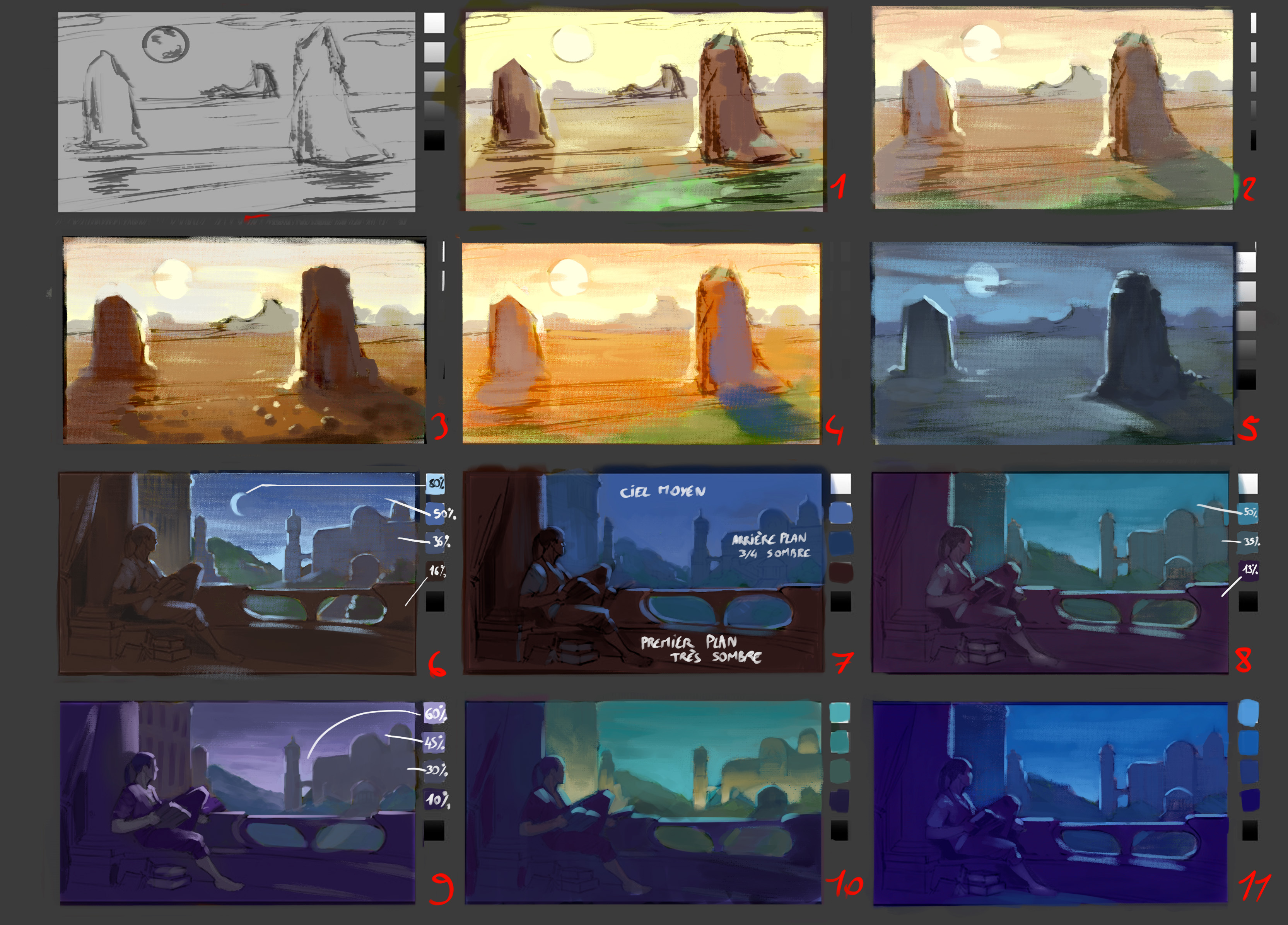 pour la 9, tu as un peu plus de contrastes de luminosiité, mais ça reste un peu trop saturé, surtout le second plan qui ne s'accorde pas bien avec le reste de la palette. Utilise un pinceau transparent pour mélanger tes teintes locales avec la couleur dominante de ton image pour créer des gammes plus harmonieuses. Et encore une fois, je monte les contrastes entre les plans, j'atténue un peu les couleurs, mais en gardant la dominante de violet.