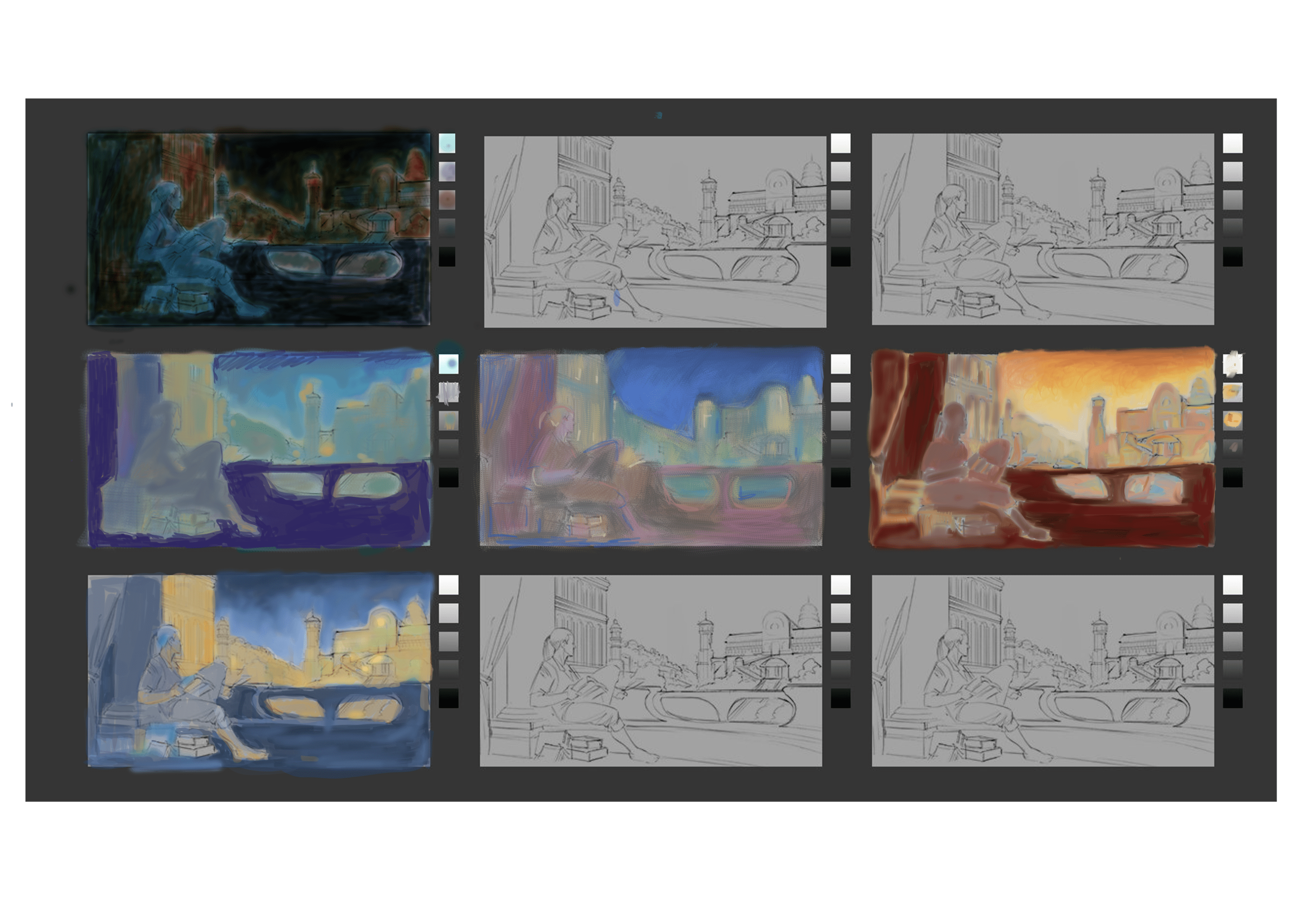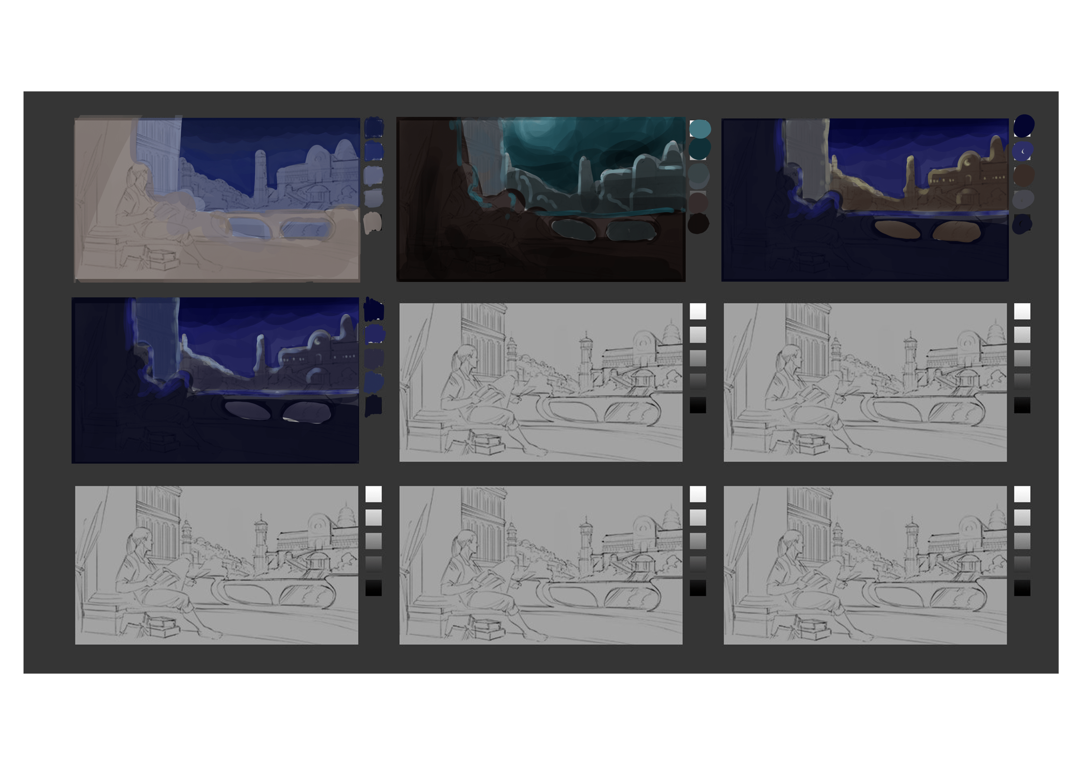 Hallo! Gute Arbeit. Mein Rinver -Rat ist, einfache, nicht zu viele Gradienten und Farbvariationen zu beginnen. Die zweite besteht darin, sich auf das Prinzip der atmosphärischen Perspektive zu stützen: Klar und kalt (blau oder cyan) im Hintergrund und dunkler und dunkler im Vordergrund (Indigo, lila). Auf dieser Basis können Sie andere Lichter wie Lampen, die Stadt, die Wissenschaftler usw. zurückbringen, zurückbringen. In dieser Hinsicht finde ich, dass Ihr zweiter Test am überzeugendsten ist. Ich habe den Himmel nur ein wenig gereinigt, um die sehr lesbaren zu machen.