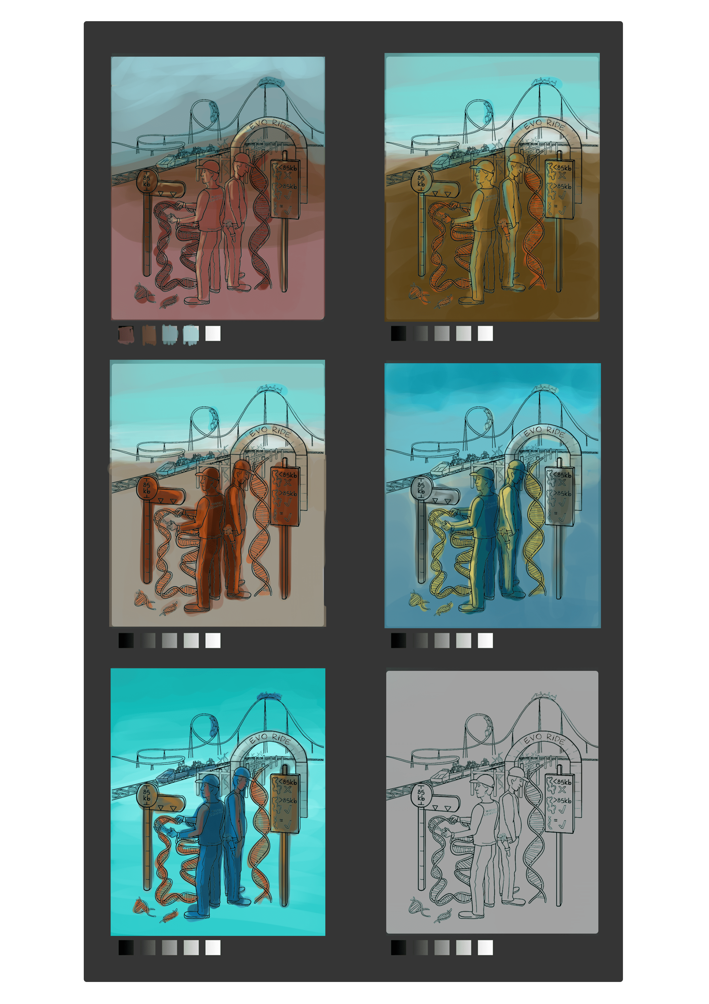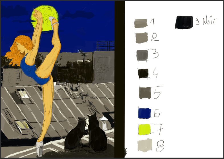 J'ai fait des tentatives pas très concluantes de recherches de couleurs. Je manque de méthode et d'ordre. Je vais essayer sur mon illustration si j'y arrive mieux.