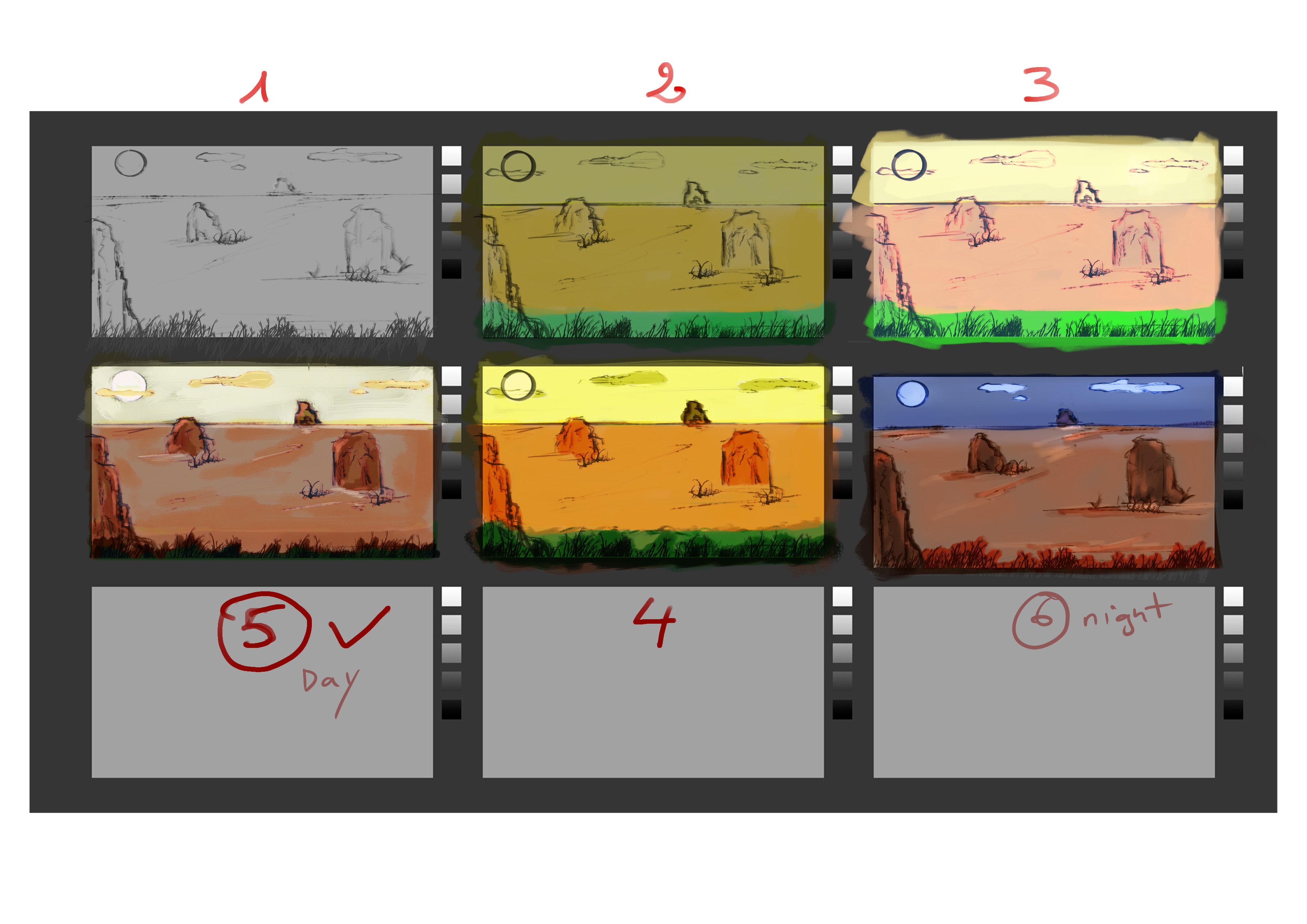 en 2, ton choix d'un ciel plus clair et un sol orange pastel est bien plus élégant. et proche de la correction pour 1, donc félicitations, tu as su par toi même améliorer ta première proposition. J'en profite pour ajouter des ombres gris/bleu, pour donner plus de variété à l'image. aboir des ombres froides dans une image avec une lumière chaude permet d'ajouter du contraste et de la variété de couleurs dans une image.