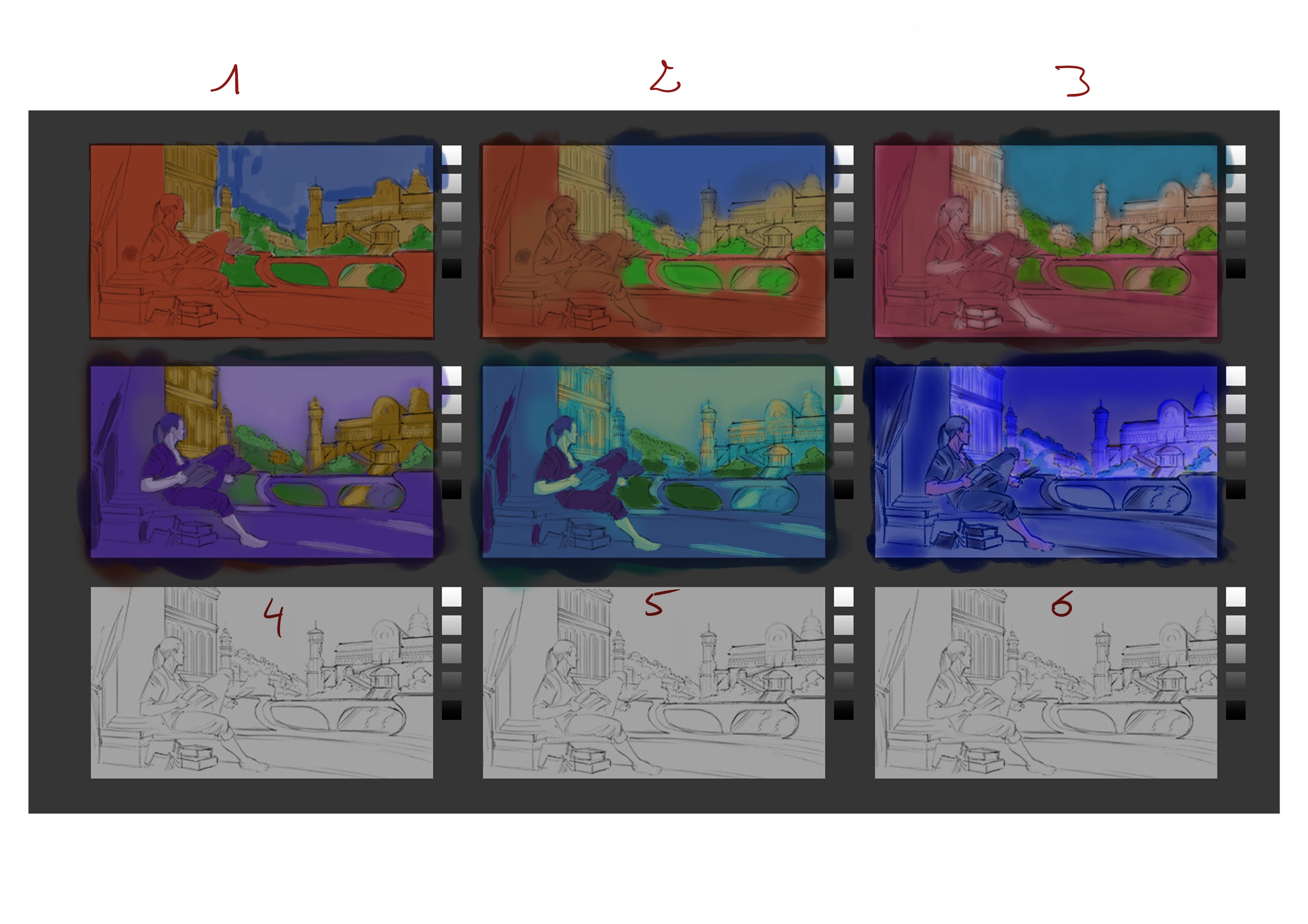 für den 5., da es sich um einen Nachtplatz handelt, verschwinden die Roten fast vollständig. In Wirklichkeit sehen wir bei schwachem Licht in Schwarz und Weiß, aber die Verwendung von Blau ist eine gut bestehende Konvention. Plötzlich machte ich in meiner Korrektur die Roten, Orangen und Braun verschwinden, und alles ist blau, grau oder sehr leicht grün. Selbst nachts kann man den Himmel aufhellen, solange die Farben gut sind, verstehen wir, dass es sich um eine Nachtszene handelt.