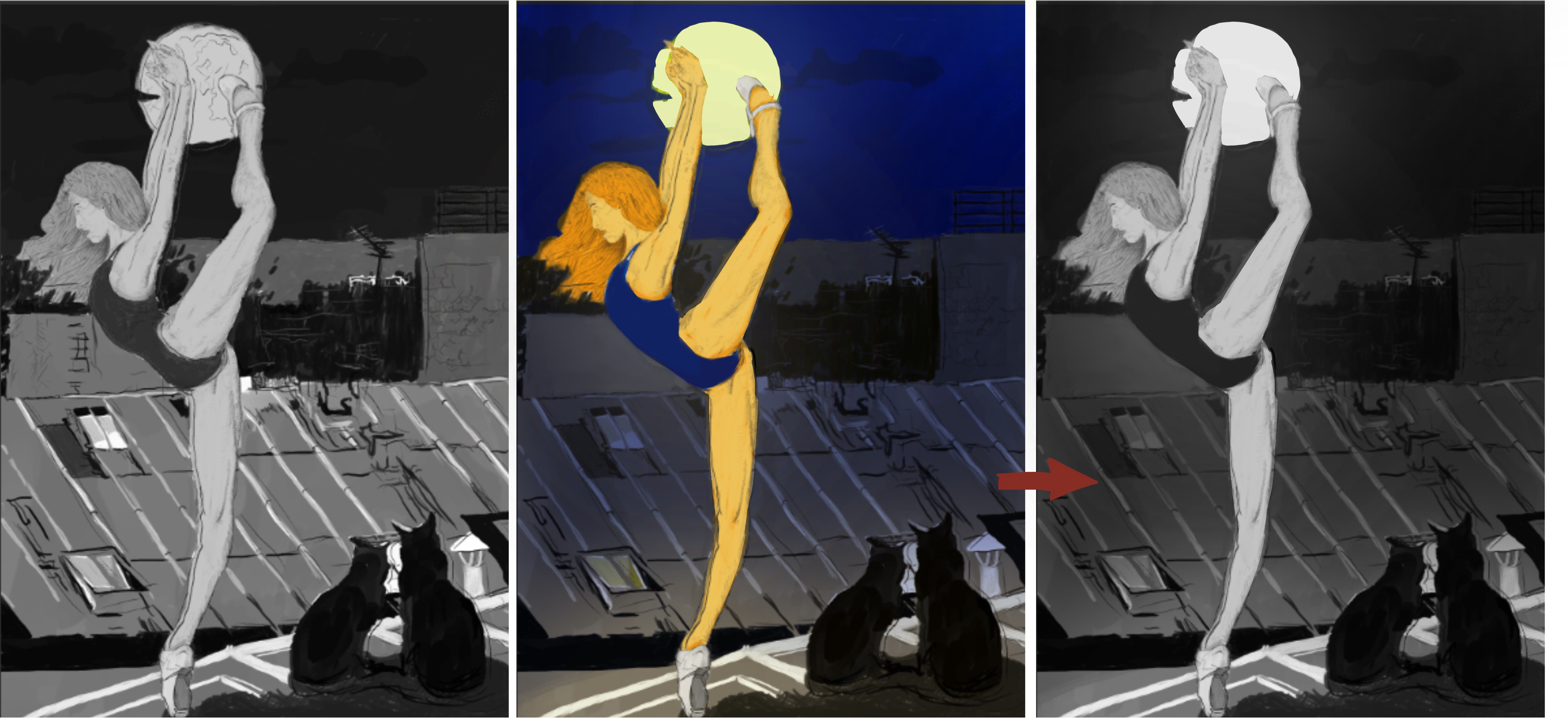 Pour la 5, comme c'est une scè_ne de nuit, les rouges disparaissent presque complètement. en réalité, en faible lumière, nous voyons en noir et blanc, mais l'utilisation du bleu est une convention bien établie. du coup, dans ma correction, j'ai fait disparaitre les rouges, oranges et bruns, et tout est bleu, gris ou très légèrement vert. même de nuit, tu peux éclaircir le ciel, tant que les couleurs sont bonnes, on comprend que c'est une scène nocturne.