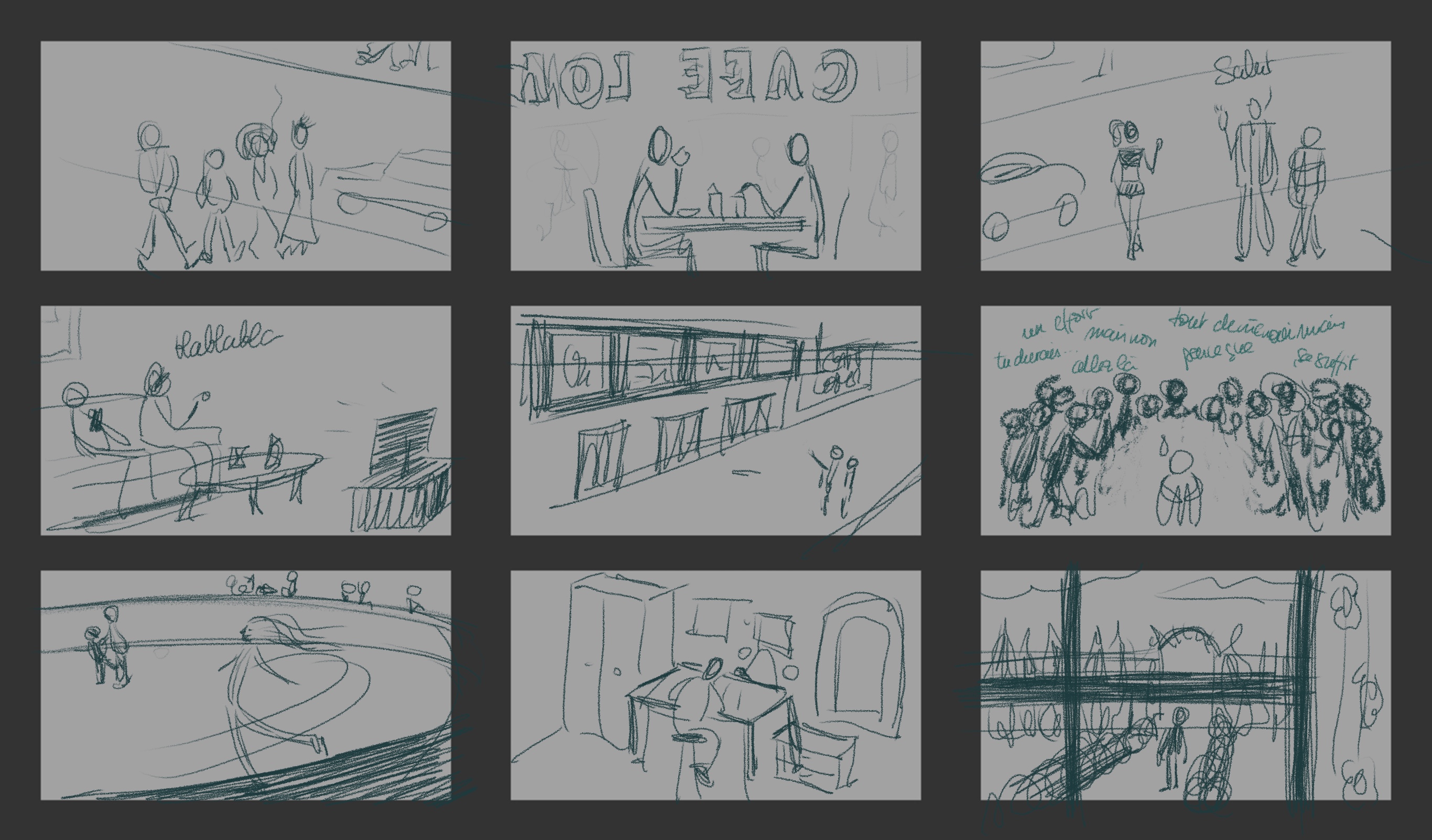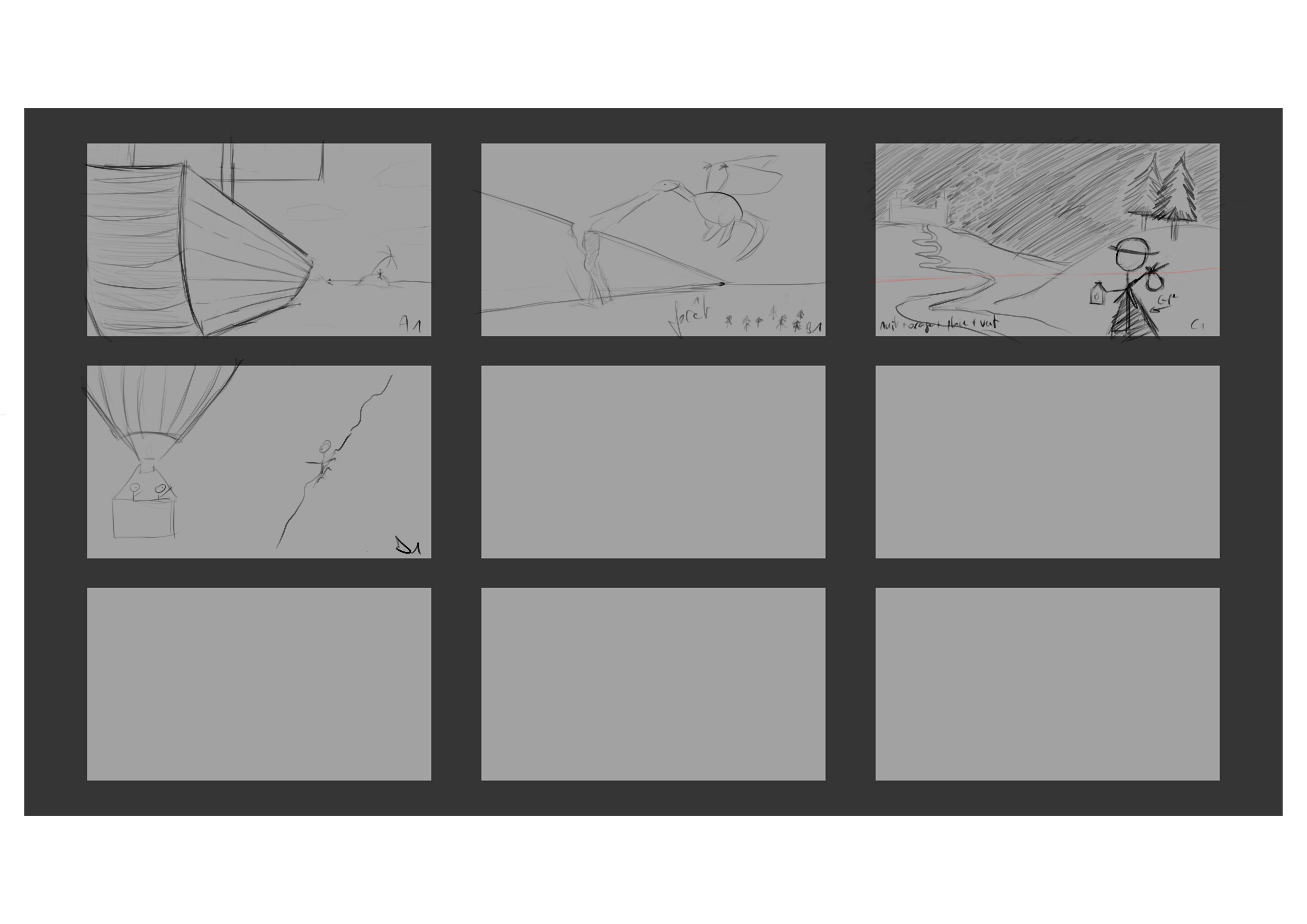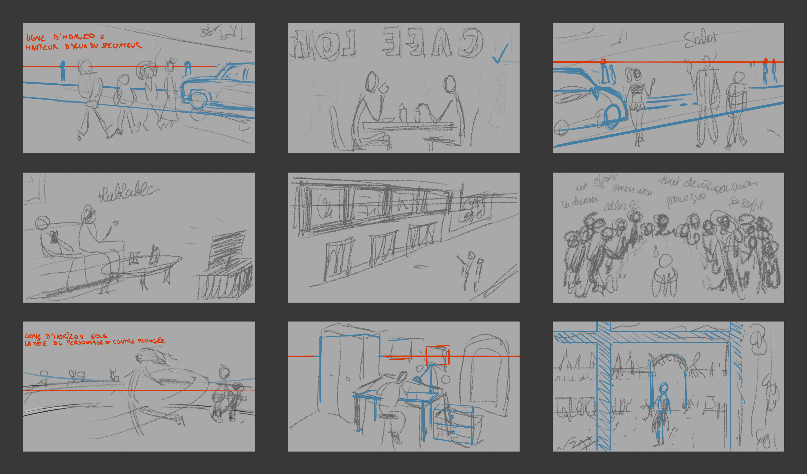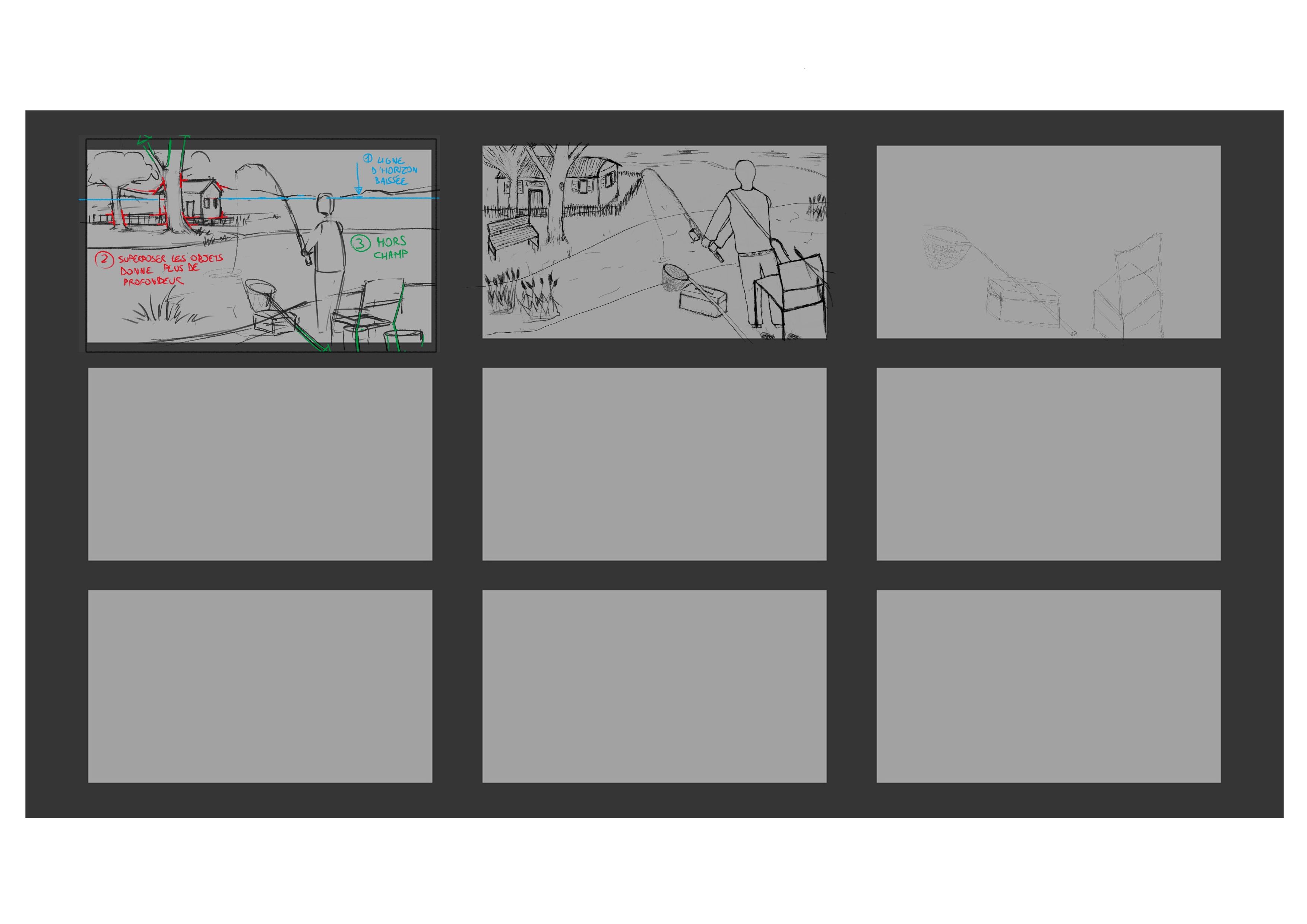 Après de longs mois sans activité je me relance dans les exercices. Je n'ai pas rempli toutes les vignettes, d'une part parce que je les ai longtemps laissées de côté (j'avais fait les trois premières) et je sens le besoin d'avancer. Et d'autre part, j'ai une fâcheuse tendance à effacer les traits et travailler sur une seule vignette plutôt que de faire plusieurs versions comme dans votre exemple (j'essaie d'améliorer ça mais ça n'est pas évident 😅).