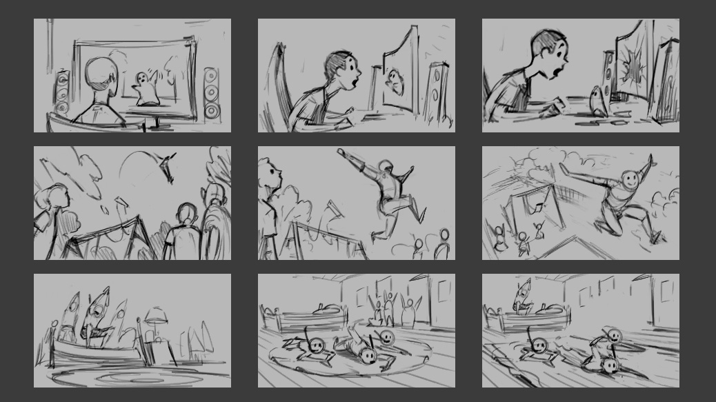 Für die zweite Geschichte ist dies der Moment, in dem der Charakter wegfliegt: Wenn wir ihm zeigen, dass er fliegt/springt, aber dass wir den Schwung im selben Bild zeigen, haben wir die ganze Geschichte in einem einzigen Bild. Danach ist es eine Frage, ob der Zuschauer in der Nähe der gestohlenen Person oder den Kindern auf dem Boden stehen muss, die ihn ansehen. Dies ist nützlich, da Vignetten nicht zu detailliert werden, da wir schnell mehrere Dinge ausprobieren und entscheiden können, was wir bevorzugen.