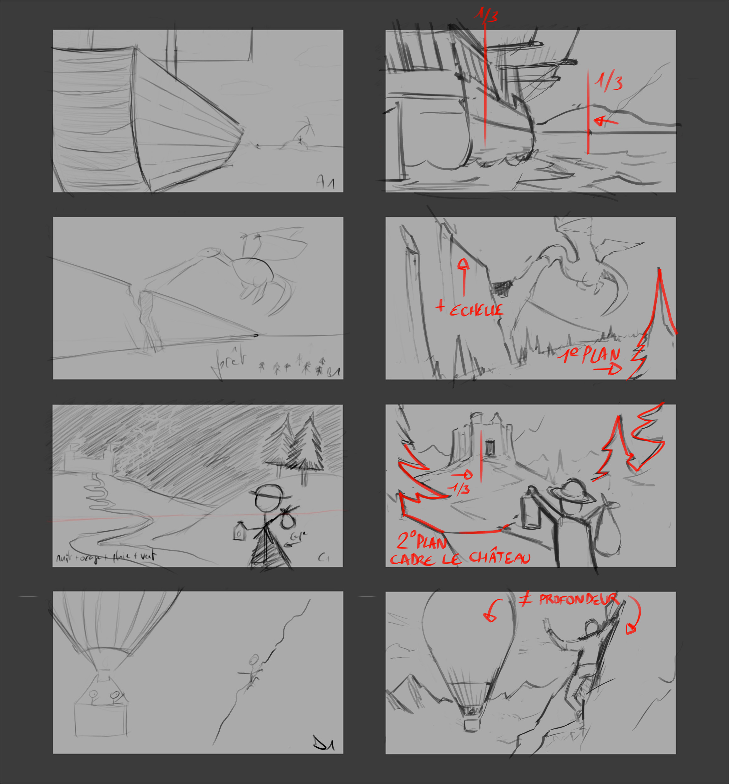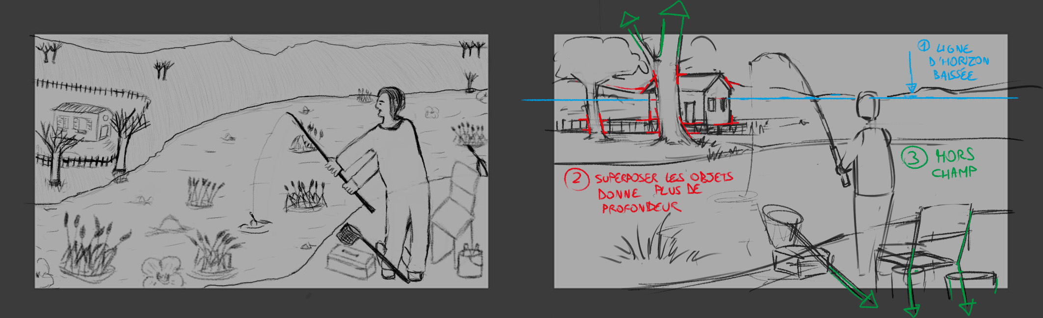 2- Wir werden versuchen, ein Gefühl für die Umgebungsskala zu vermitteln, und dafür werden wir versuchen, sie zu überlagern, anstatt die Elemente der Bilder nebeneinander zu lassen. Das Haus in meinem korrigierten ist also nur etwas mehr Gande als das Ihrer Skizze, aber es scheint nicht mehr eine Miniatur zu sein, im Gegenteil, es ist ein reales Haus in guter Entfernung. Beachten Sie, dass es auch mit der Perspektive verknüpft ist, die Gegenstand einer späteren Lektion sein wird. Dies ermöglicht es auch, Platz zu gewinnen, um einige der Elemente zu vergrößern und das Hauptthema näher (den Charakter) und das kleine Haus der Bildmitte zu bringen, anstatt sie in dem Bereich zu isolieren.