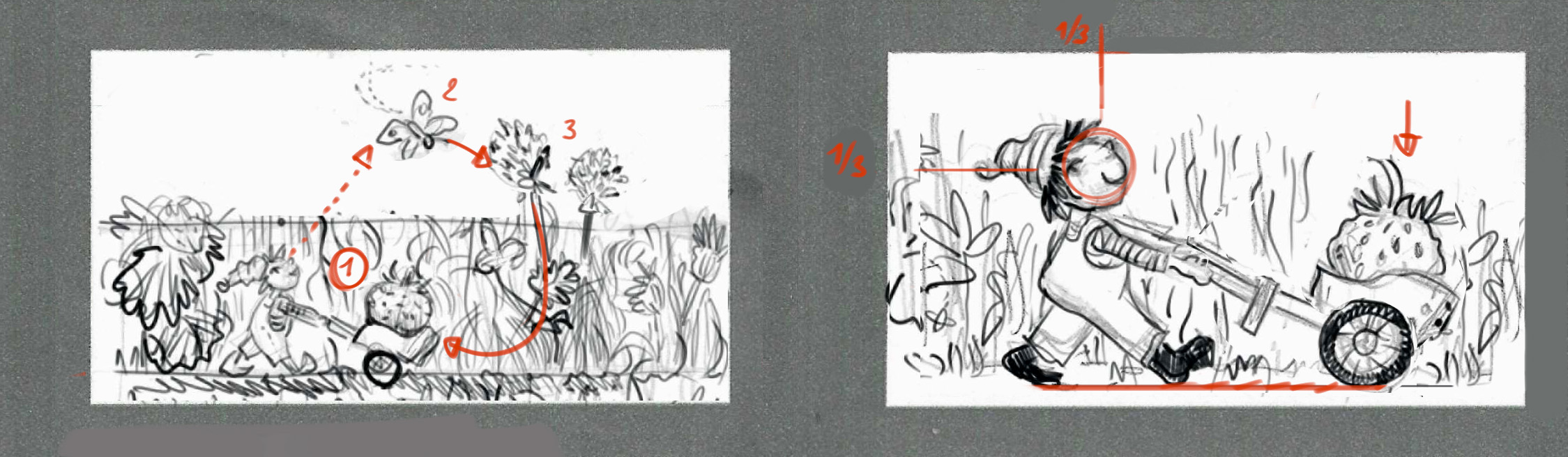 Pour la première, il ne se passe rien au sol, tu peux donc abaisser ce sol et libérer un peu plus de place pour le ciel, et donc le papillon qui est quand même un peu serré. Ensuite, je vais essayer de tout utiliser pour quider le regard entre les différents éléments. Le personnage est au tiers et c'est une figure humaine, c'est donc probablement la première chose qu'on va regarder. ensuite on va naturellement suivre son regard, jusqu'au papillon. si tu vais voler le papillon pointé en direction des grandes fleurs, ça va ensuite amerner le regard sur elle, qui nous fait suivre les tiges vers le sol, près de la brouette. comme ça chaque element pointe sur le suivant, et l'oeil se promène plus à l'aise que si les détails sont disposés plus au hazard.