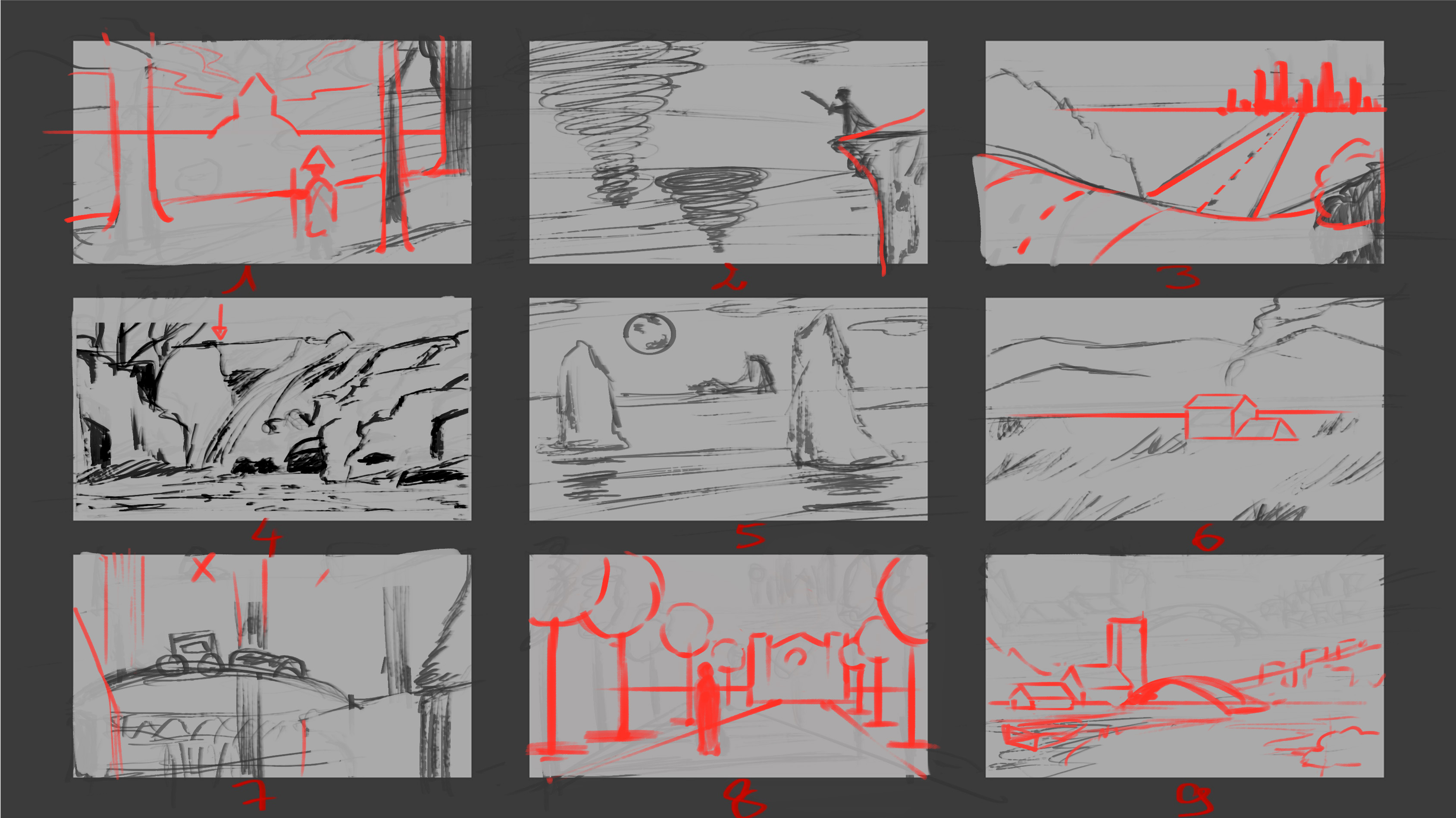 für den 8., nachdem ich das Herrenhaus abgestiegen war, bewegte ich den Flugpunkt auf dem Weg nach letzteres, um zu verhindern, dass der Charakter ihn abdeckt. Für 9 gibt es, abgesehen davon, ob Sie ein wichtiges narratives Element vor Ort haben, keinen Grund, 2/3 der Bildfläche zu widmen. Der Rest der Komposition funktioniert, aber es könnte gut sein, ein führendes Element wie ein Boot am Fluss, Büsche usw. zu haben.
