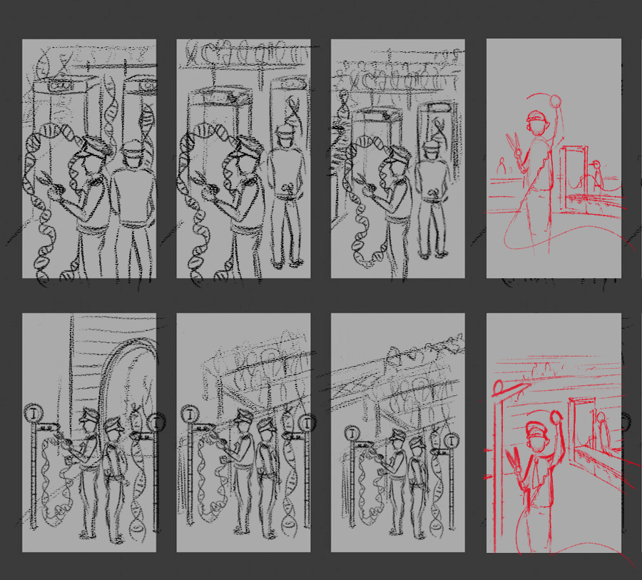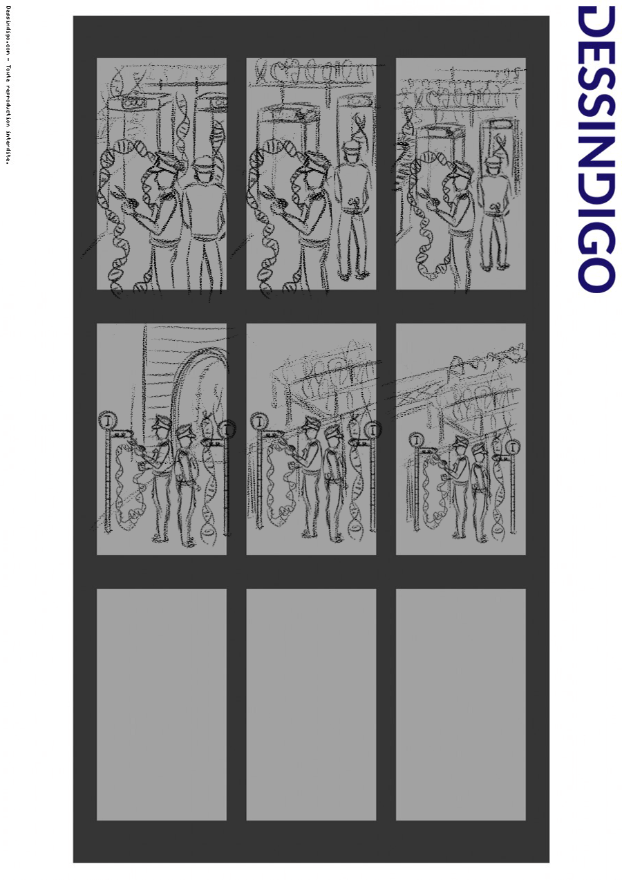 Voici mon exercice pour ce cours. Je suis partie sur une idée représentée de deux façons différentes. Je me permets de donner un petit peu de contexte vu qu'il s'agit d'un travail de vulgarisation scientifique. Ici l'idée est que deux officiers de la sécurité vont vérifier et bloquer certaines molécules d'ADN (en lien avec leur taille). Les "intrus" indésirables peuvent ensuitre être coupés par ces mêmes officiers.