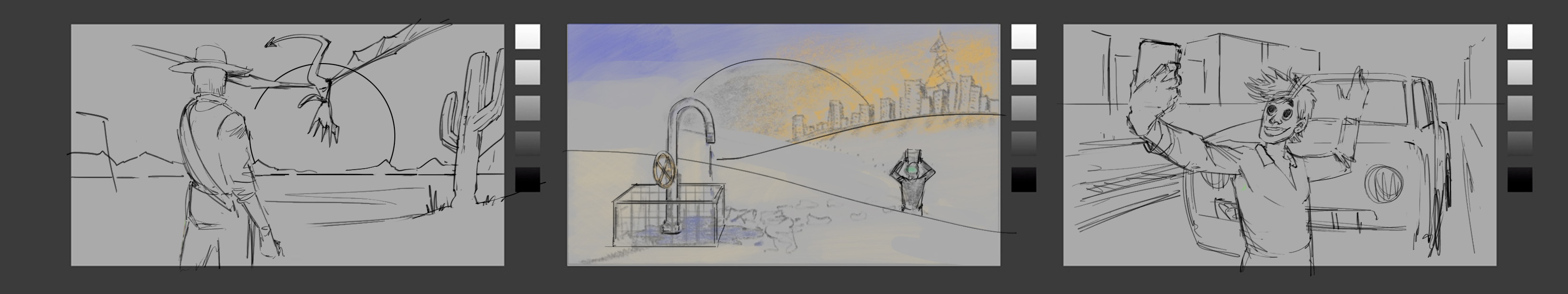 Ich finde, dass das Bild des Cowboy auf dem ersten Board die interessanteste Erzählung ist. Die Mischung aus Western und Fantasie ist in der Fiktion ziemlich selten. Der Rat, den ich Ihnen geben würde, ist, die Größe der verschiedenen Elemente zu überprüfen: Da der Drachen, der das Pferd entfernt, das narrative Zentrum der Aktion ist, ist der Cowboy genau die Sichtweise, und es lohnt sich, den Drachen zu vergrößern und die Größe des menschlichen Charakters zu reduzieren, dass man in vollem Umfang oder fast zeigen kann, dass es sich um die Möglichkeit handelt. Ich habe auch den Kaktus nebenbei verschoben: Es gibt eine Vorstellung vom Klima, aber es ist kein zentrales Element der Geschichte.