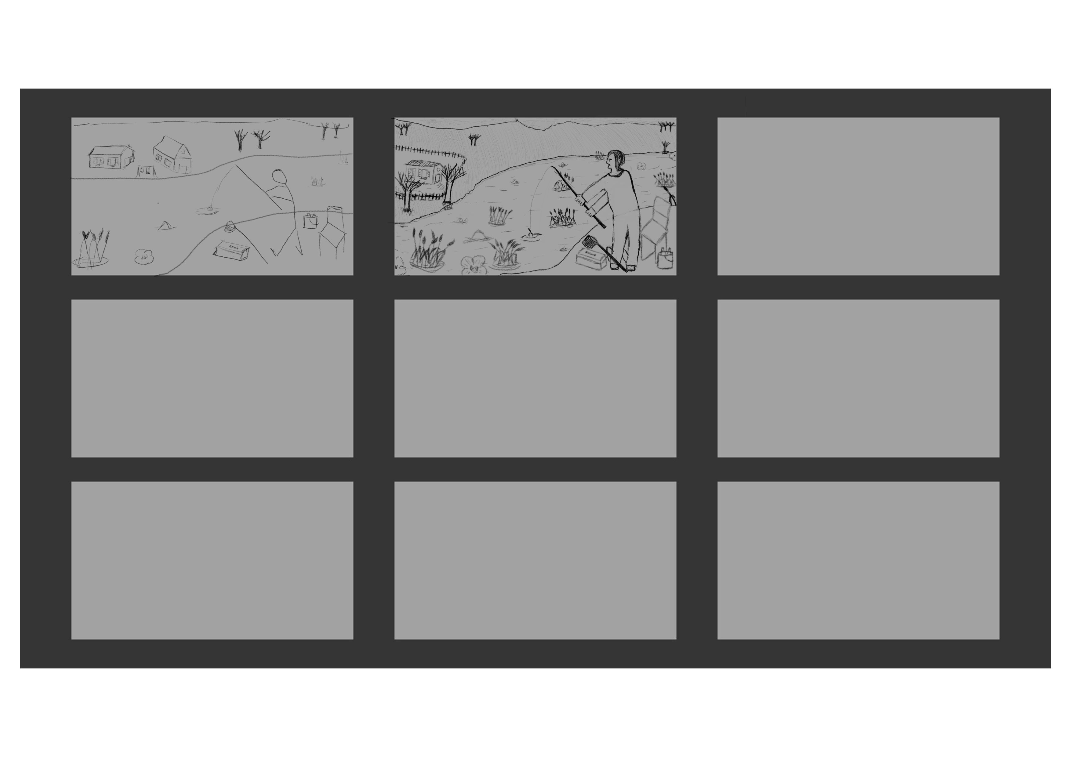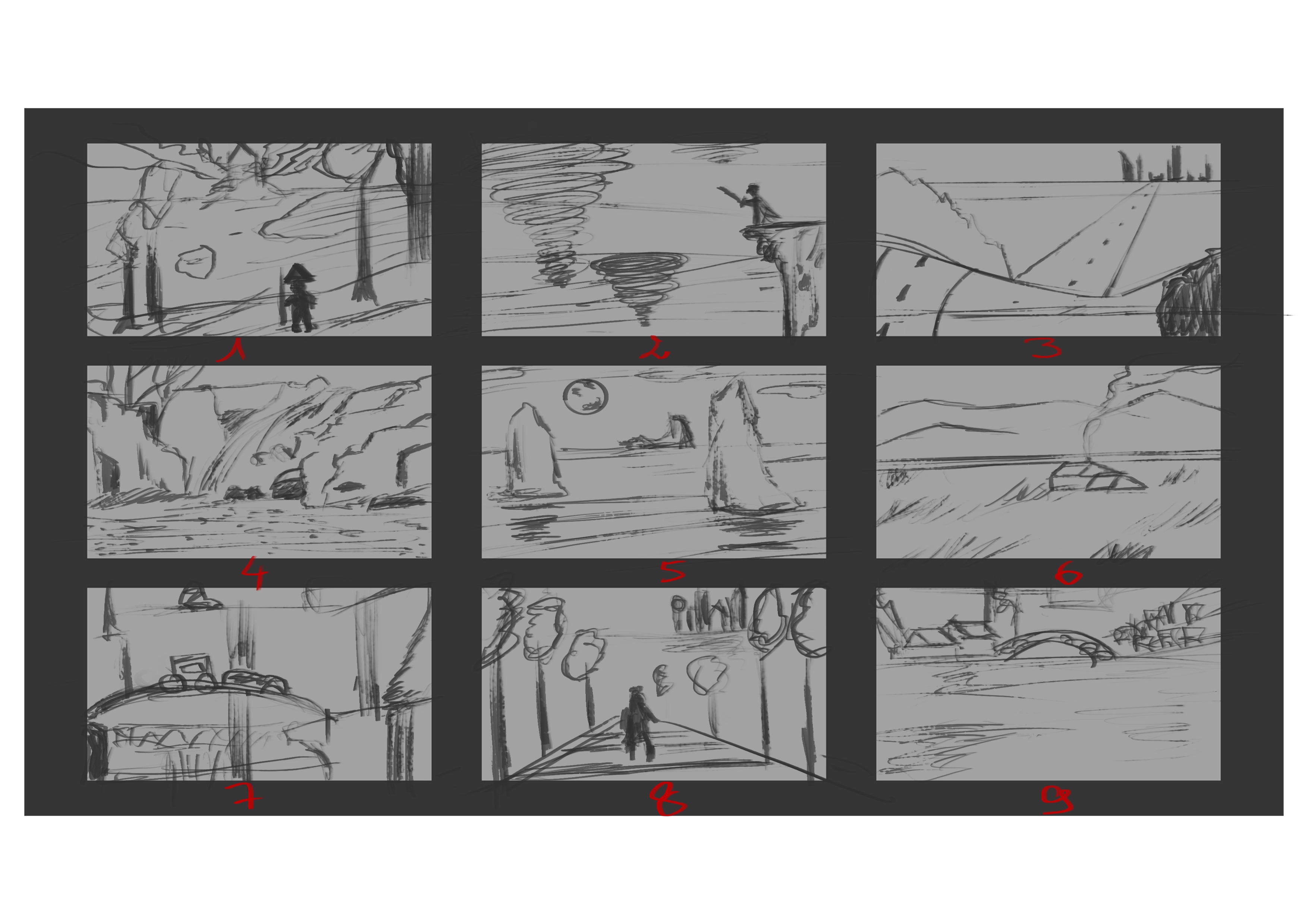 Pour la 8, après avoir descendu le manoir, j'ai déplacé le point de fuite du chemin vers ce dernier, pour éviter que le personnage ne le recouvre. Pour la 9, à part si tu as un élément narratif important au sol, il n'y a pas de raison d'y consacrer les 2/3 de la surface de l'image. le reste de la compostion fonctionne, mais ça pourrait être bien d'avoir un élément de premier plan, comme un bateau sur la rivière, des buissons, etc...