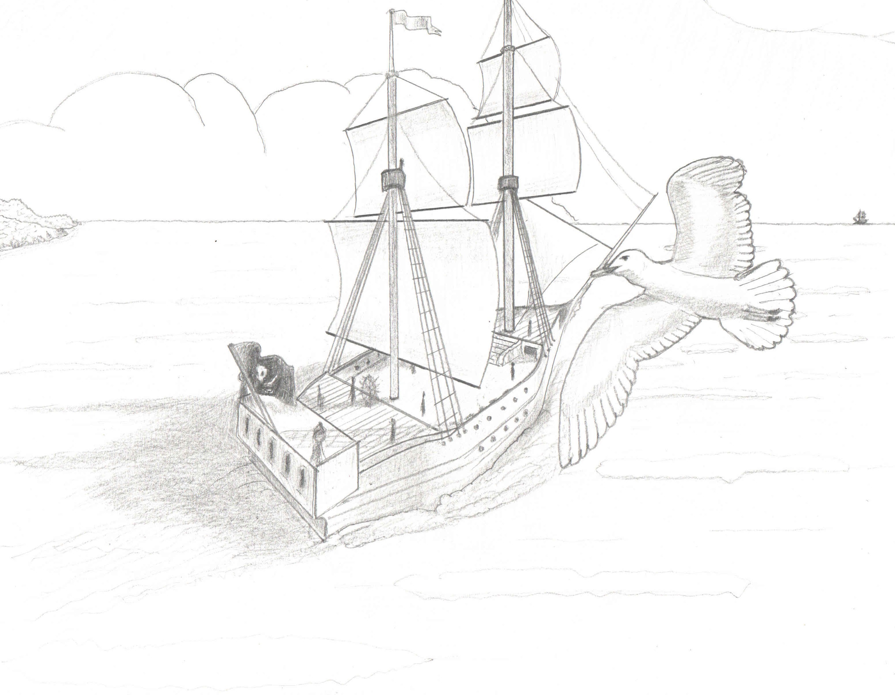 1. La composition de ton image. L'élément important c'est ton bateau, tu l'as mis en plein milieu, jusque là on est bon. Tu as mis du décor tout ça et un autre bateau dans le lointain, impeccable. C'est une compo centrale, classique, pas forcément très dynamique, mais ça marche. Sauf que tu est venu me mettre une mouette collée à ton bateau, qui a une taille similaire au corps de ton bateau et qui du coup gêne la lecture de ton image. On a envie de la prendre et de la pousser pour voire le navire. Rajouter une (ou des) mouette(s) c'est une bonne idée, ça amène de la vie et du mouvement. Mais il faut gérer l'échelle et la position pour que ça participe à la lecture de ton image et pas que ça la gêne. Dans ton cas, la mouette est trop grosse et trop centrée.