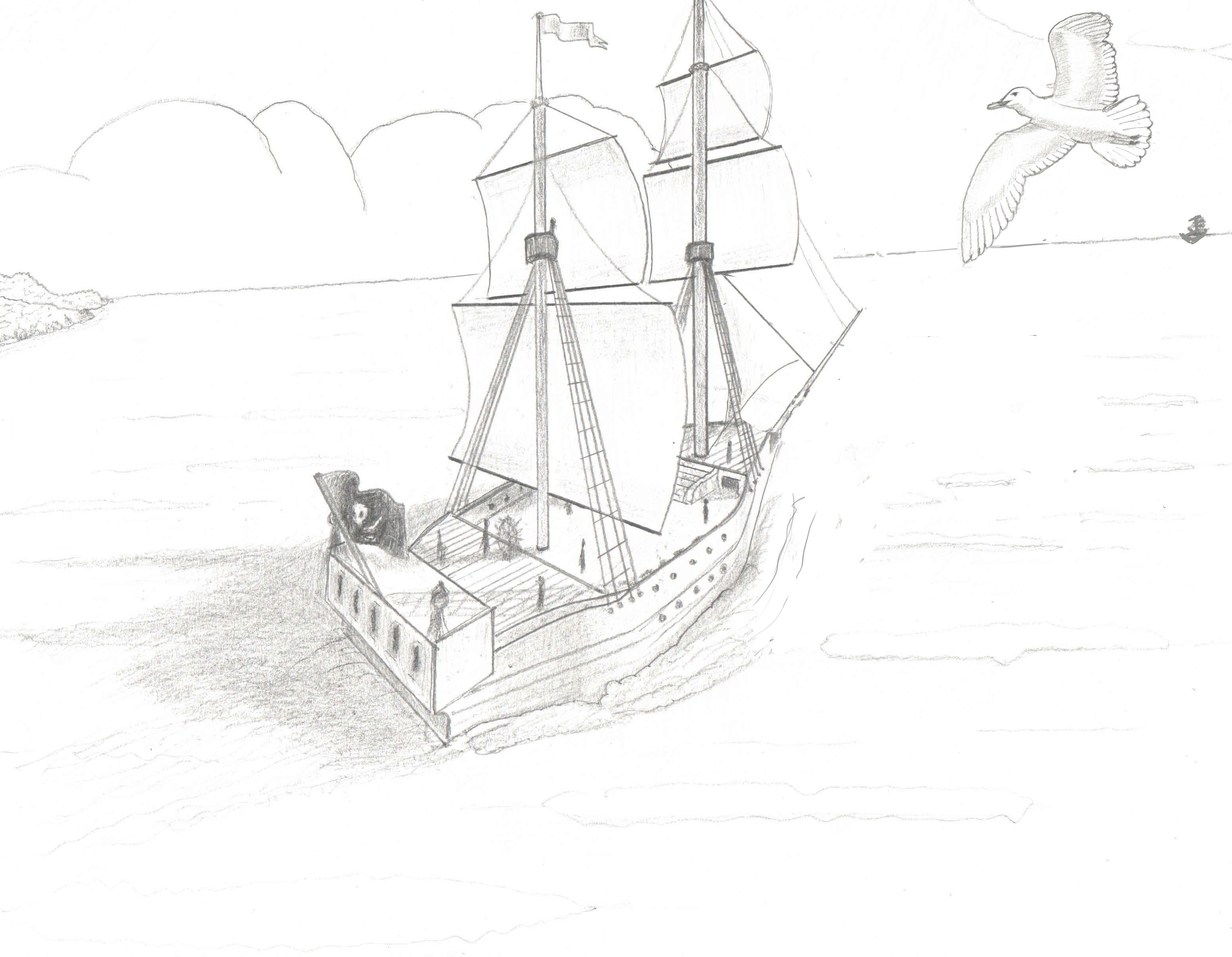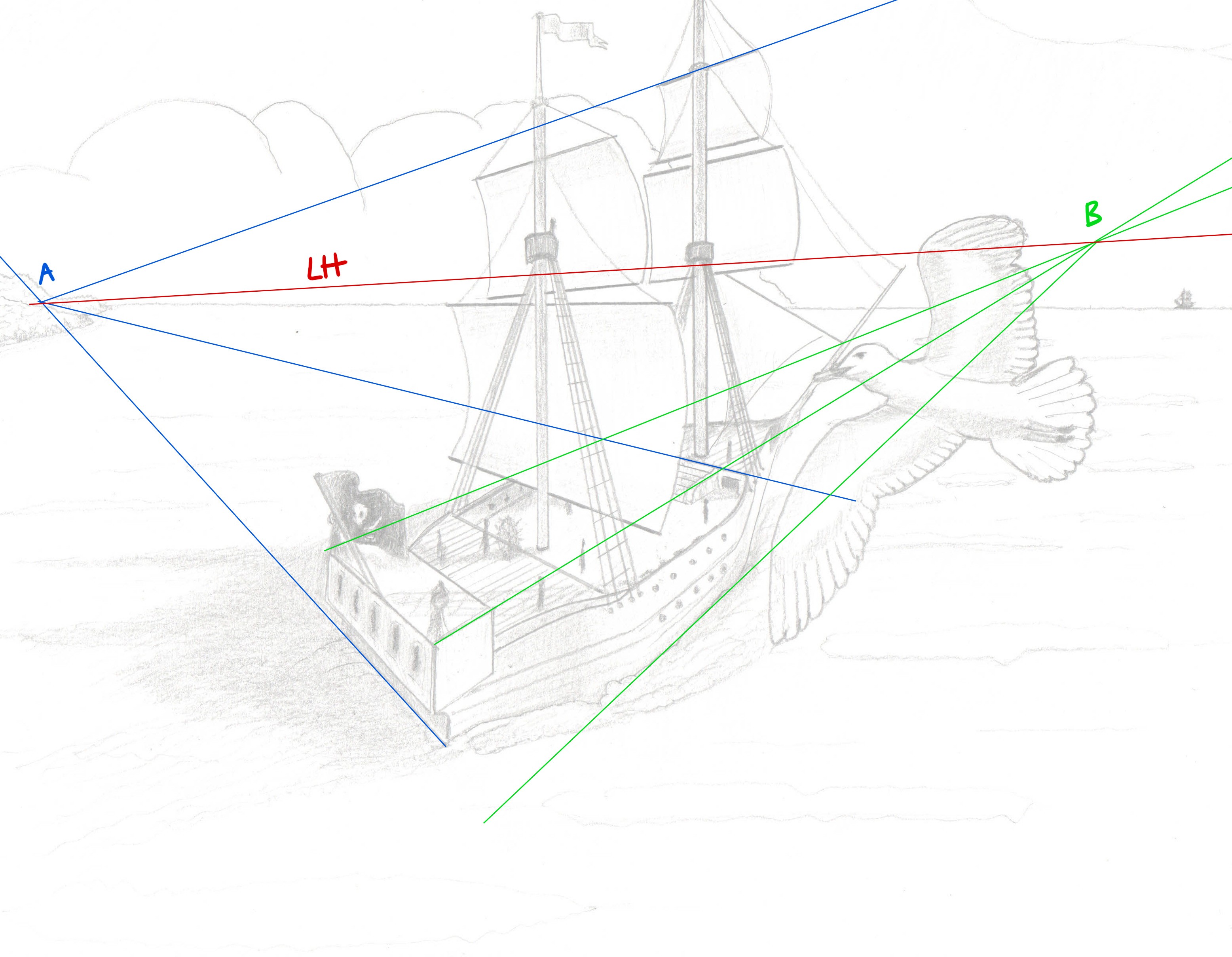 2. La perspective. Je peux clairement voir ton point de fuite placé sur la ligne que tu as choisi d'utiliser pour ton horizon. Sauf que, si on regarde ton bateau uniquement, on est sur une vue de dessus. Et surtout, on est sur une perspective à deux points de fuite, sauf que ton second point de fuite n'est visiblement pas placé sur la ligne d'horizon, mais plus haut. Le bateau que l'on voit en silhouette doit lui aussi être impacté par la perspective et donc on ne devrait pas le voir frontalement. Idem, la "figure de proue" si on peut l'appeler ainsi, le nez du bateau. Avec la perspective très forte que tu as appliqué sur ton bateau, il devrait être bien plus court. Là, sa taille est presque équivalente à la longueur du bateau, (si jamais je l'imagine de profil). Ce qui est énorme.