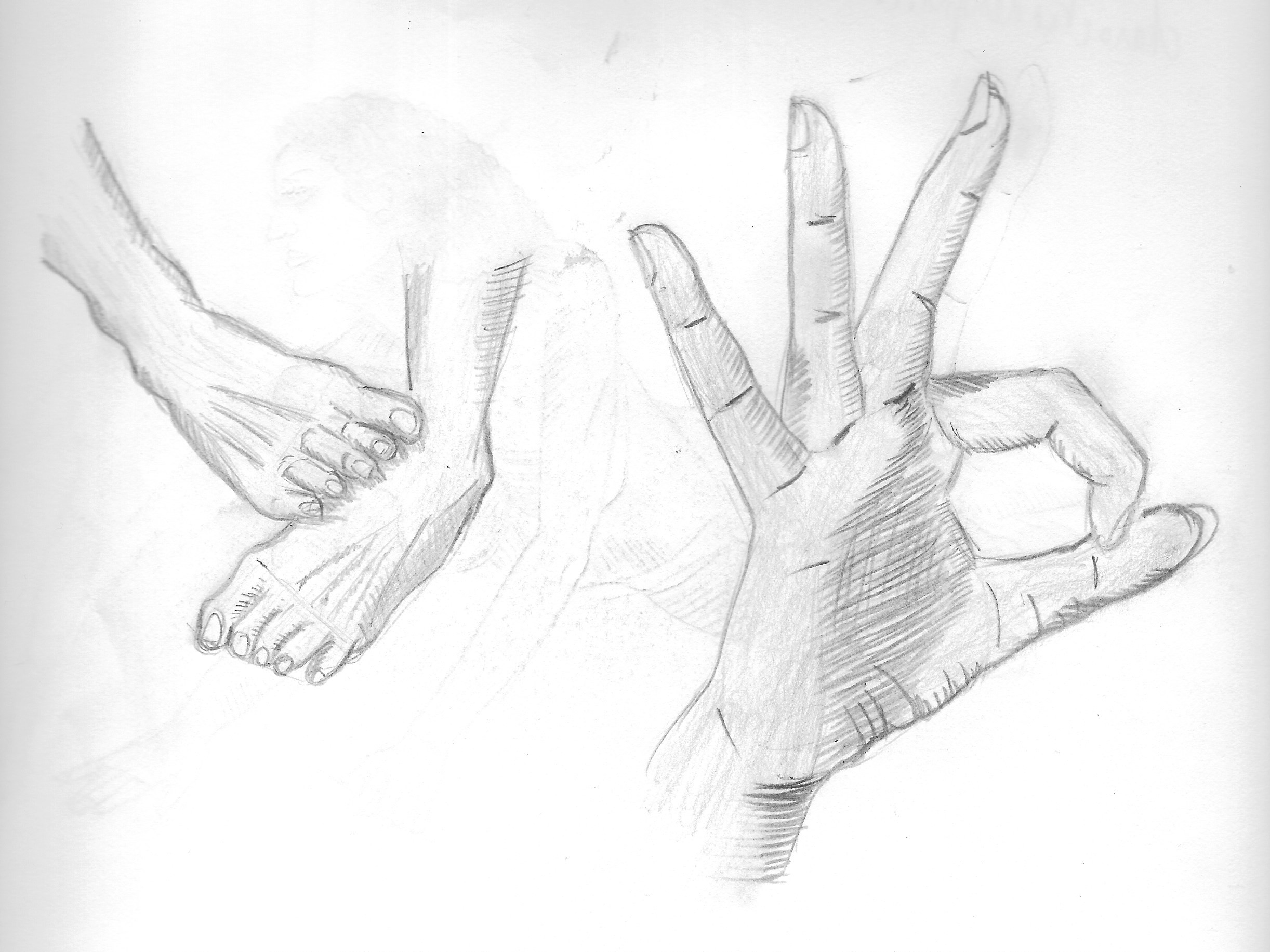 Merci de critiquer ces études de pieds et de main faites d'après photos, en 45 mn chacune (je sais, c'est trop long)... crayon hb, gomme, taille-crayon et carnet de croquis... j'ai fait tout ce que j'ai pu pour respecter les proportions et aussi pour donner du volume avec les valeurs de gris, c'est quelque chose qui me donne pas mal de soucis, et là, je suis au max de ce que je peux faire... j'ai fait un mix approximatif de hachures et de légers coups de crayons avec le côté de la mine pour les ombres et la mise en volume... peut-on faire autrement avec un crayon ? Conseils pour faire mieux bienvenus, merci d'avance.