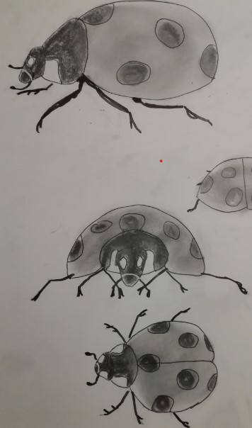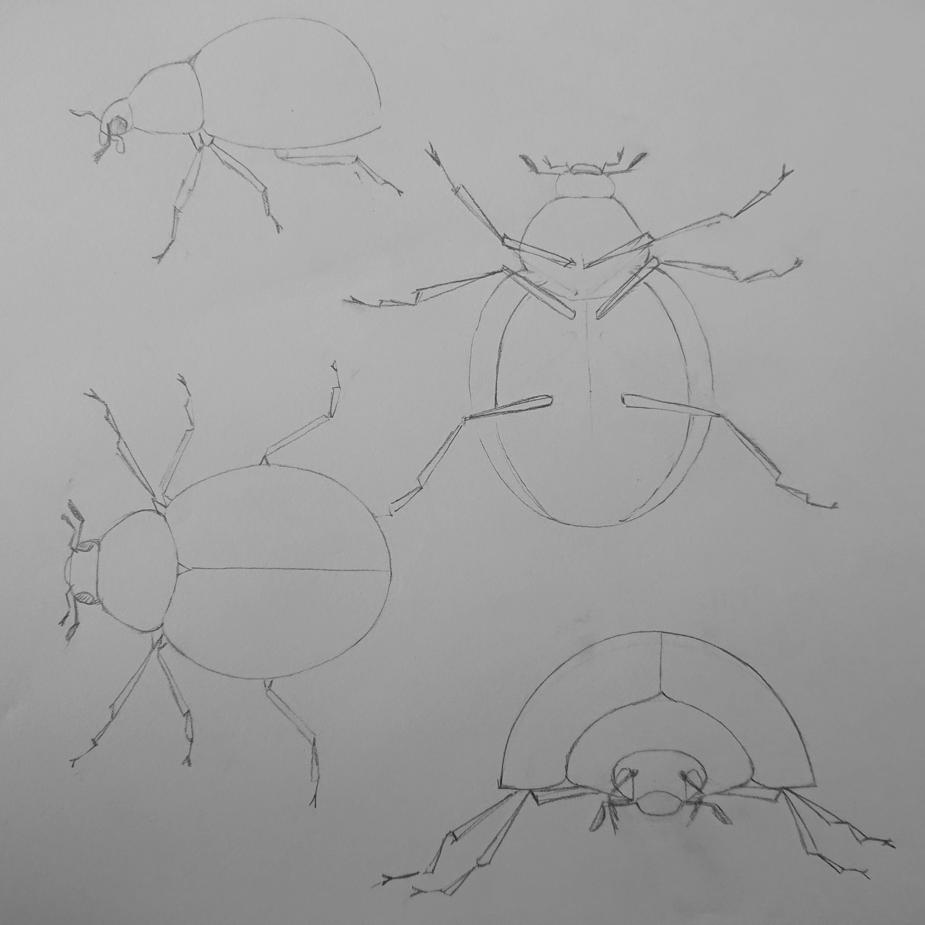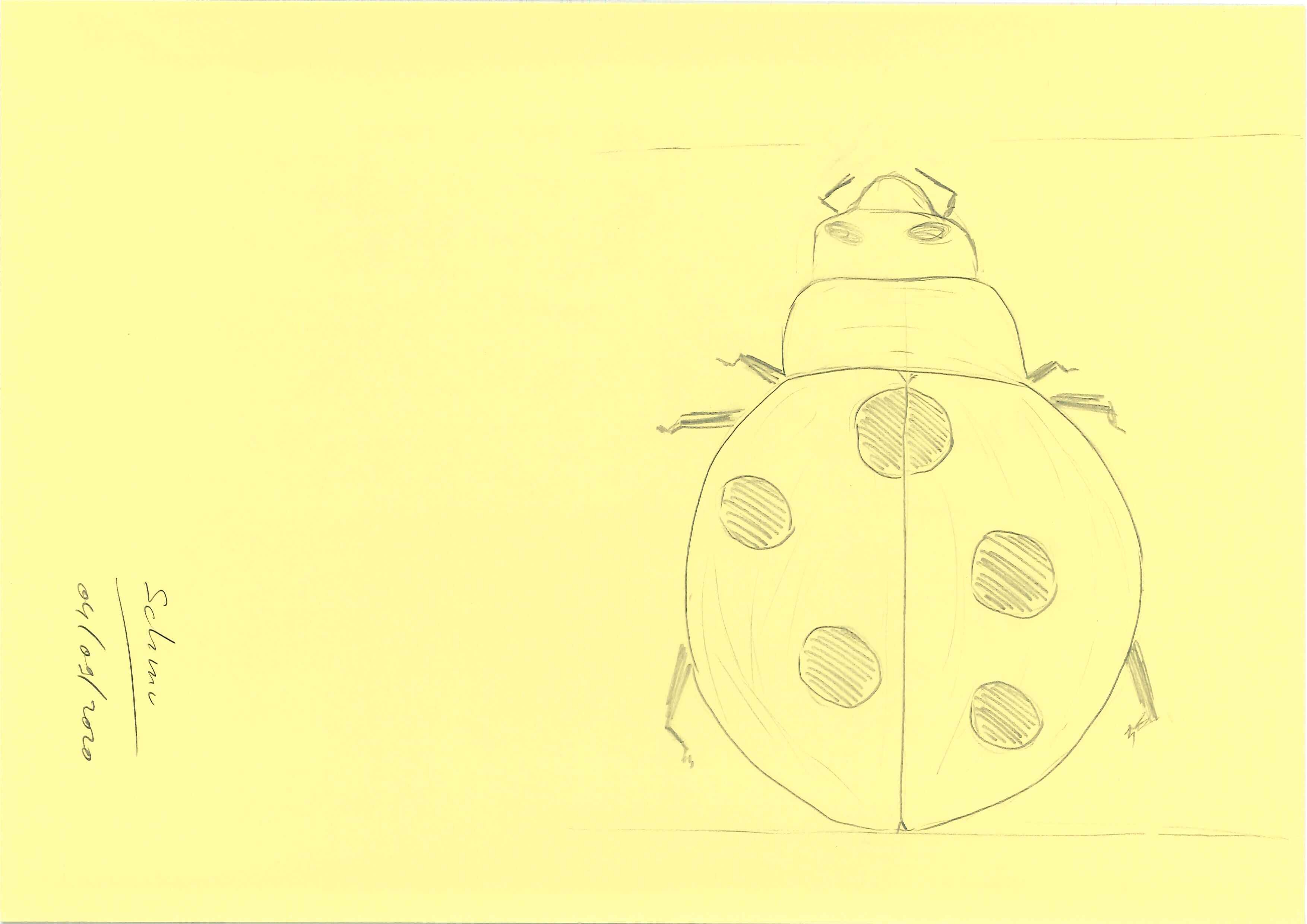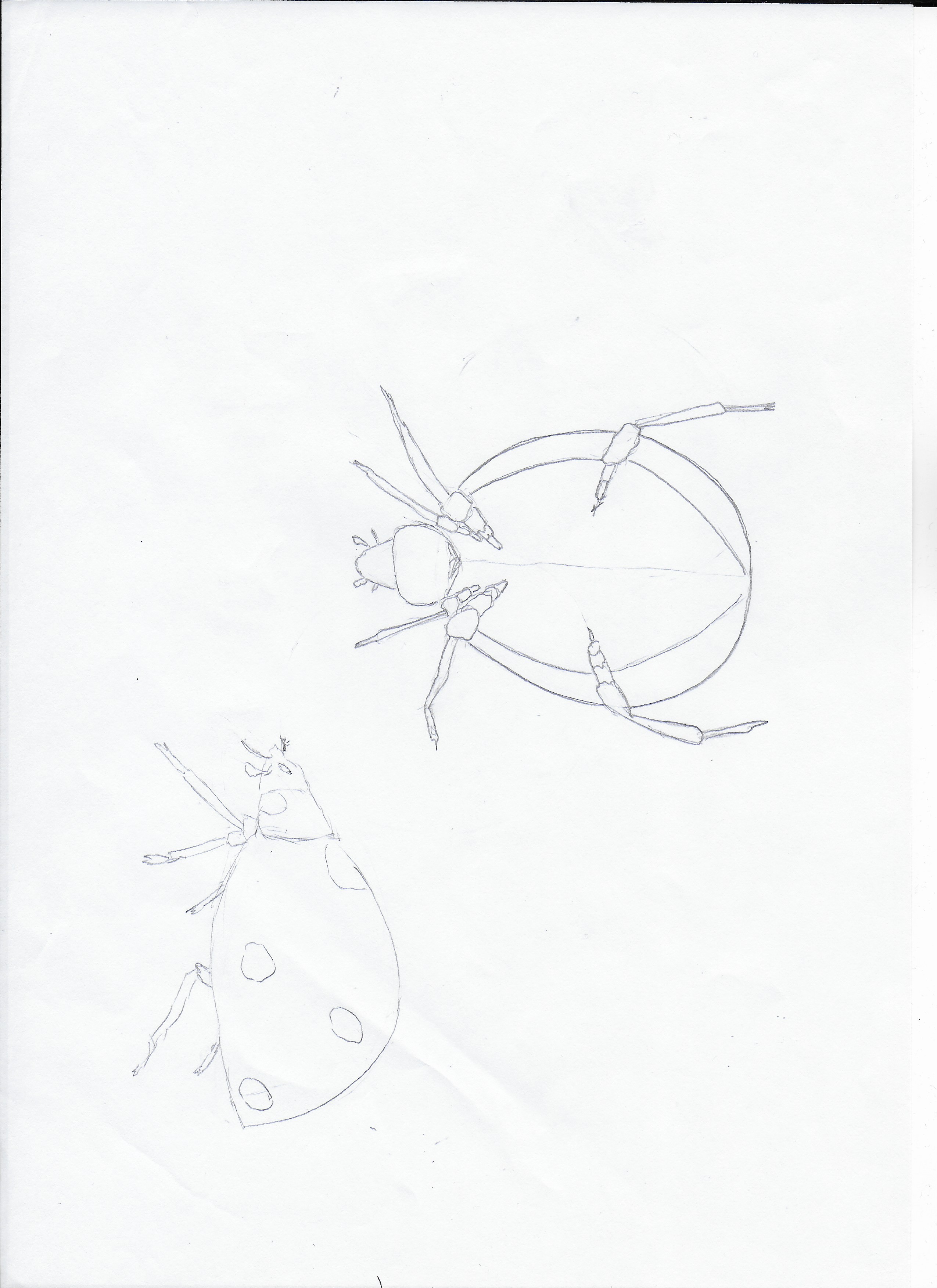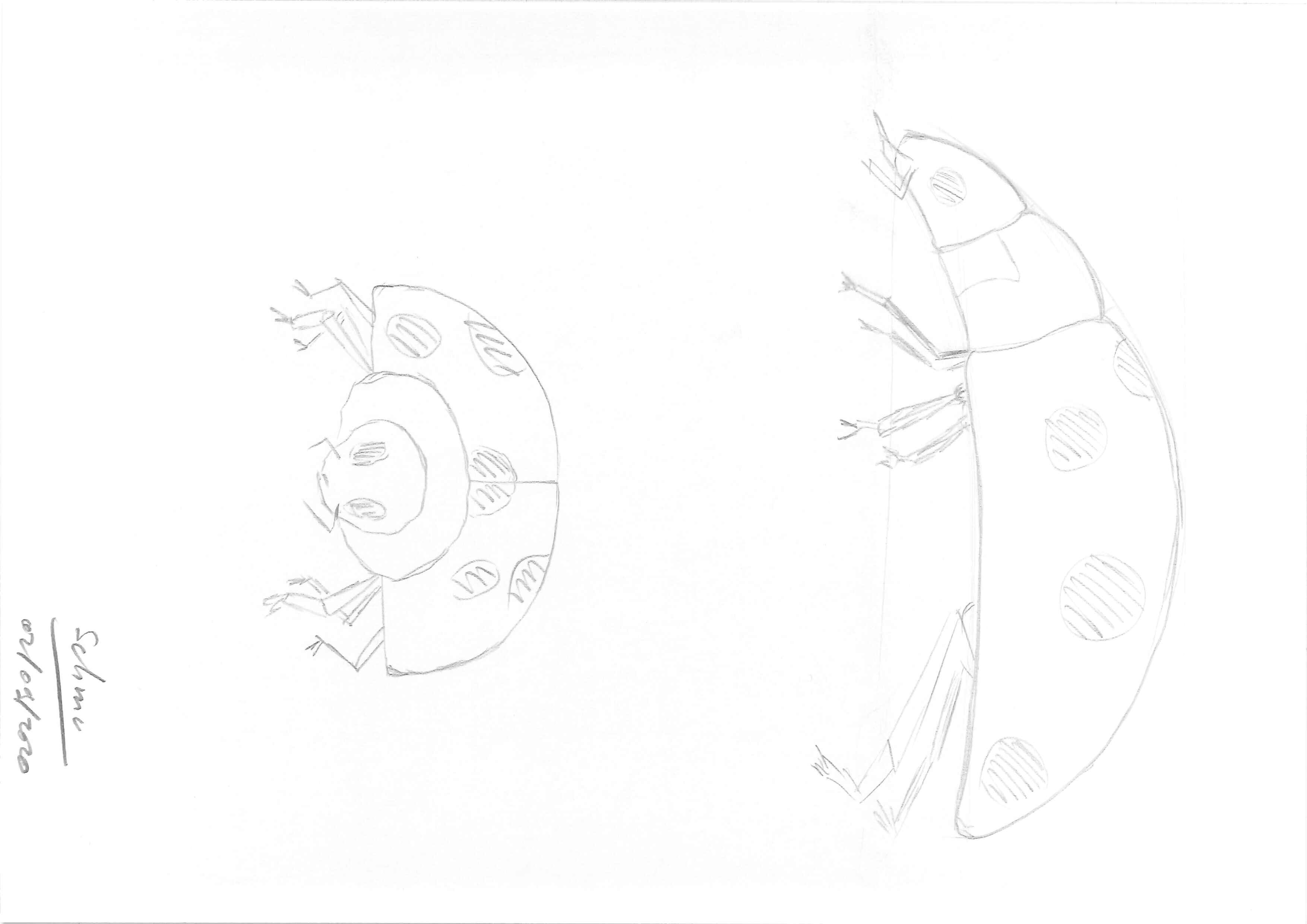Elle est très jolie cette coccinelle, bien ressemblante et tu as bien travaillé les valeurs de gris :) Maintenant je te suggère de faire l'exercice de t'imaginer cette coccinelle sous différents angles : de profil, de face, de dessus et pourquoi pas de dessous si tu veux. Pas besoin de faire des jolies ombres sur le reste de l'exercice, travailler au trait suffira. Le but est de comprendre la coccinelle en gardant les proportions dans les différents angles de vue ^^