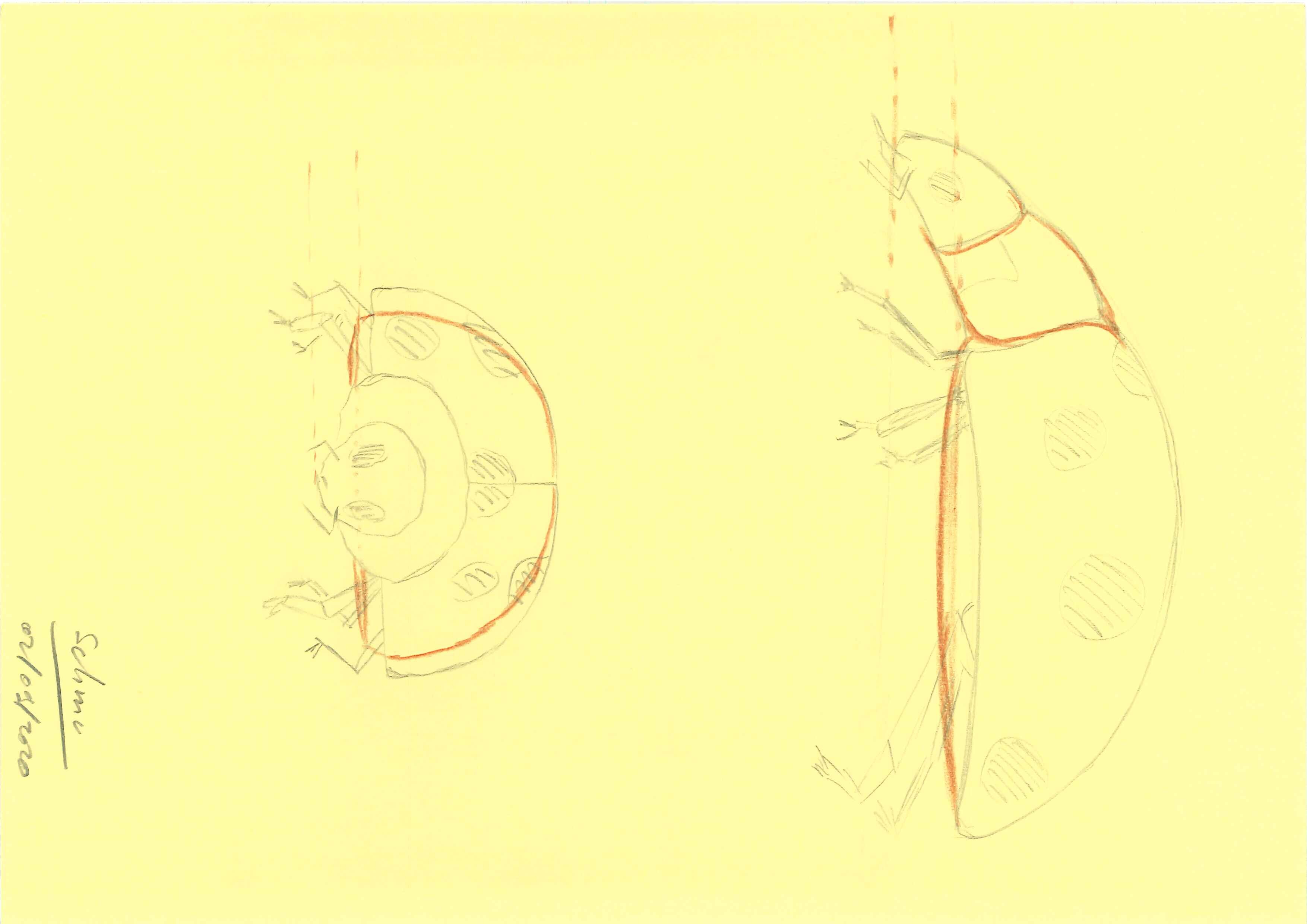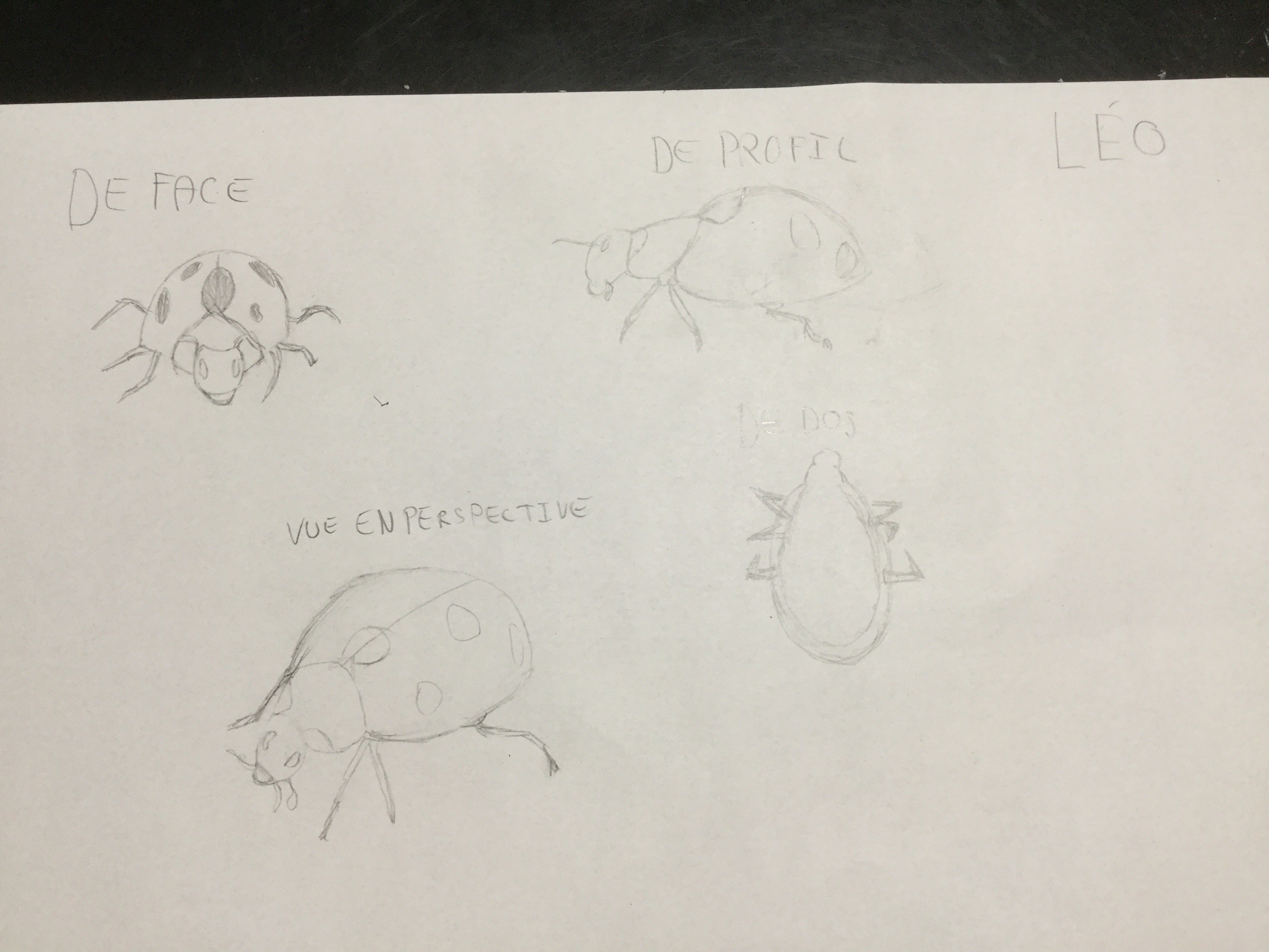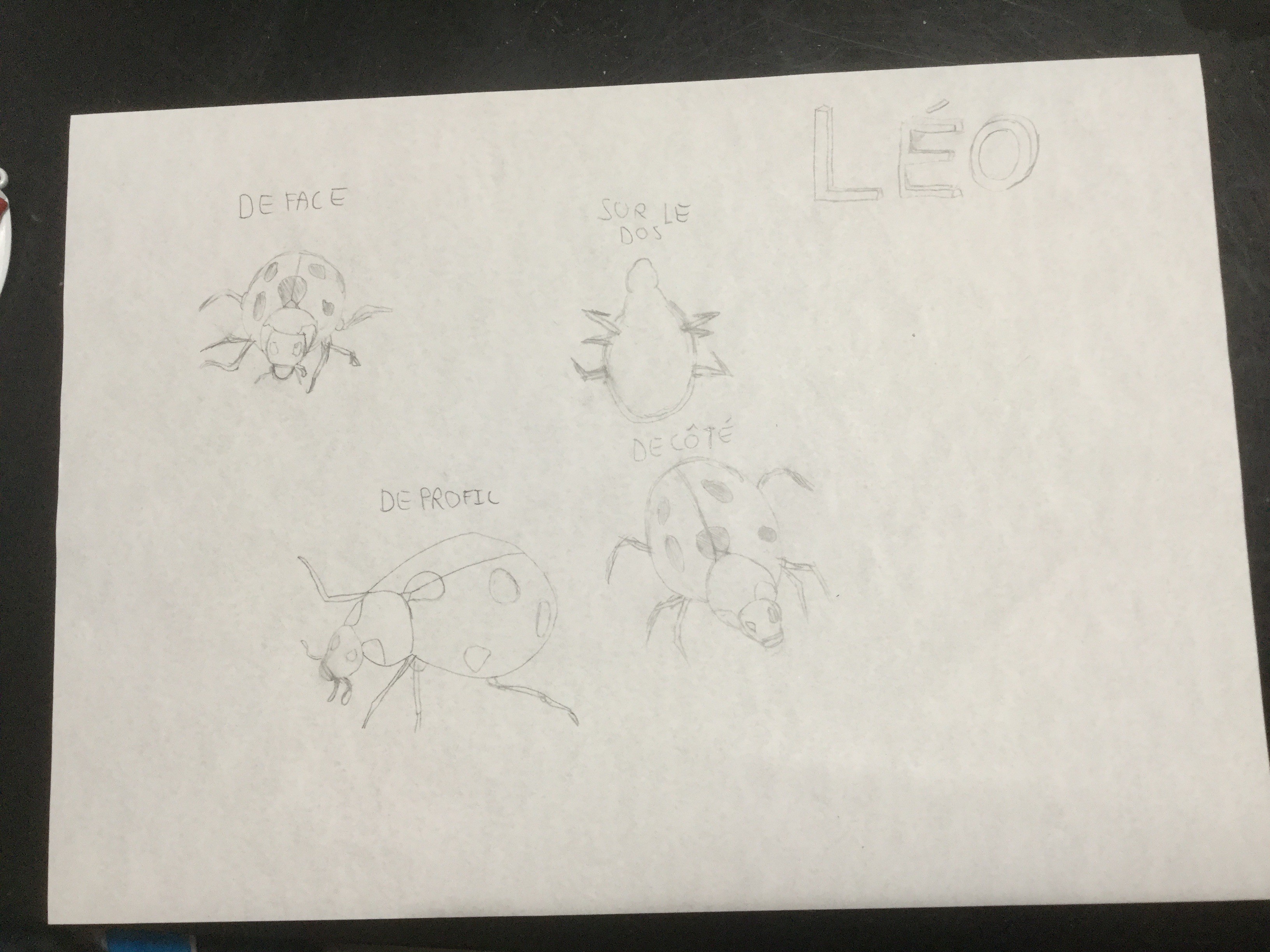 Du hast die Übung verstanden! Die Proportionen des Kopfes und des Körpers des Marienkäfers scheint zwischen den verschiedenen Ansichten gut respektiert zu sein, es funktioniert sehr gut. Andererseits scheinen mir die Beine des Marienkäfers etwas zu lange im Vergleich zur Größe seines Körpers zu sein. Ansonsten ist es sehr gut, du kannst weitermachen;)
