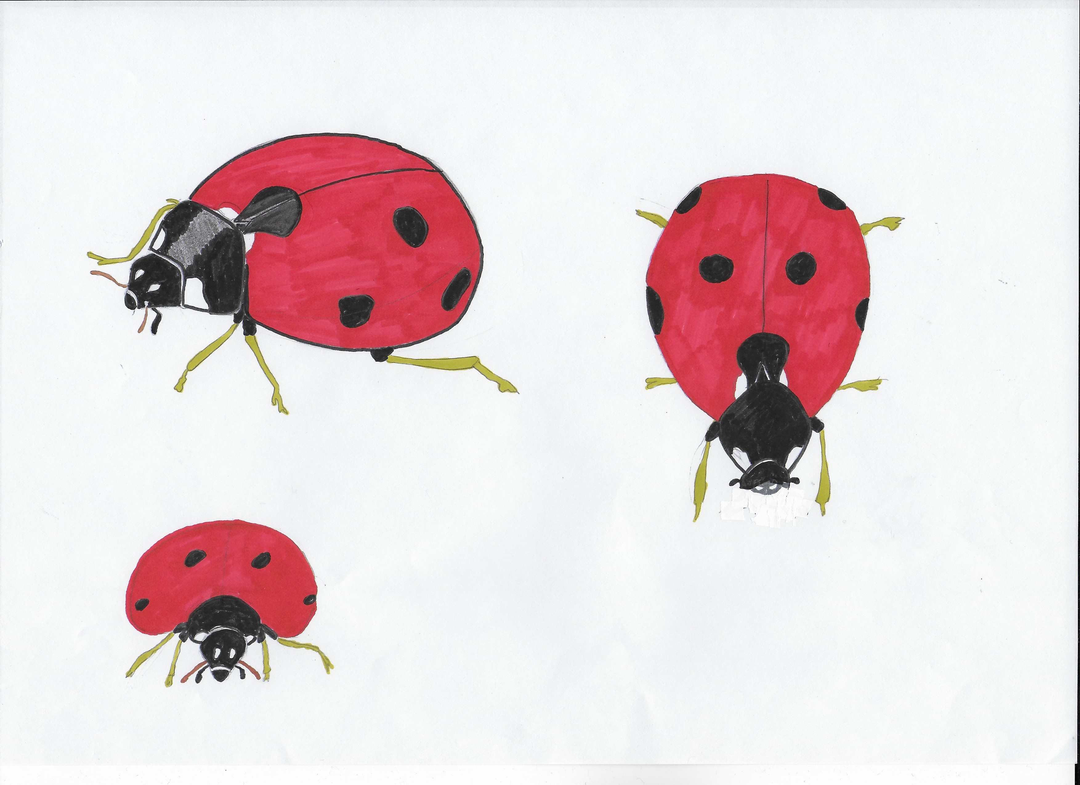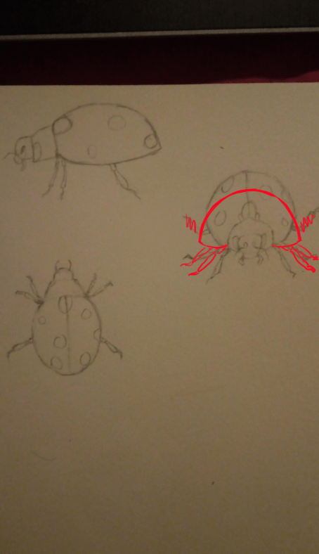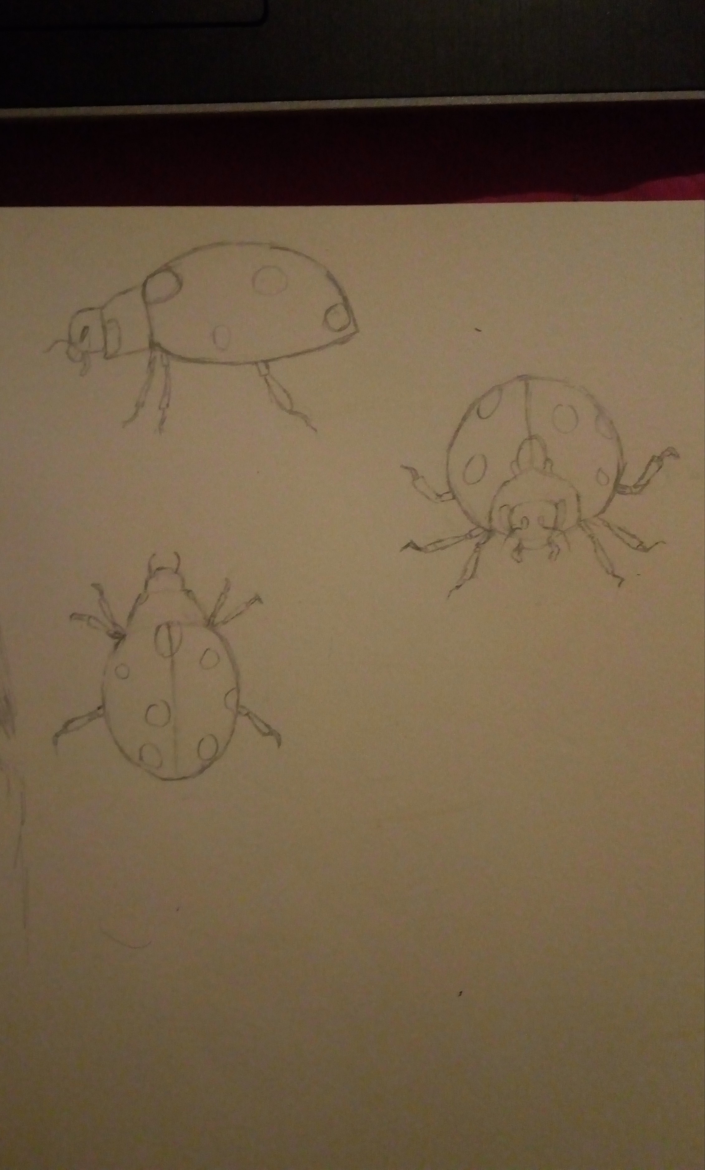 C'est mieux :) Tu as compris pour le profil cette fois, elle est pas mal :) Pour ta coccinelle en perspective, c'est mieux, mais la ligne au milieu de son corps ne suit pas bien sa courbure, ce qui lui donne l'air encore un peu plate. Pour celle sur le dos, la tête et la zone derrière sont un peu trop petites, et le corps est un peu trop en longueur et pas assez large. Pour la coccinelle de face ça marche bien mieux pour le corps :) Concernant les pattes arrières, elles ont encore l'air trop hautes, il faut penser que la coccinelle est sur une surface plate et que toutes ses pattes sont au même niveau par rapport au sol, ses pattes arrières devraient donc être plus basses pour toucher le sol. Tu as bien travaillé, ça progresse :)