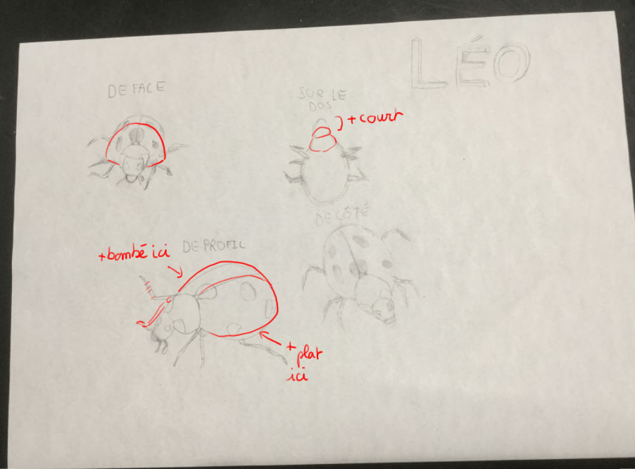 Joli travail ! C'est pas mal malgré quelques soucis. La vue que tu as appelé "de profil" n'est pas vraiment une vue de profil, mais la vue en perspective du modèle de base. C'est bien de la faire mais du coup tu n'as pas de vraie vue de profil sur ta planche. D'ailleurs elle est plutôt bien, il faut juste faire attention à la forme du corps, plus bombée au dessus, plus plate sur le dessous, et à ce que la patte derrière touche bien le sol. Pour ta vue de côté, je n'ai pas trop compris ce que tu voulais faire, on dirait la même que ta vue de face mais tournée. "De côté" peut vouloir dire "de profil", je t'invite à faire une vue de profil à la place. Imagine toi baissé au niveau de la coccinelle et pas du dessus à la regarder pile de profil. Pour la vue de face c'est pas mal, mais son côté sphérique fait comme si elle était vue de dessus. Pour celle sur le dos, la proportion de la tête est un peu longue par rapport au morceau derrière. Je t'ai fait des croquis de correction, n'hésite pas à me poser des questions à la moindre incompréhension ^^