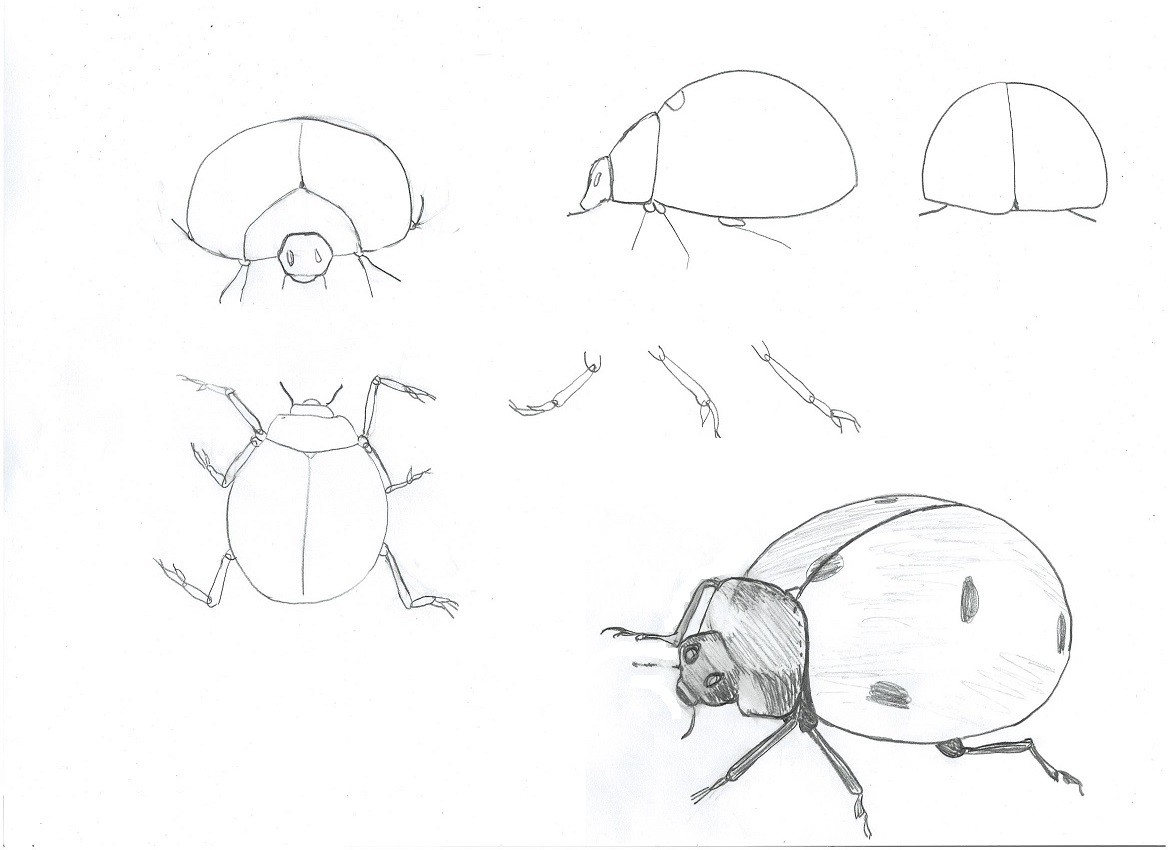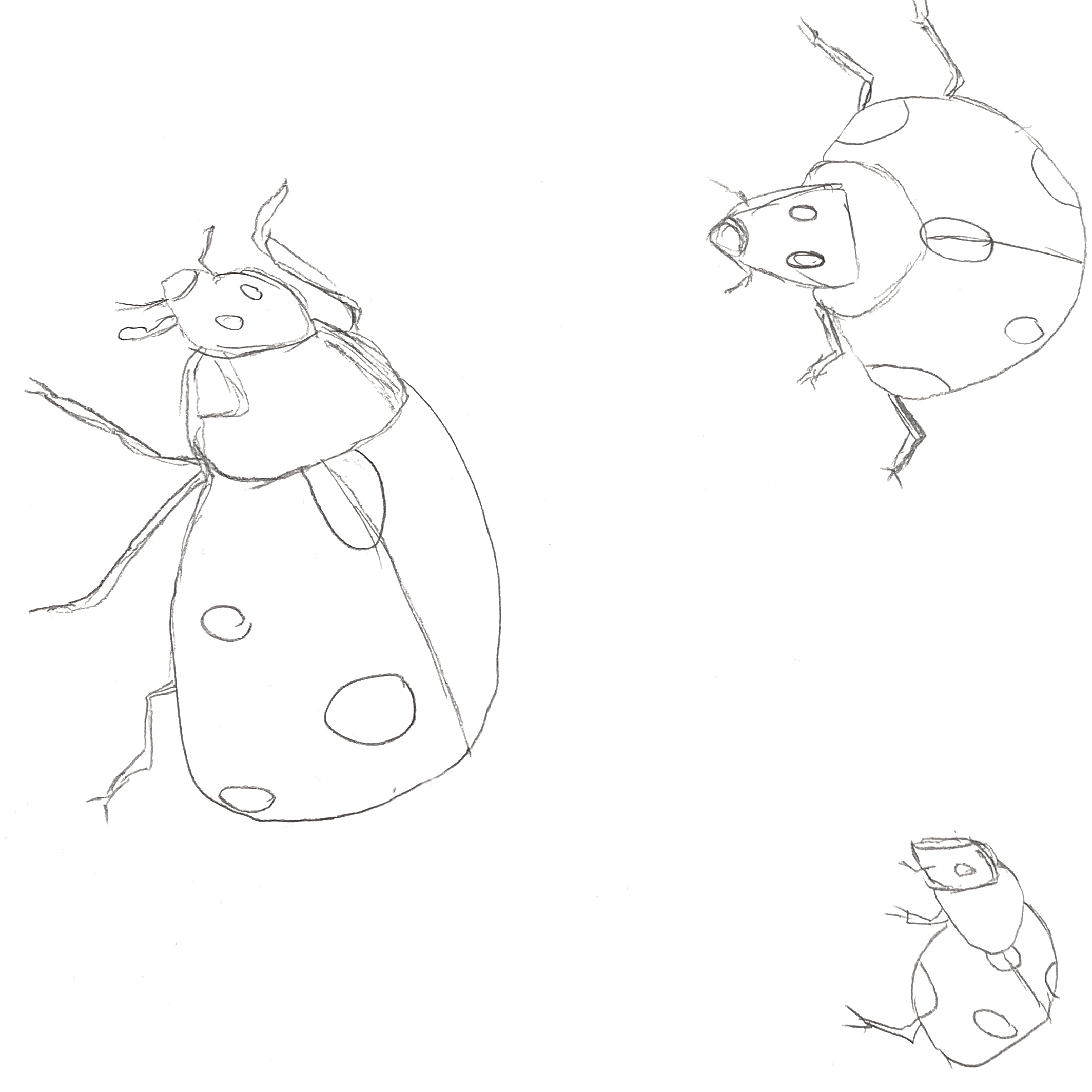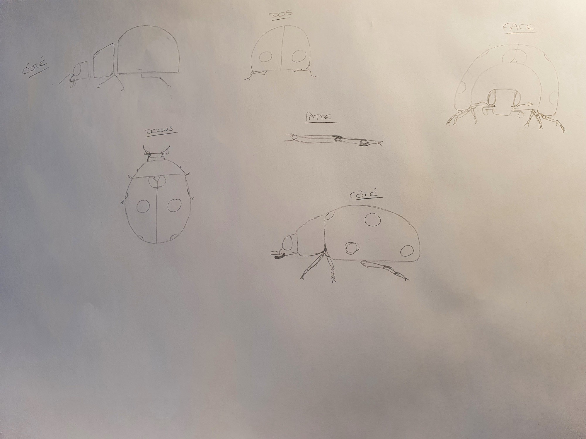 Voici mon étude de la coccinelle. Ca m'a paru compliqué d'essayer d'avoir les bonnes proportions entre les 3 parties. Que pensez-vous du résultat, svp ?
