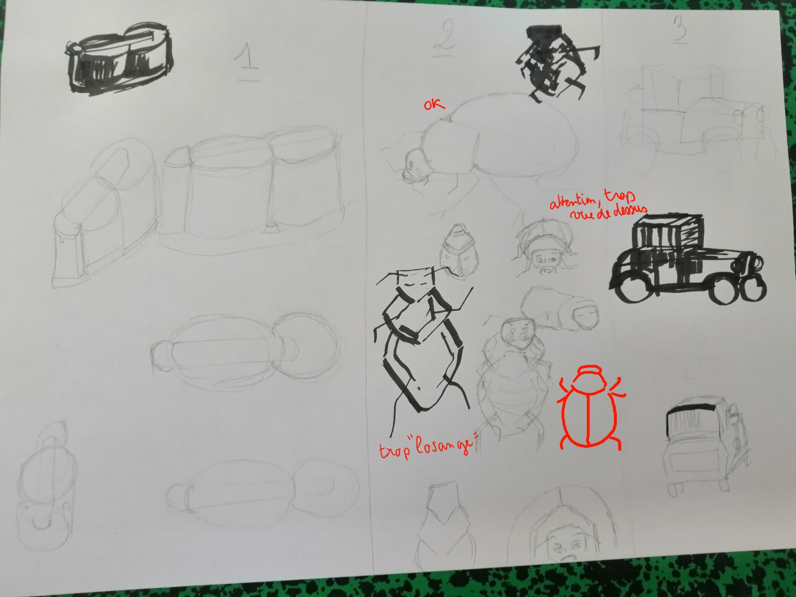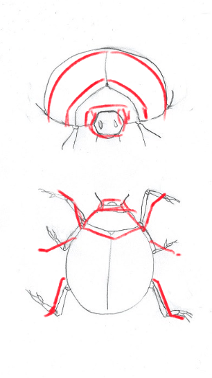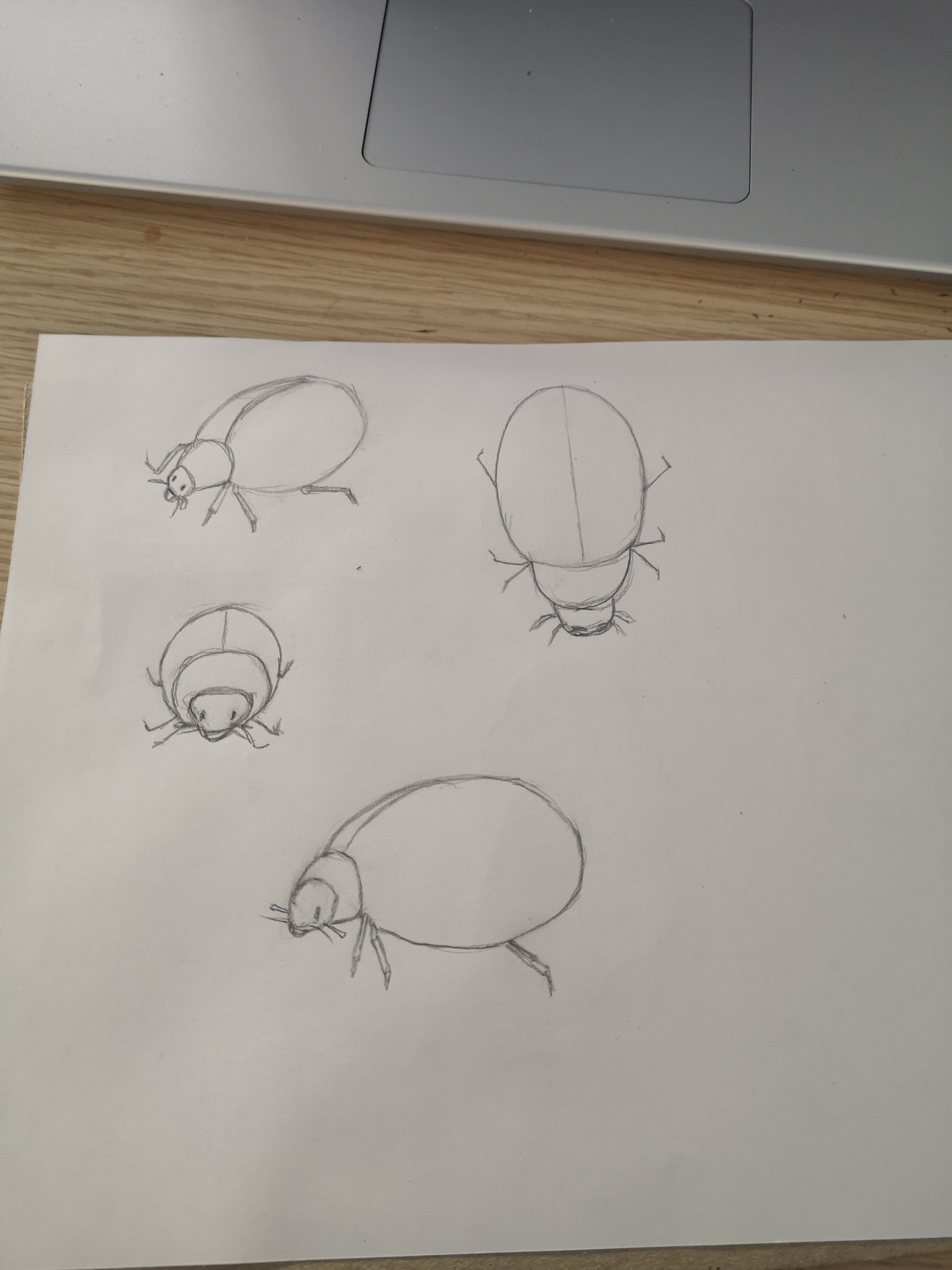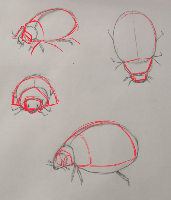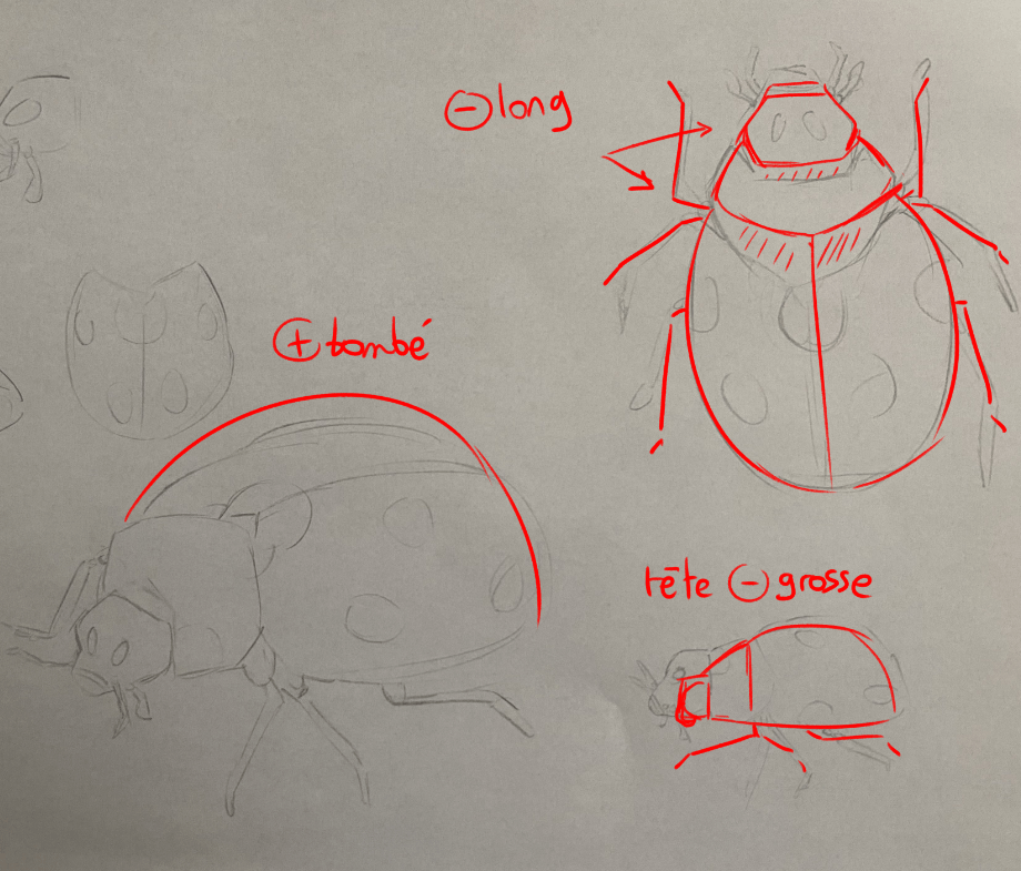 Voici mon étude de la coccinelle. Ca m'a paru compliqué d'essayer d'avoir les bonnes proportions entre les 3 parties. Que pensez-vous du résultat, svp ?