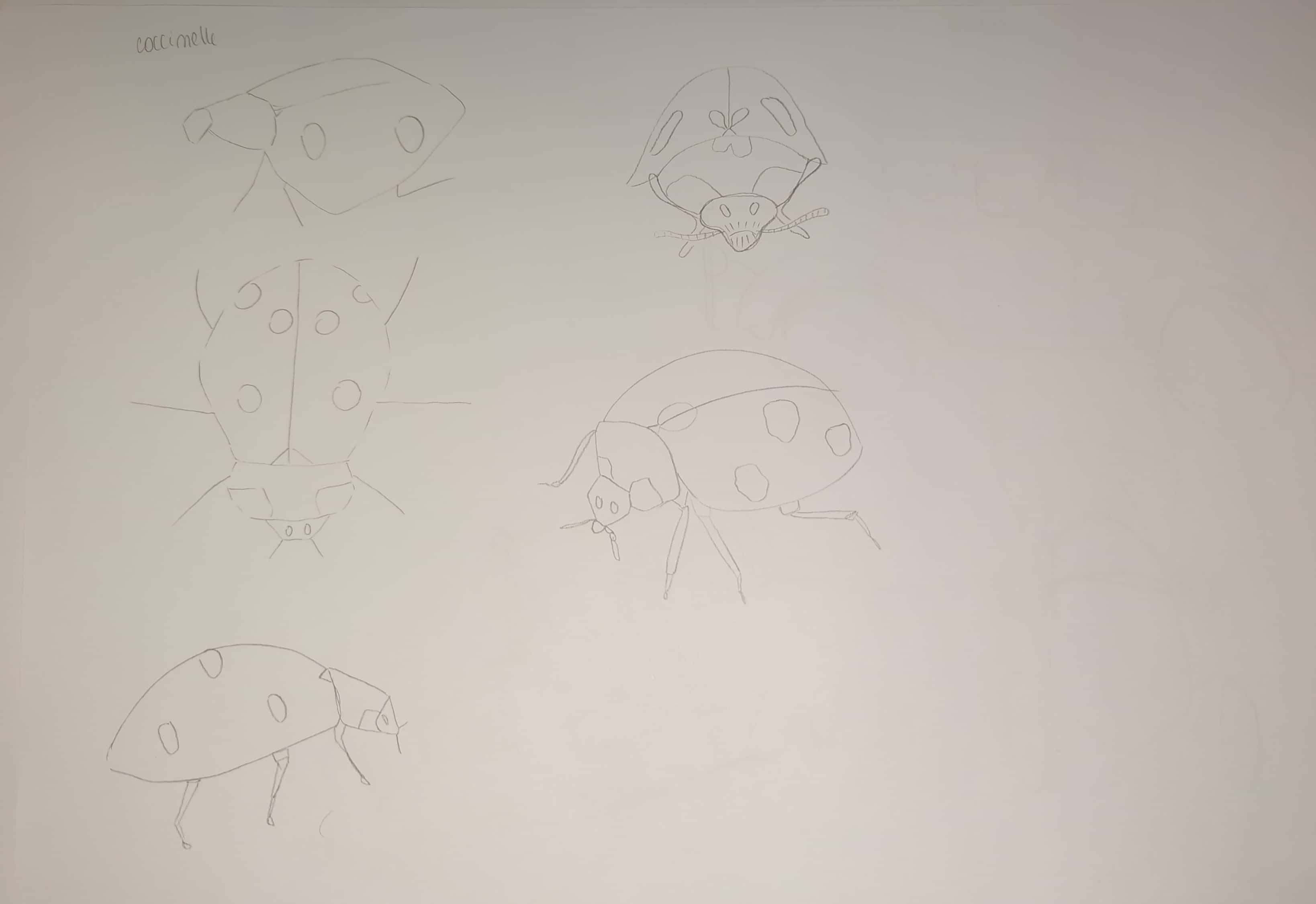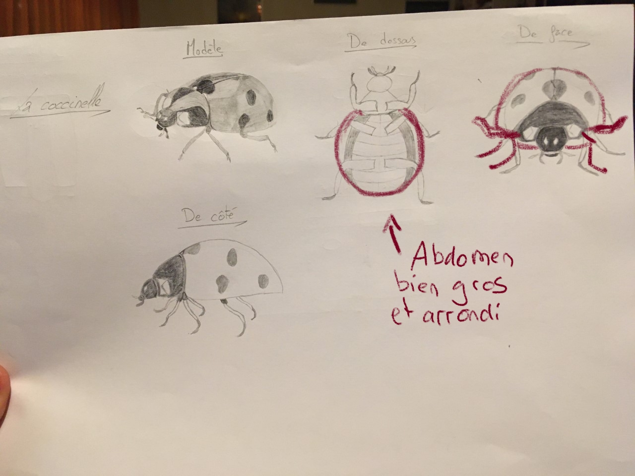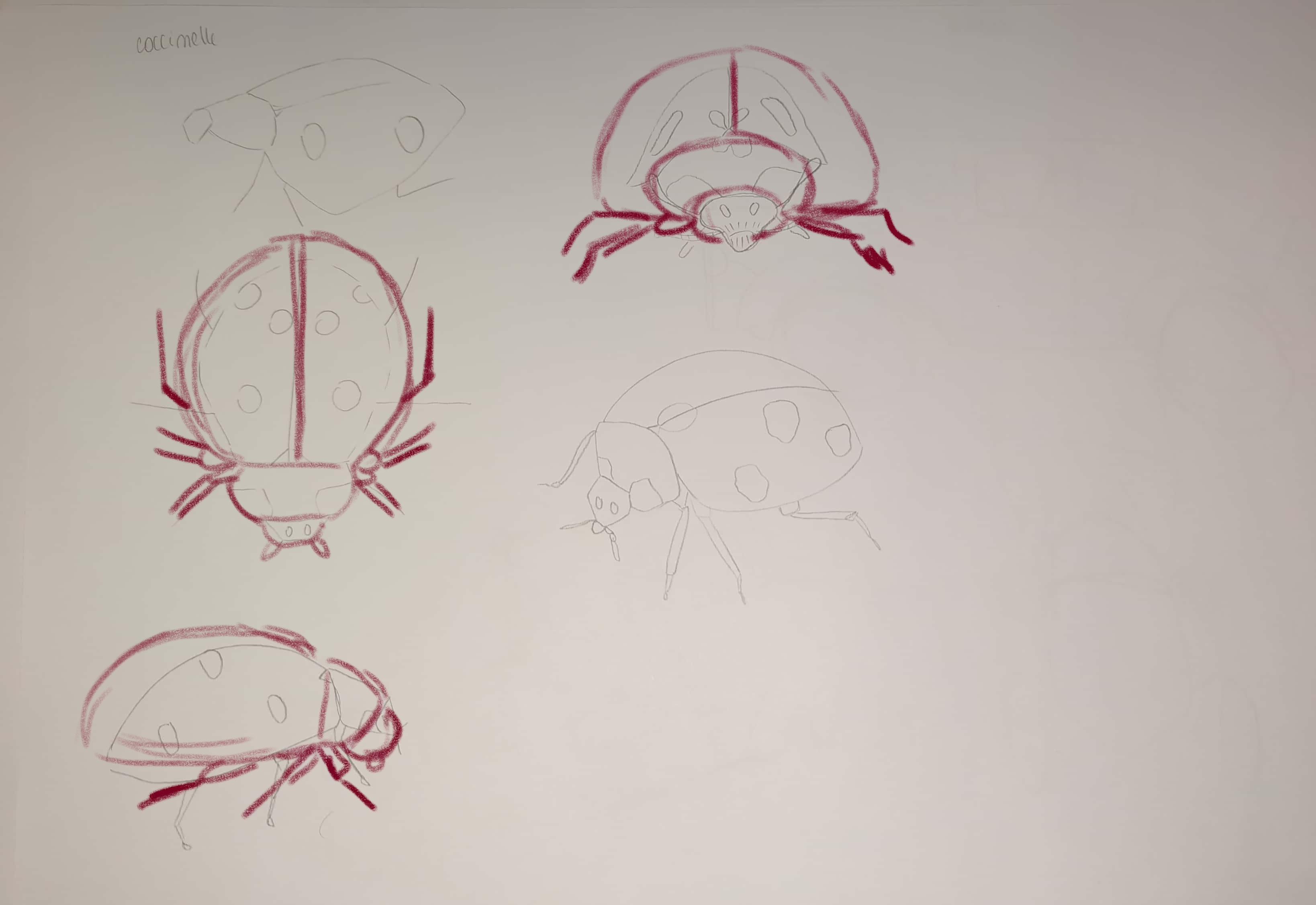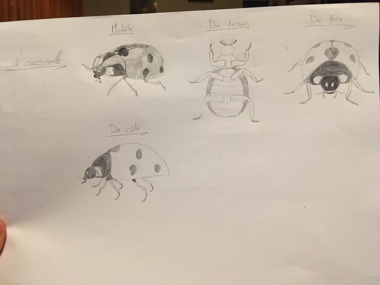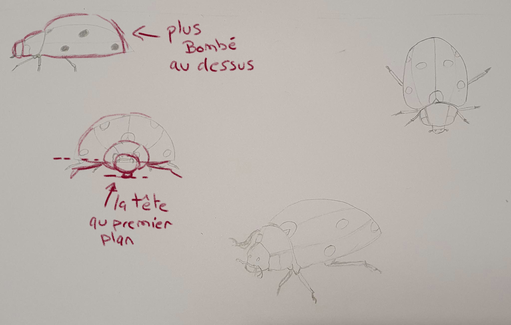 Super, on voit que tu t'es beaucoup amusé à étudier l'anatomie de la coccinelle! Là encore fais attention au volume de l'abdomen.