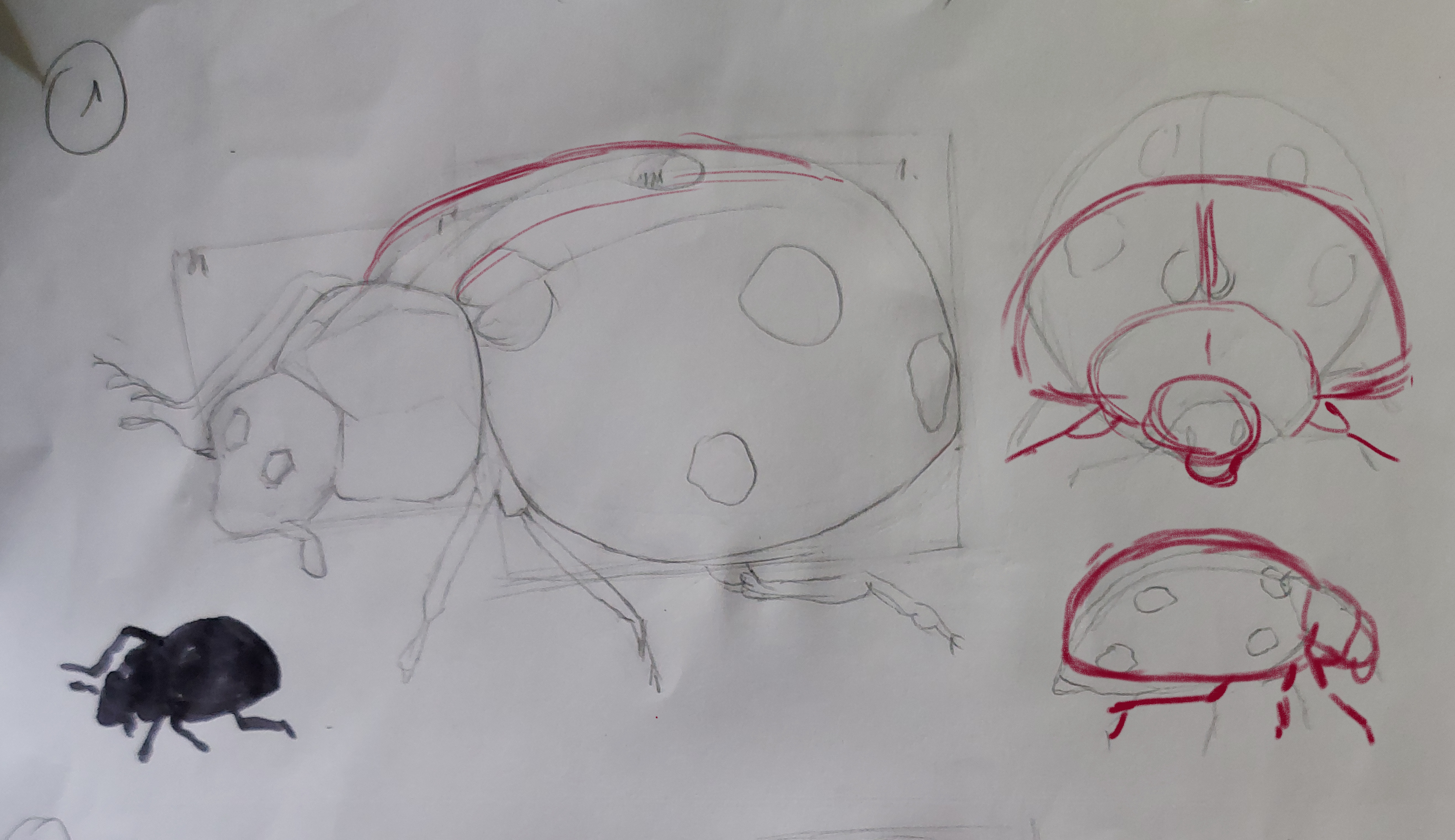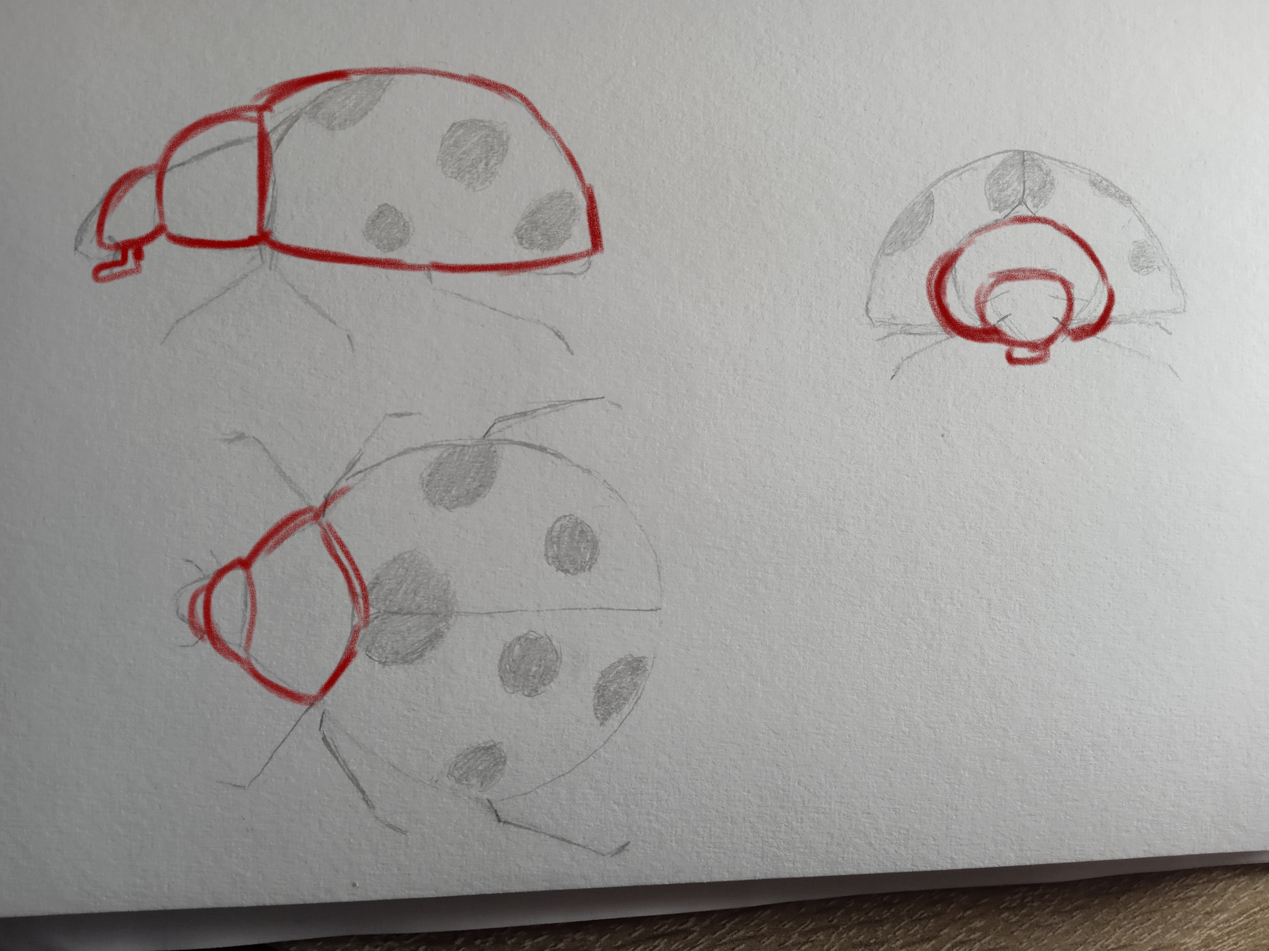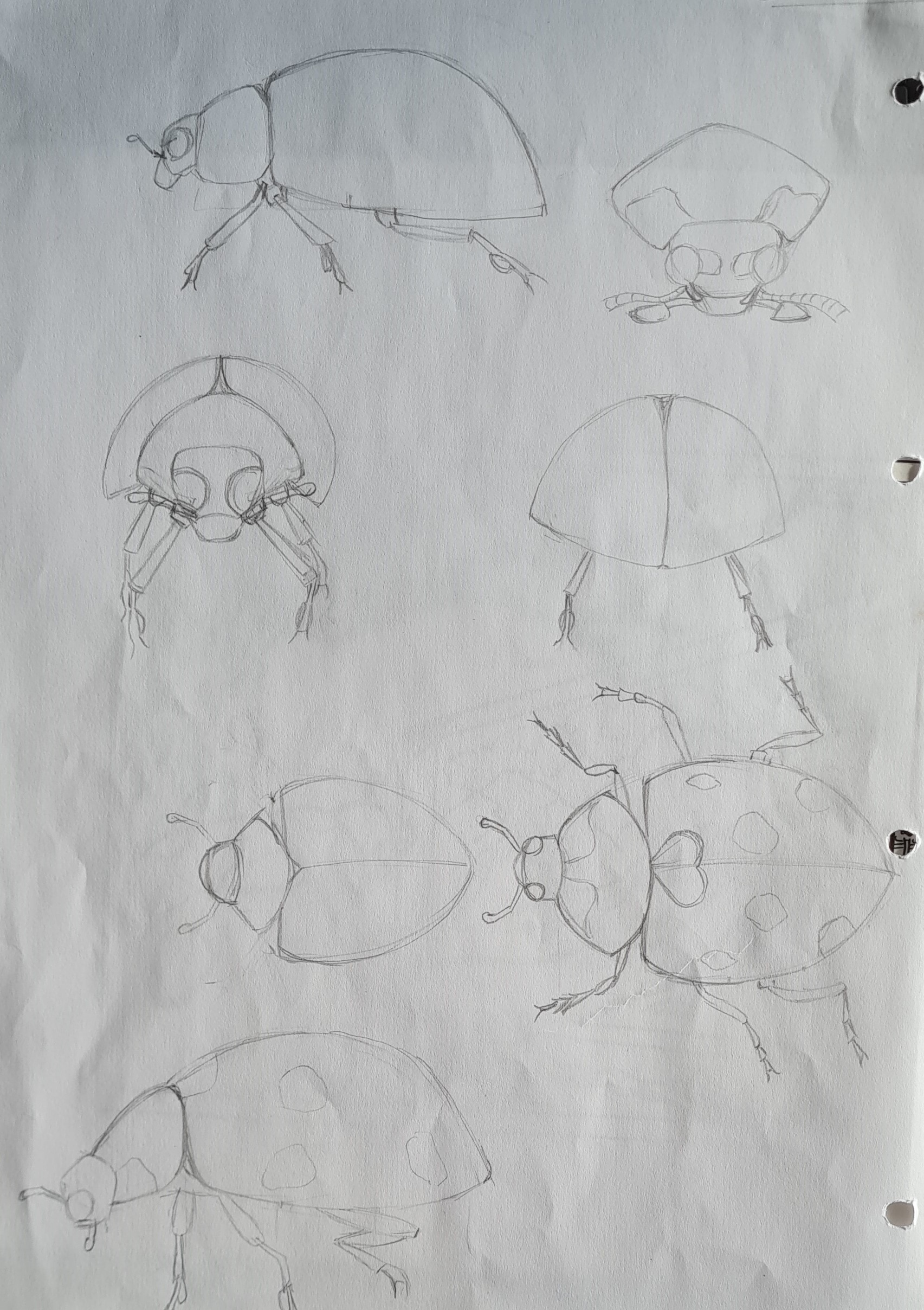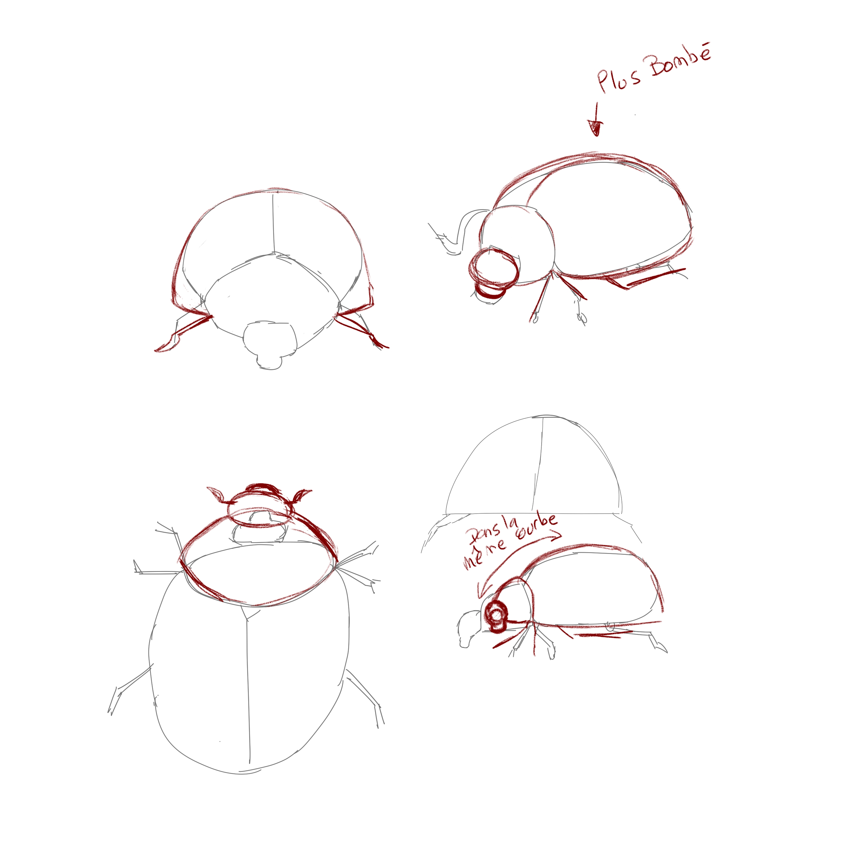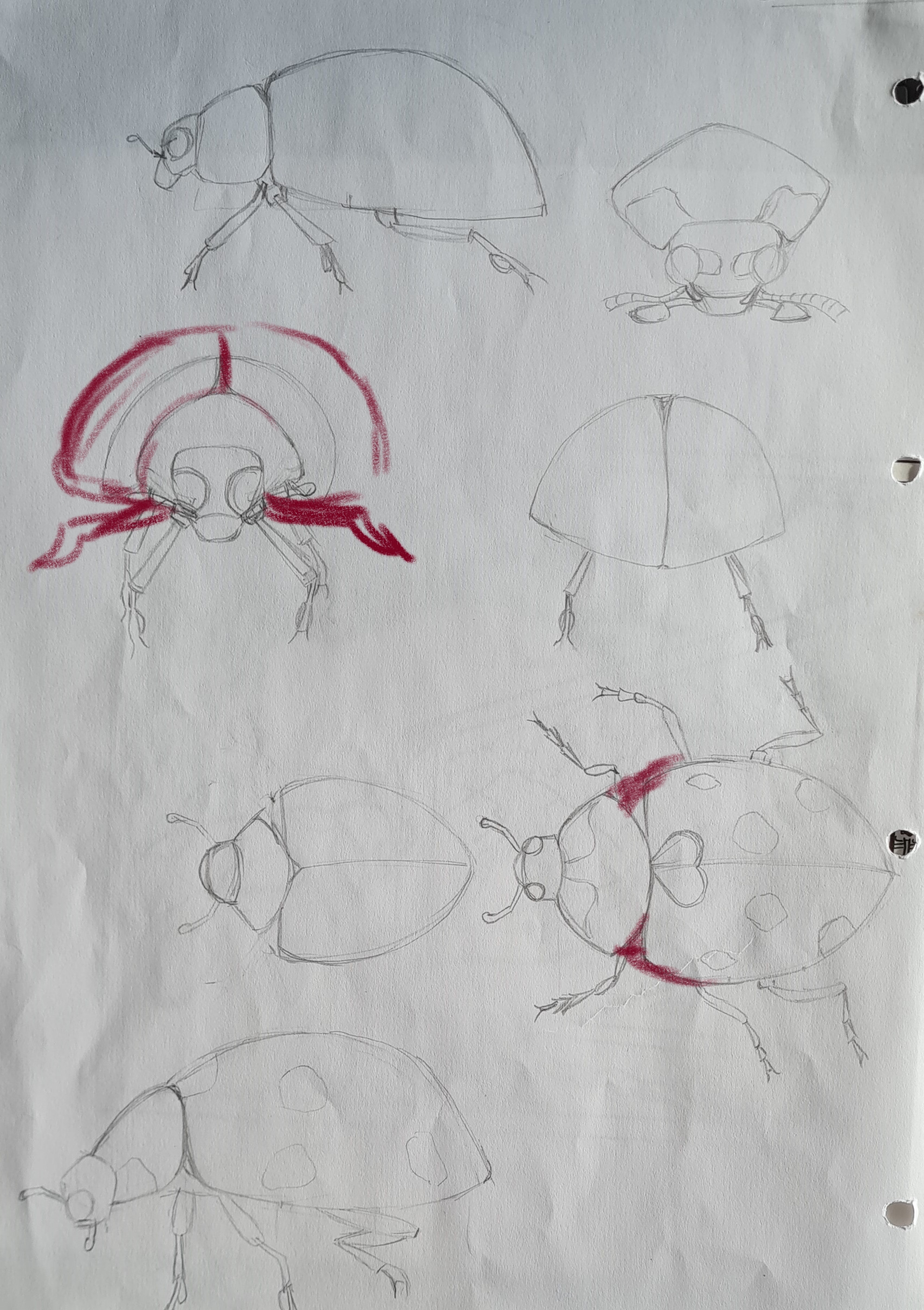 Super, on voit que tu t'es beaucoup amusé à étudier l'anatomie de la coccinelle! Là encore fais attention au volume de l'abdomen.