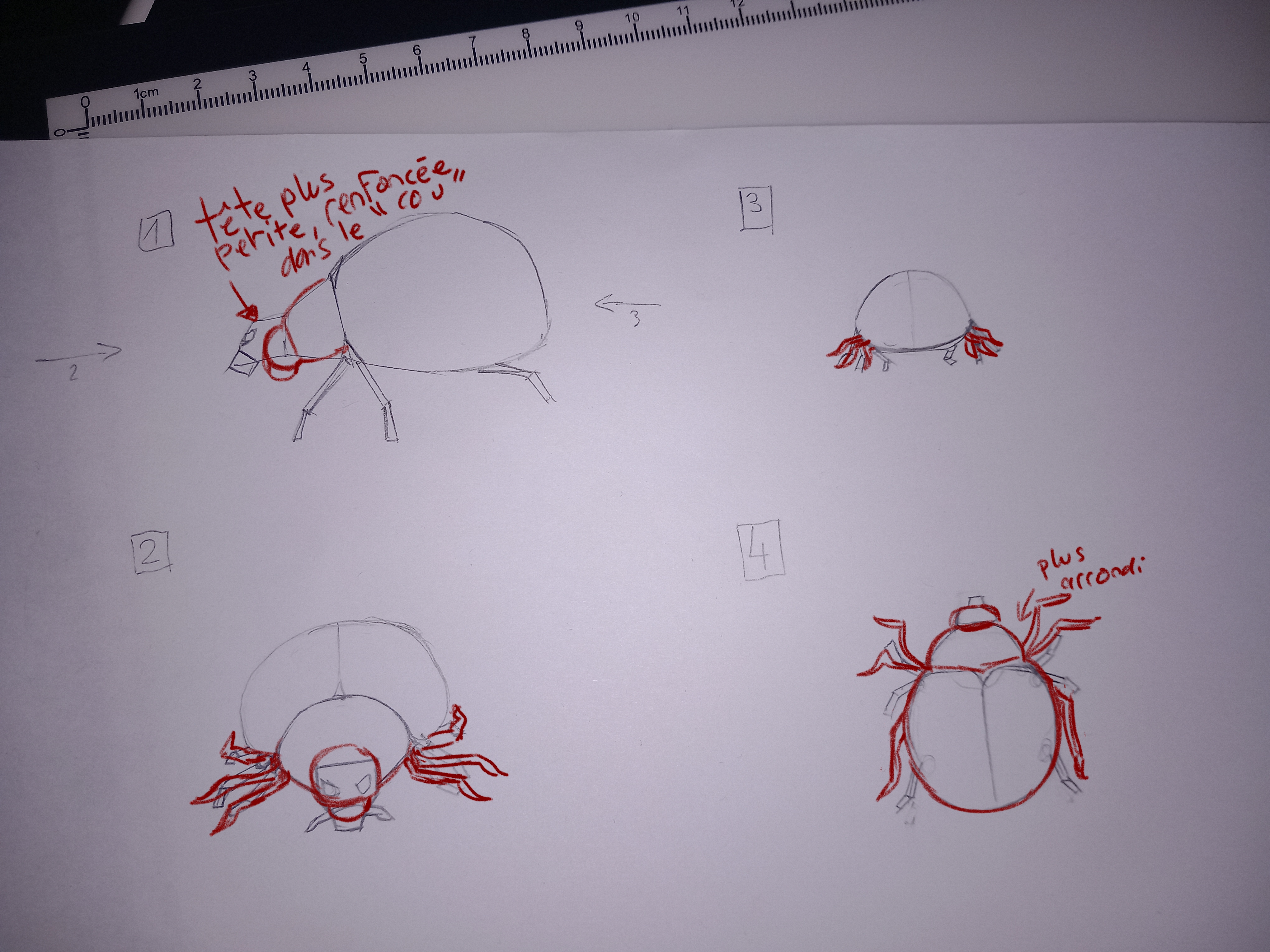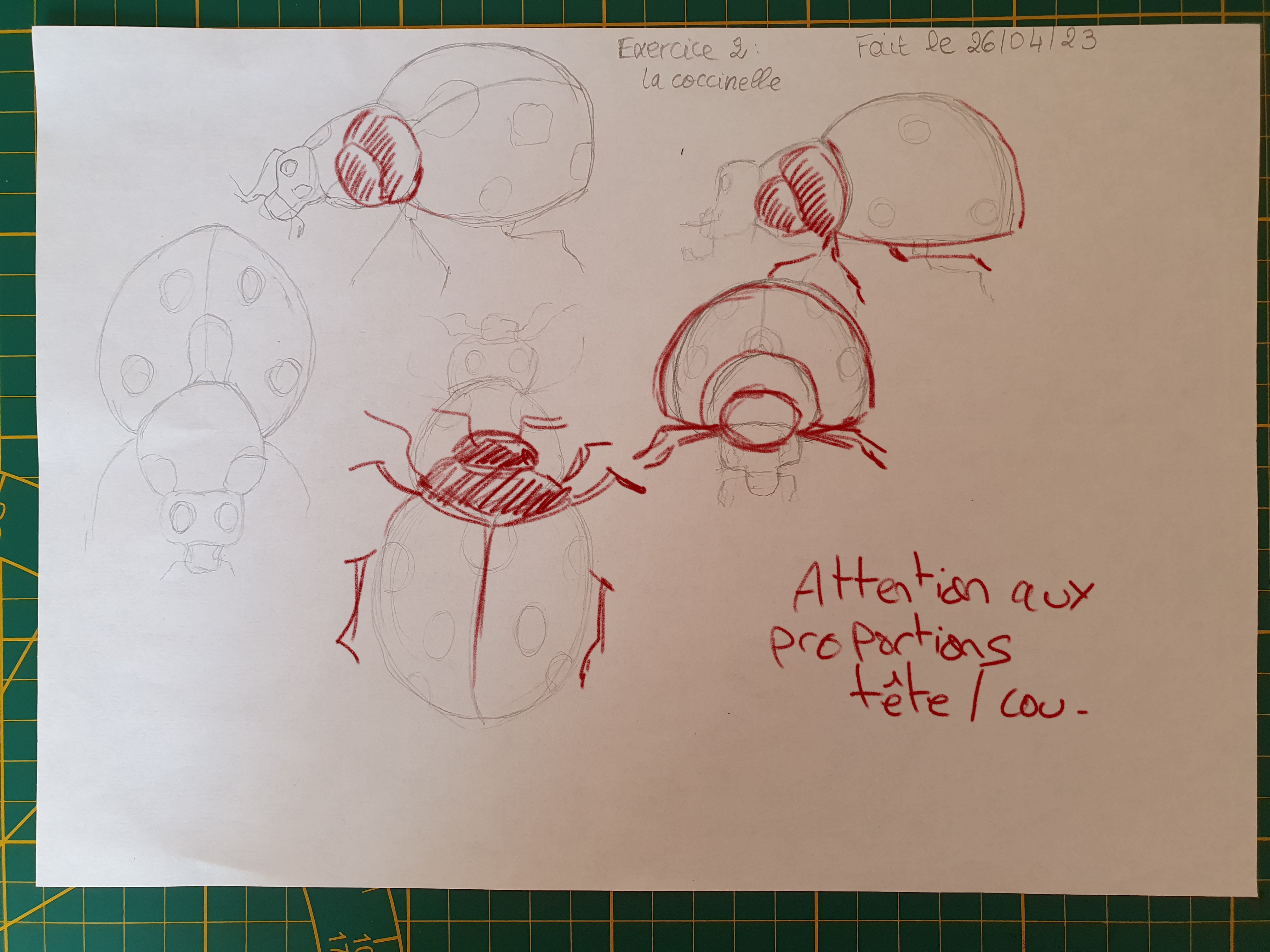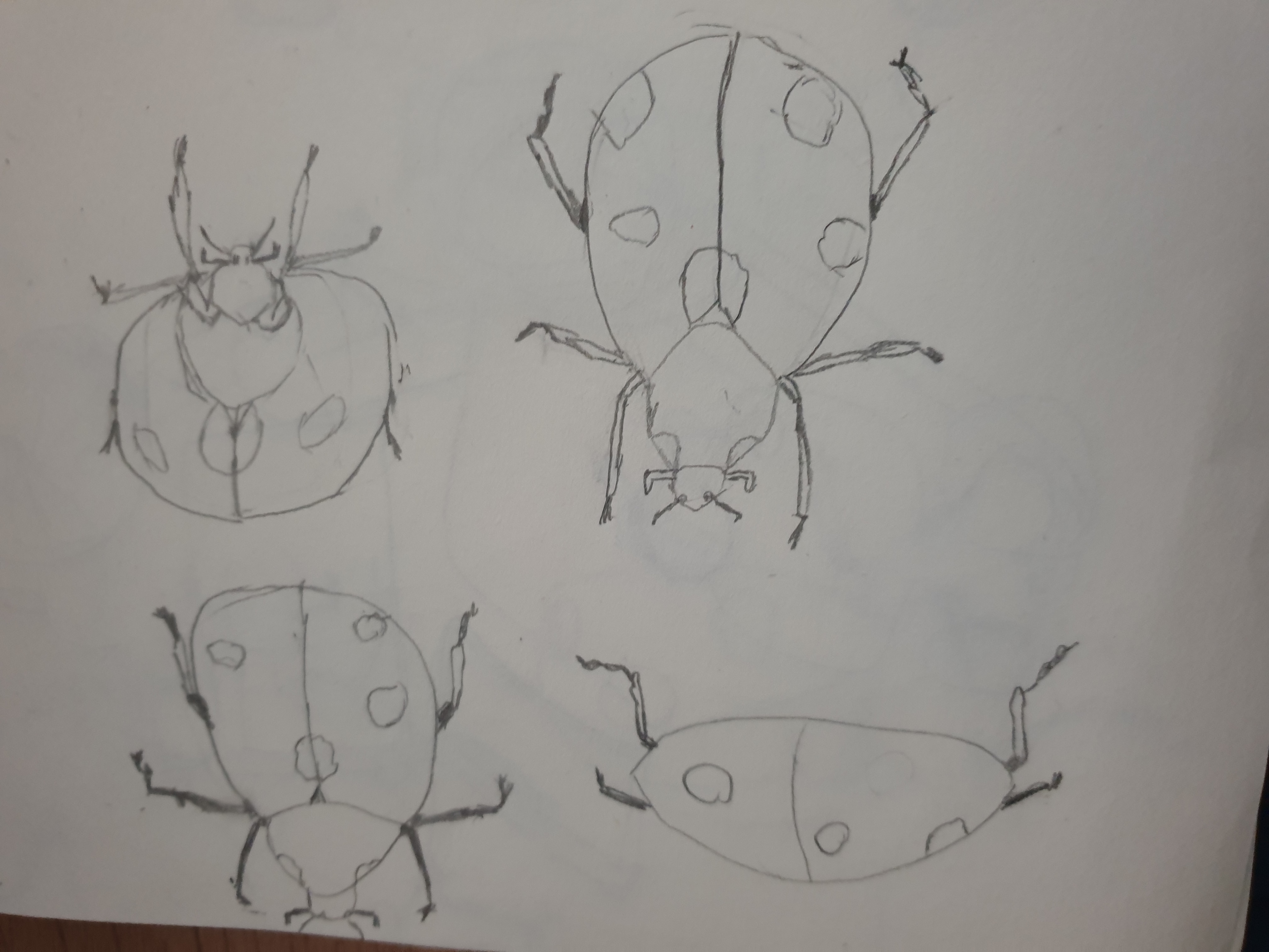 Fais attention au volume du corps de ta coccinelle, globalement, il devrait être plus gros, plus large sur les côtés, et plus bombé sur le dessus. Sur tes dessins, la partie tête a tendance à être trop grosse par rapport au corps, sur le premier dessin on peut même dire que la tête est prersqu'aussi grosse que le corps. Quand tu décomposes ton sujet, divise les différentes parties en essayant de respecter autant que possible leur forme et leur taille les unes par rapport aux autres.